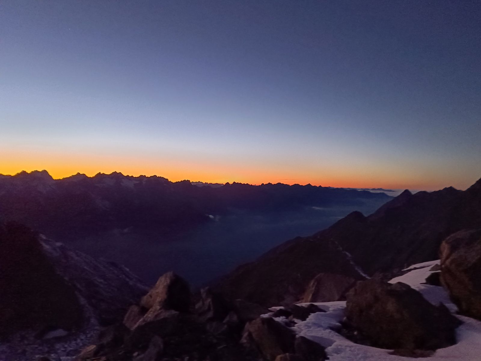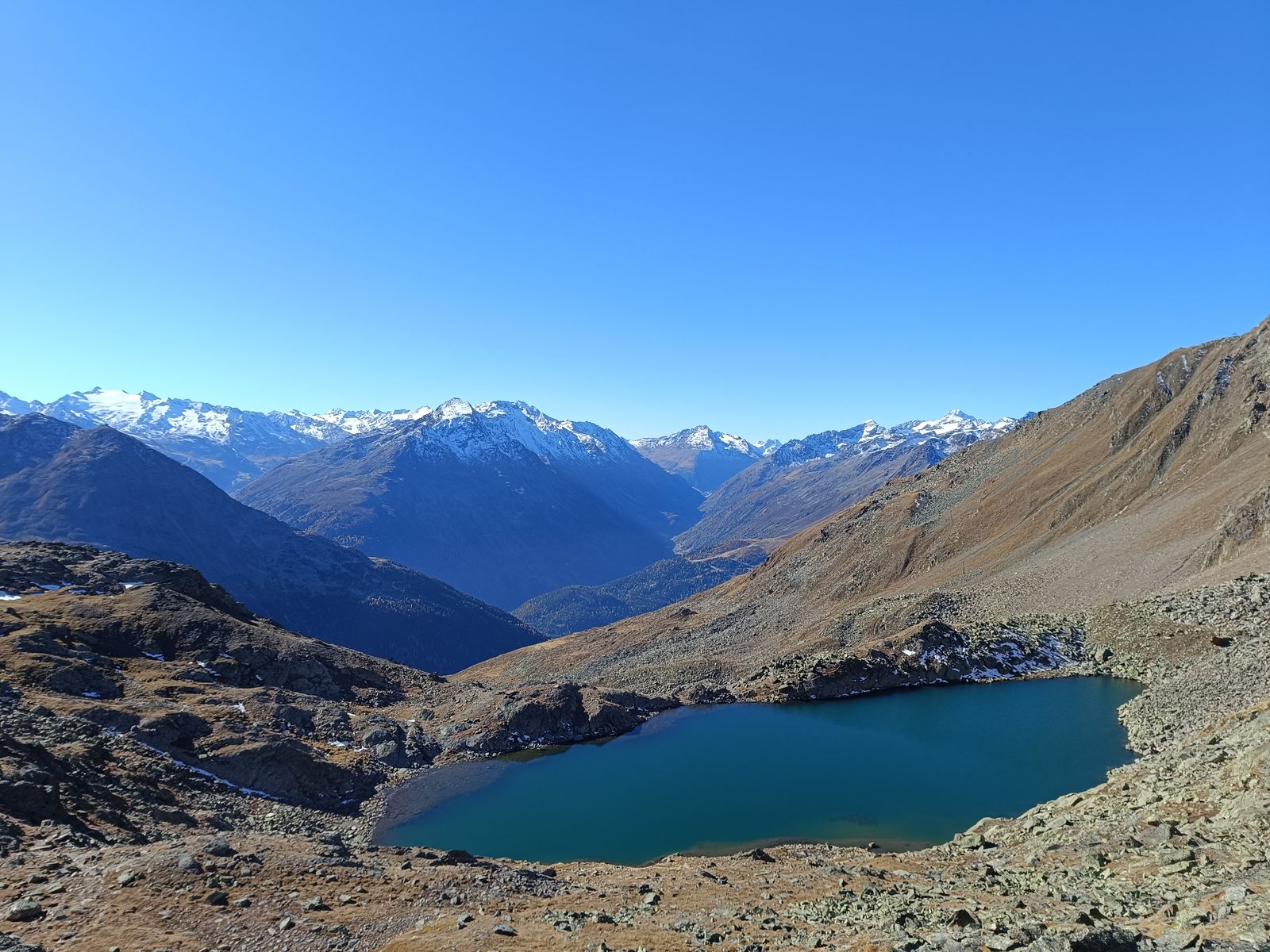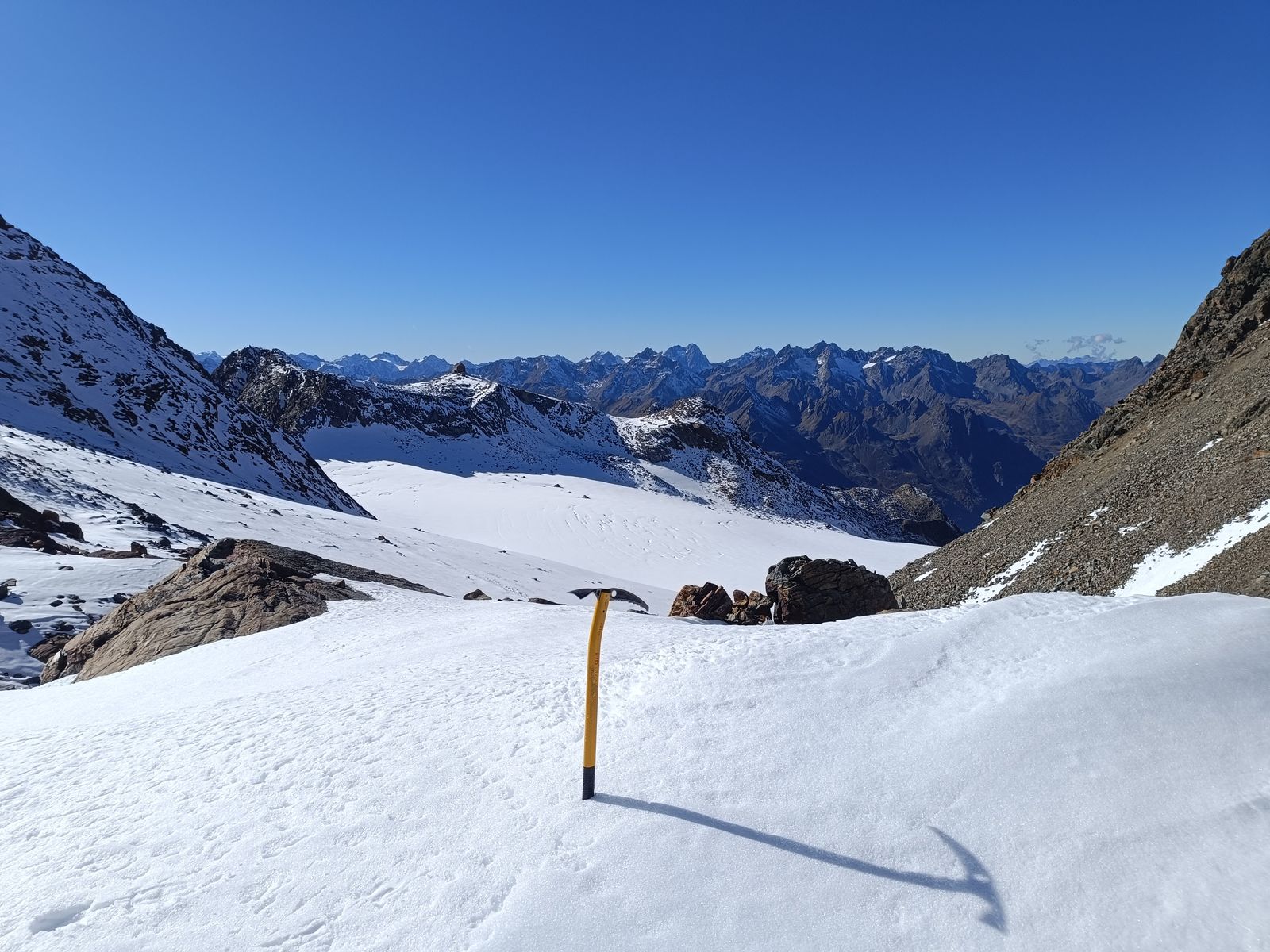 Anders als am Alpenrand hatte es inneralpin die ganze Woche schönes, nebelfreies Wetter, was dazu geführt hat, dass der Schnee sonnseitig bis 3400 Meter hinauf fast ganz weg ist. In Nordhängen liegt (sehr wenig) Schnee ab etwa 2700 Metern; geschlossene Schneedecke nur auf Gletschern.