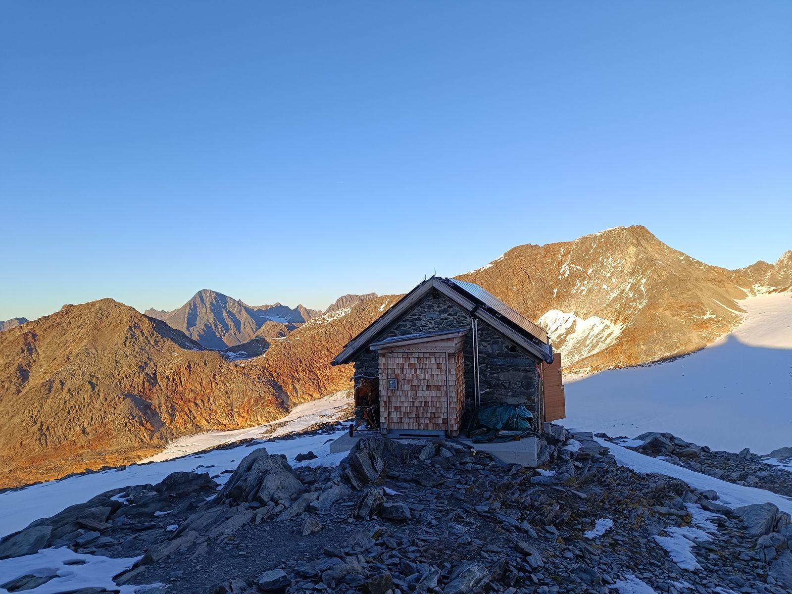 Route: Ich bin über die Kleblealm und das Laubkar zur Hochstubaihütte und hab dort mein Übernachtungszeug deponiert. Anschließend hinunter zum Wütekarferner , über diesen zur Warenkarscharte und auf den Windacher Daunkogel (nach dem Gletscher komplett schneefrei). Auf dem Gletscher liegen etwa 15 cm harschiger Schnee. Da man die (kleinen) Spalten momentan noch erkennen kann, hielt ich eine Solo-Begehung für vertretbar. Steigeisen wären nicht nötig gewesen, aber ich hatte sie eh dabei. Vom Daunkogel bin ich zurück in die Scharte und habe noch die Überschreitung der Warenkarseitenspitze (was für ein Sch...name für einen schönen Berg) versucht, wegen ungünstiger Schneeverhältnisse an der Schlüsselstelle (II, plattig) - Faulschnee mit einer dünnen Eisschicht drunter - abgebrochen. Wäre grundsätzlich aber eine Klasse-Tour, die ich auch schon mal beschrieben habe. Also ging es wieder über den Gletscher zurück zur Hütte, wo ich einen wunderschönen Abend verbracht habe: Großartiger Sonnenuntergang, herrliche Sternennacht ohne Lichtverschmutzung und das gemütliche Winterraum-Hütterl. Dieses ist perfekt ausgestattet und im Holzraum liegt Material für Jahre. Allerdings muss das großteils noch zersägt werden, weil es zu lang für den übrigens sehr potenten Ofen ist. Ich hab schon mal so viel Holz hergerichtet, dass es mindestens für die nächsten vier Besucher langt.