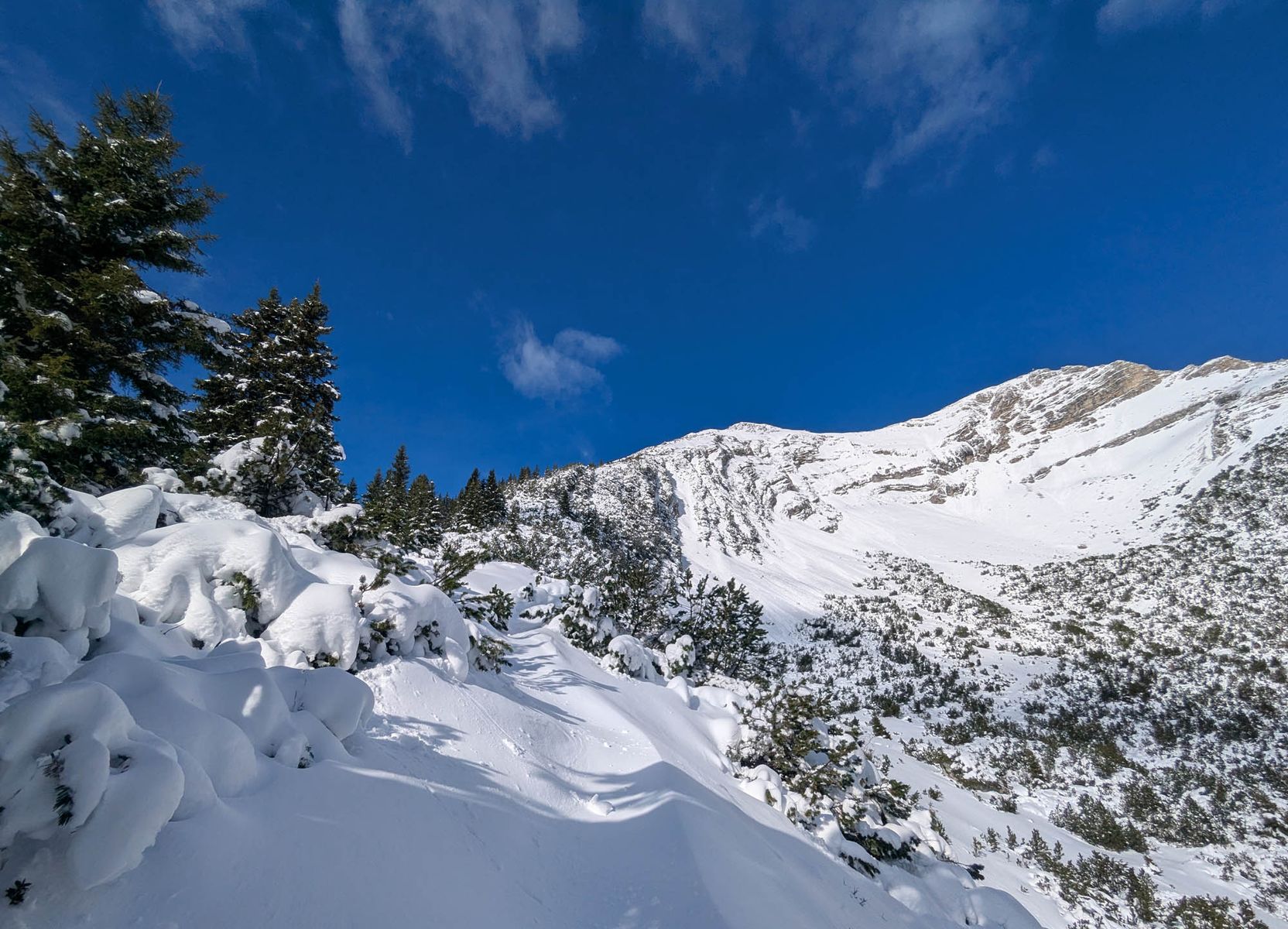 Schon auf der Lichtung vor der Tuftlalm lag auf 1380 m eine geschlossene Schneedecke von ca. 10 cm und nach der Alm wäre ich ohne Schneeschuhe nicht mehr besonders weit gekommen. Auf dem anschließenden Wald- und Latschenrücken lagen heute ca. 30 cm, in eingewehten Mulden auch deutlich mehr. Oberhalb der Latschenzone sind die Rücken wiederum weitgehend abgeblassen, da der Schnee mit viel Wind fiel … was eben die Triebschneelawinen-Gefahr deutlich erhöht.