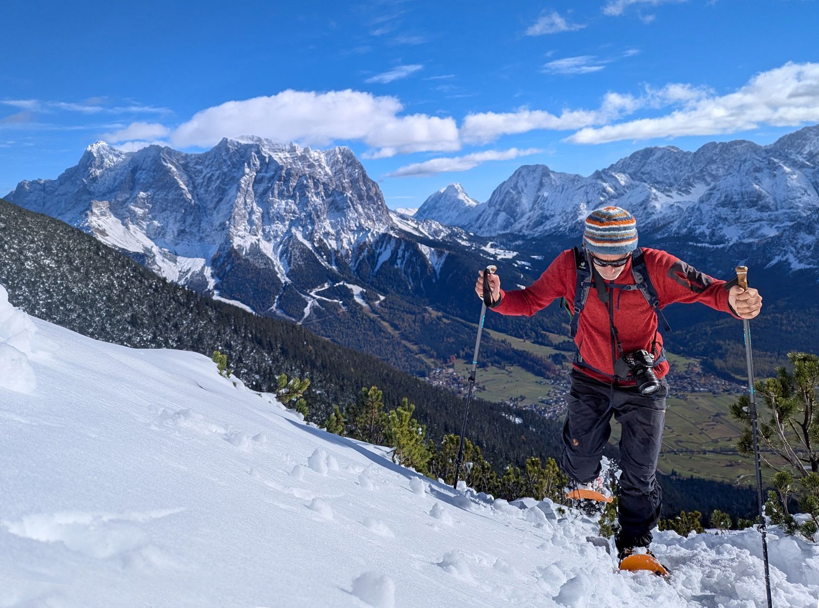 Wenn im Spätherbst Schnee in größeren Mengen gefallen ist und noch keine regelmäßigen Lageberichte (mit Ausnahme der Schweiz) verfügbar sind, muss man die Lawinengefahr gut im Hinterkopf haben. Das gilt umso mehr, wenn man (wie ich heute) mutterseelenalleine unterwegs ist. Deshalb habe ich heute 130 m unterhalb der Upsspitze (Ammergauer Alpen) auf den Schlussanstieg verzichtet. Denn der Weg quert zuletzt einen recht großen Osthang, der mir in Bezug auf die Triebschneegefahr nicht sicher vorkam.