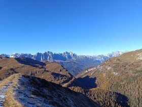 Anmerkung: Der Spätherbst ist die beste Zeit für die südlichsten Dolomiten-Gruppen, weil hier im Sommer oft der Dunst aus der Poebene hängt. Und auch wenn die Gipfelhöhen geringer sind als in den zentralen Dolomiten, ist der Höhenunterschied von den Ausgangspunkten oftmals größer als dort. Von meinem Schlafplatz zum Gipfel des Sass de Mura, dem höchsten Berg der Cimonega, sind es 2000 Hm!