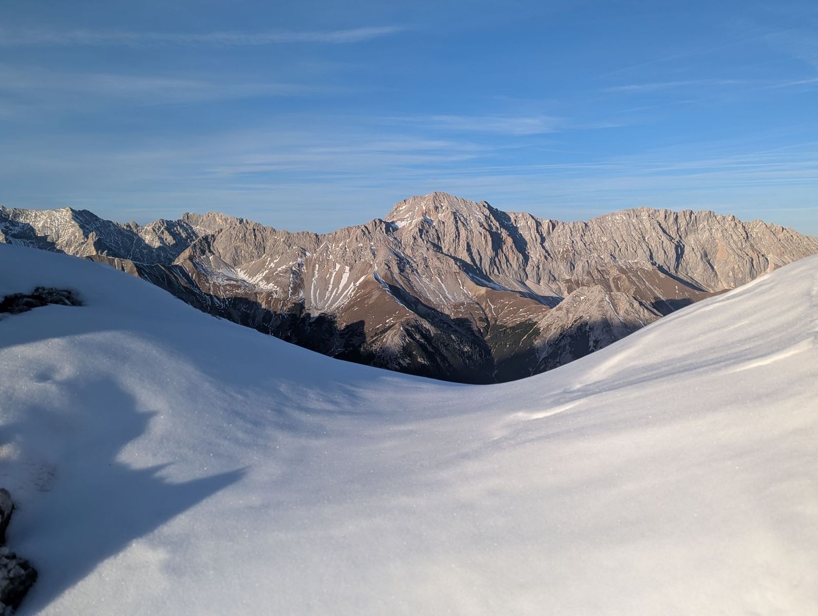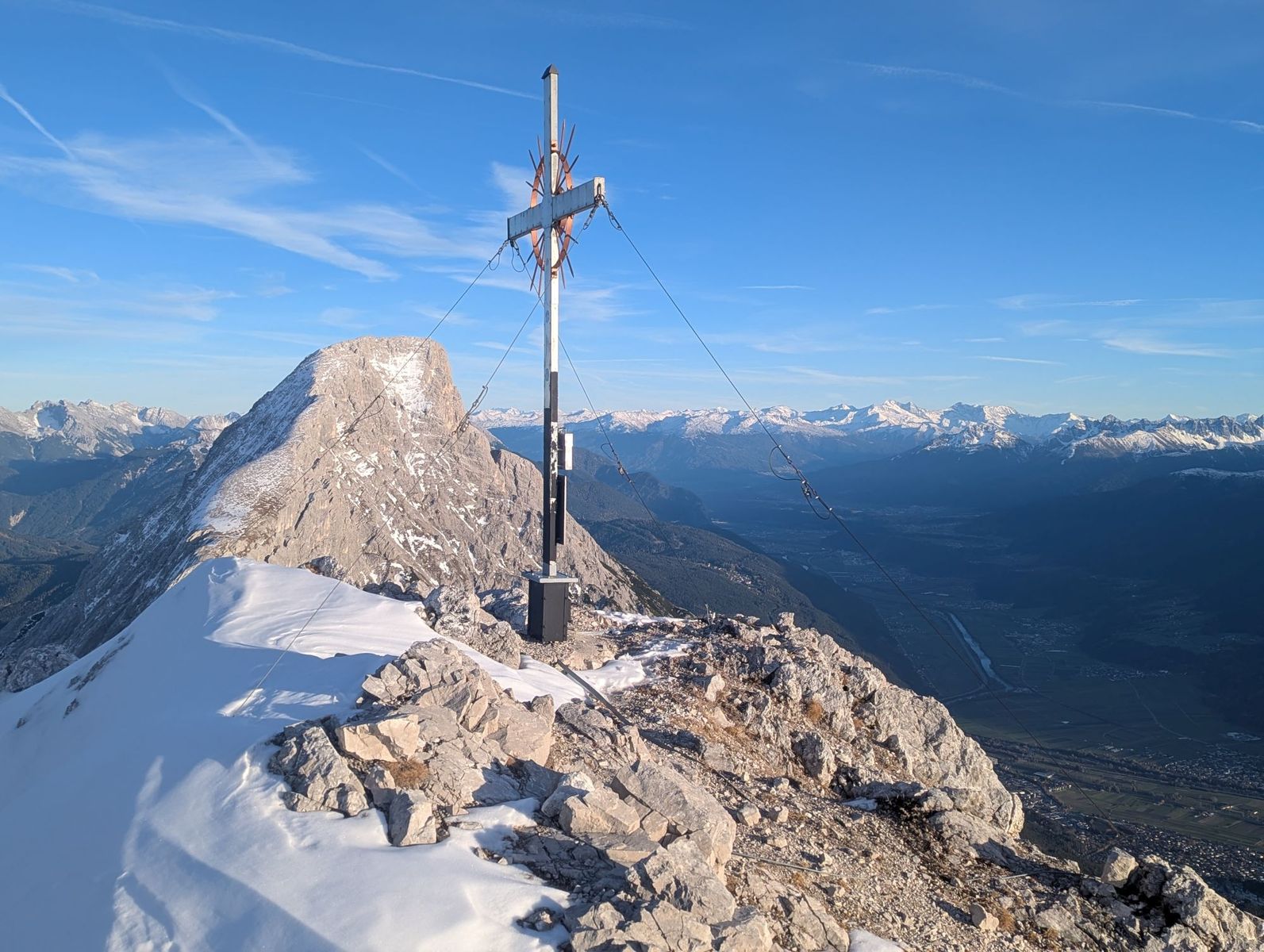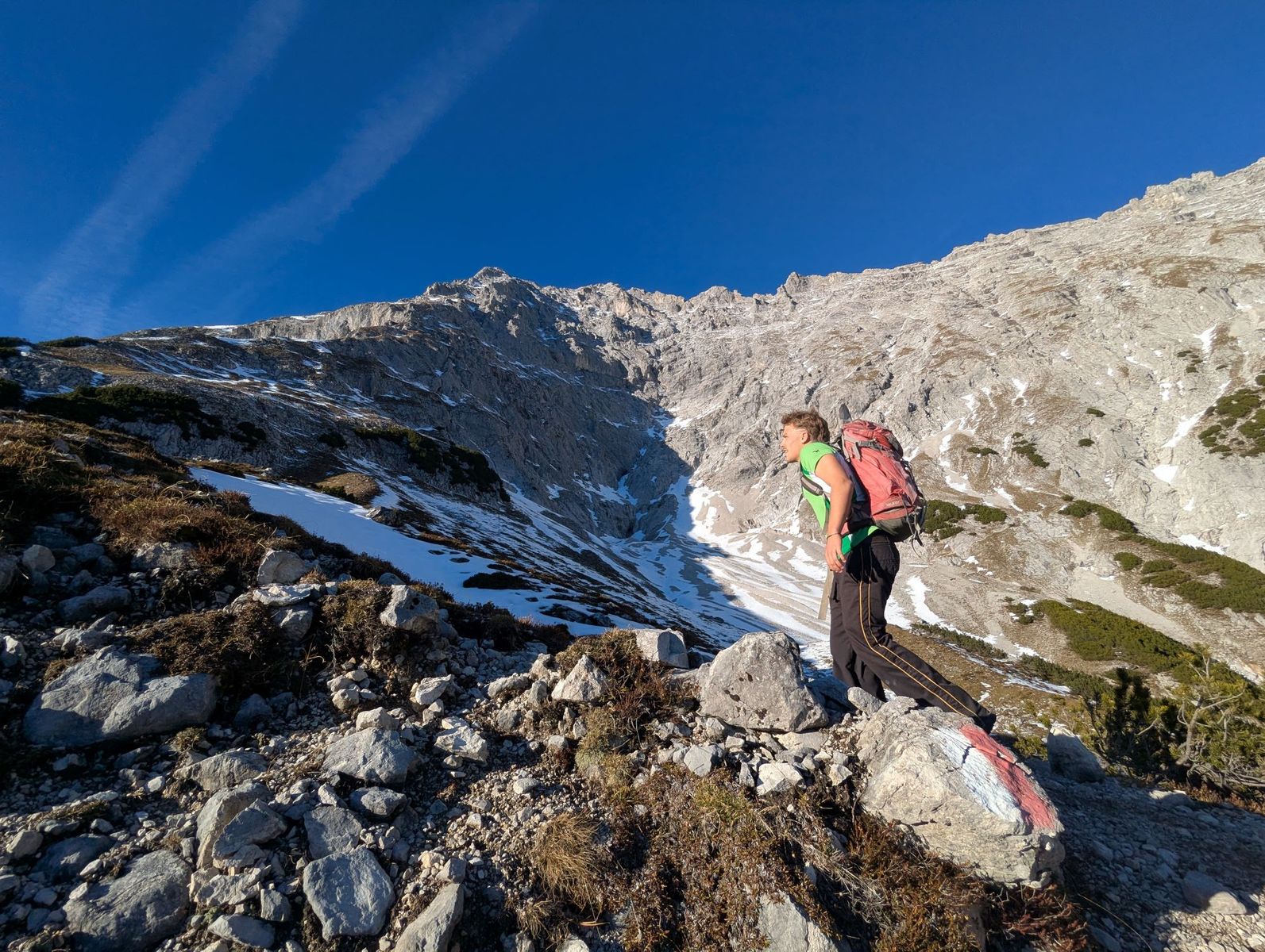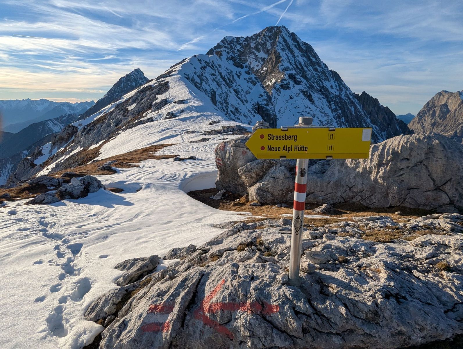 Der Weg war bis zum Wetterkreuz komplett schneefrei. Auch im weiteren Verlauf gab es nur zu etwa 15 % Schneekontakt. Bei den eher kurzen Schnee-Querungen lag bereits eine Aufstiegsspur vor.