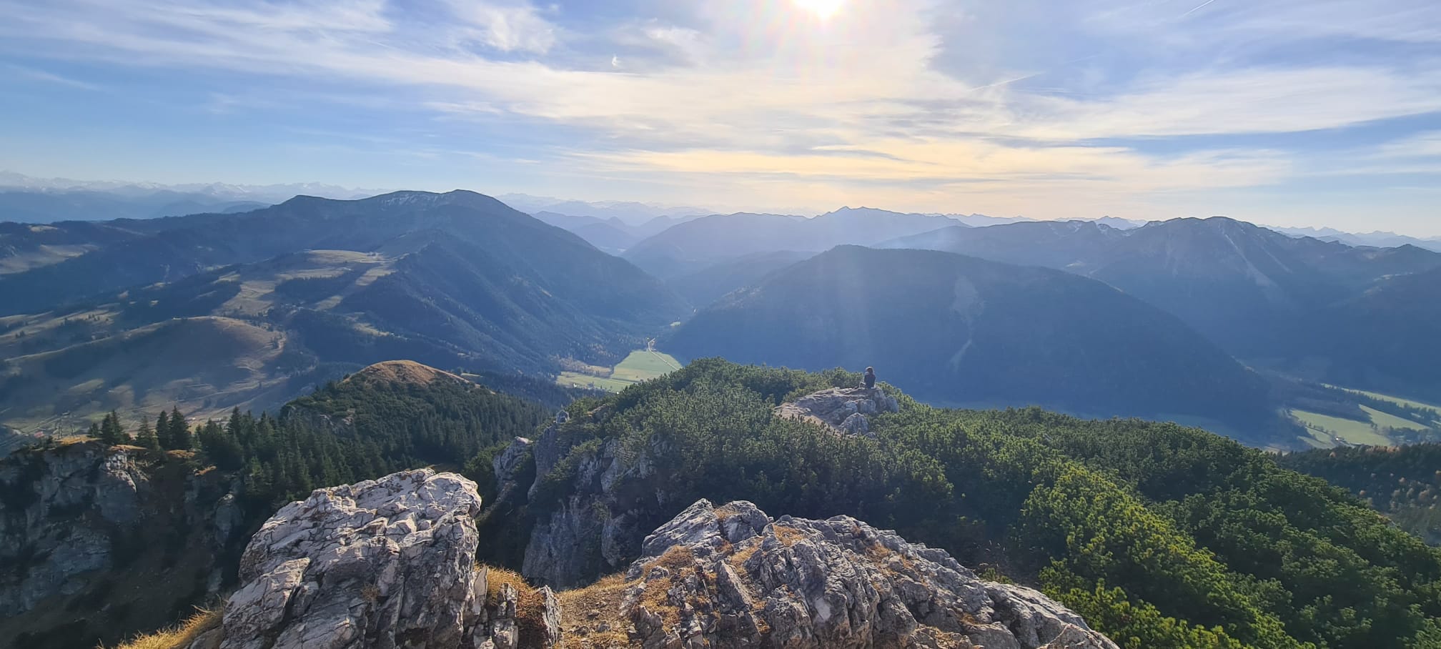 Bei idealem Schädelweh- und Wanderwetter. Sehr warm, und auch am Gipfel kein Wind.