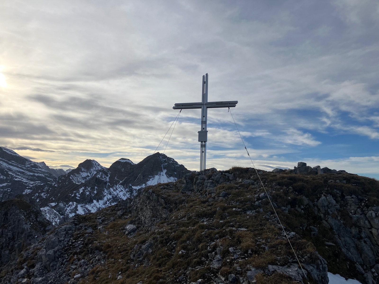 Aufgrund des Startpunkts ging es etwas schweißtreibend durch die sonnseitigen Hänge Richtung Gütenbergalm. Dann heißt es den unmarkierten Abzweig Richtung N-O-Grat des Falzthurnjochs zu finden - ich ließ mich von einer Markierung direkt bei der Wegverzweigung in die Latschen locken und kam erst etwas oben nach Latschenkampf auf den richtigen Steig. Anscheinend zweigt der Steig erst etwas nach der Wegverzweigung ab und hält sich zunächst in Aufstiegsrichtung rechts der Latschen. Hat man den Steig gefunden, gibt es zunächst keine Orientierungsprobleme mehr. Am Kamm angelangt, entschied ich mich gegen den weiteren Aufstieg am Grat und die in zahlreichen Berichten abschreckend beschriebene "Gruselquerung" unter den Felsen. Statt dessen habe ich die untere "Latschenumgehung" genommen. Welche erst einmal gefunden werden muss: Am besten orientiert man sich in Richtung des markanten Felsklotzes in der von unten sichtbaren Grasrinne. Der richtige Abzweig geht genau auf dessen Höhe und ziemlich in der Nähe von diesem weg. Die ersten Meter muss man dabei eine erdige Rinne ansteigen. Der in einigen Beschreibungen erwähnte "rote Punkt" ist am oberen Ende dieser Rinne, aber wenn man da ist, sieht man ohnehin schon die ausgeschnittene Latschengasse. Diese ist gut zu gehen. Nur am Ende kommt etwas unangenehmes Bröselgelände und kurz muss in diesem in einer Art Rinne (heute schneegefüllt) gekraxelt werden. Danach geht es im Wandermodus weiter zu den Schneeköpfen und dann zum Gipfelkreuz des Falzthurnjochs mit dem 2017 durch den Hockeyclub Pertisau errichteten Gipfelkreuz - dessen Mitglieder müssen sich anscheinend nicht nur auf dem Hockeyfeld bzw. dem Eis sicher bewegen, sondern auch im bröseligen Schrofengelände, wenn sie auf die Idee gekommen sind, dort ein Gipfelkreuz zu errichten.