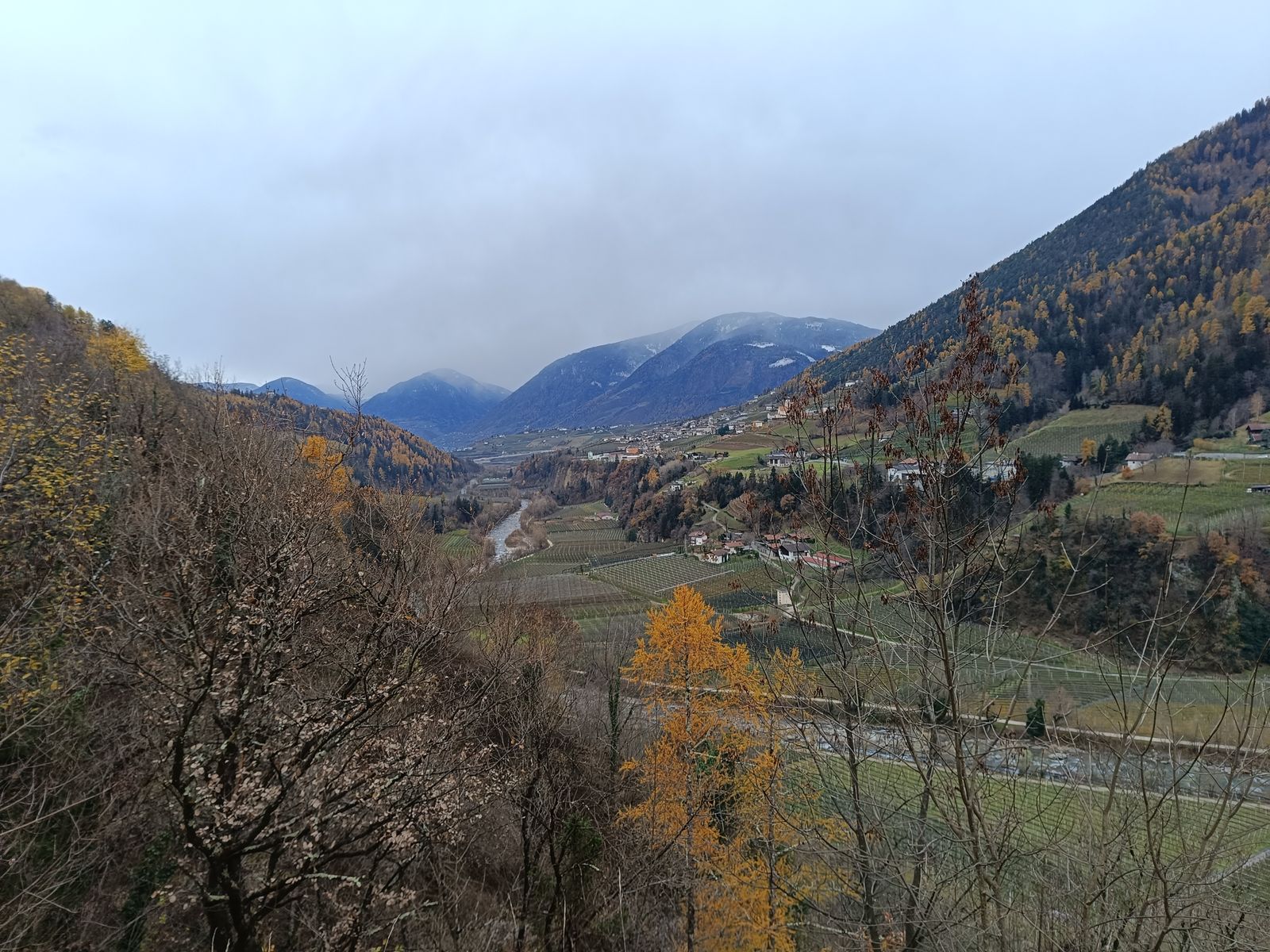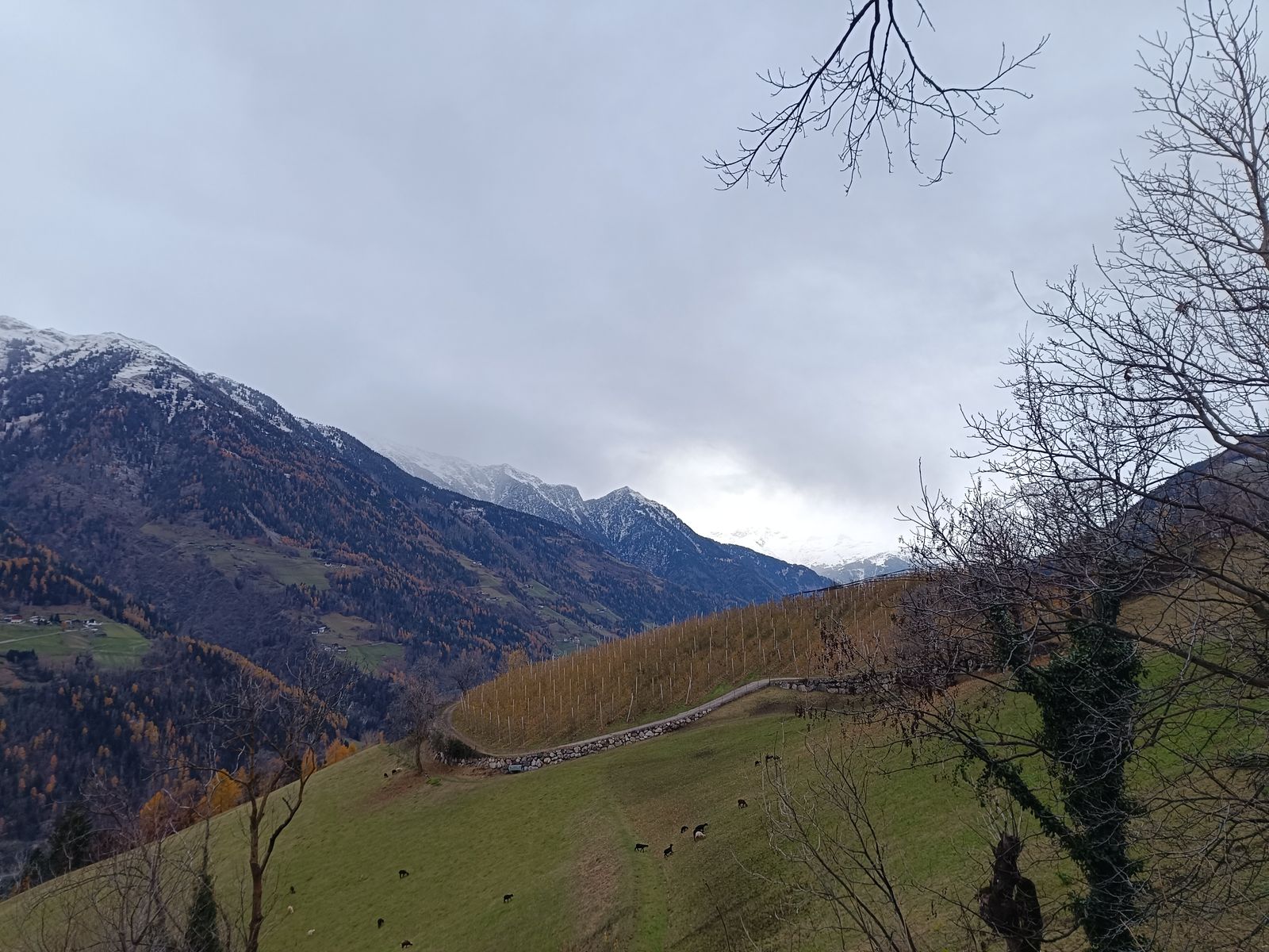 Schnee liegt um Meran erst ab 1000 Meter und auch weit oben nur wenig. In den Dolomiten hat es ein bisserl mehr geschneit, aber für Skitouren reicht das m.E. noch nicht - mehr dazu dann morgen... Das Wetter war gestern bewölkt, aber trocken und es ist (auch heute) deutlich wärmer als nördlich des Hauptkamms.