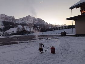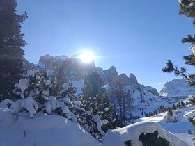 Schneelage: In den Dolomiten liegen etwa 10-20cm Schnee - heute auch südseitig noch sehr fluffig. Skitouren abseits der Pisten, wo momentan die Schneekanonen laufen (Saisonstart voraussichtlich 3. Dezember), machen wenig Sinn. Für Schneeschuhe bräuchte es auch 20cm mehr Schnee. Heute haben wir gar keine spezielle Ausrüstung benötigt.