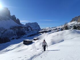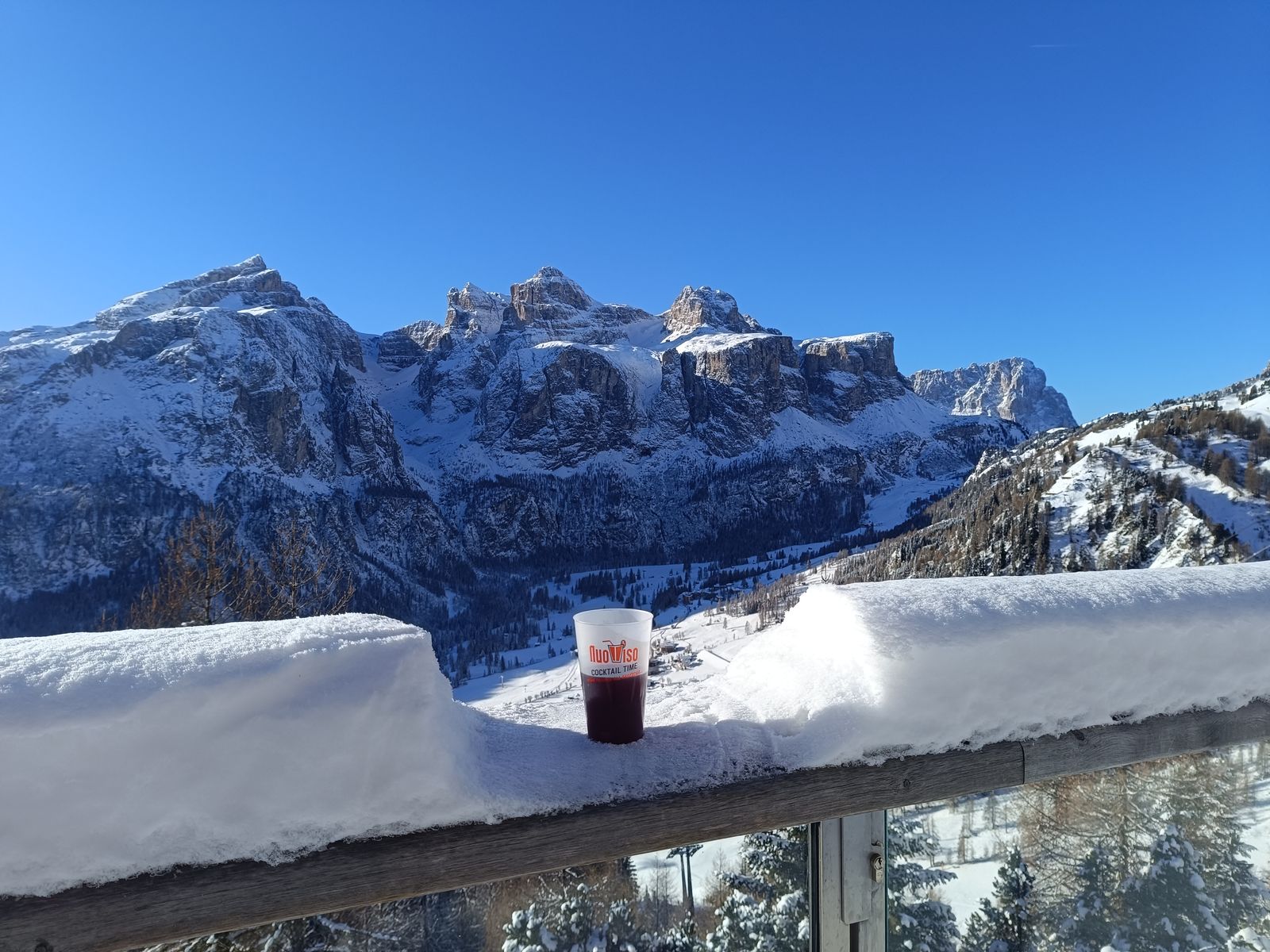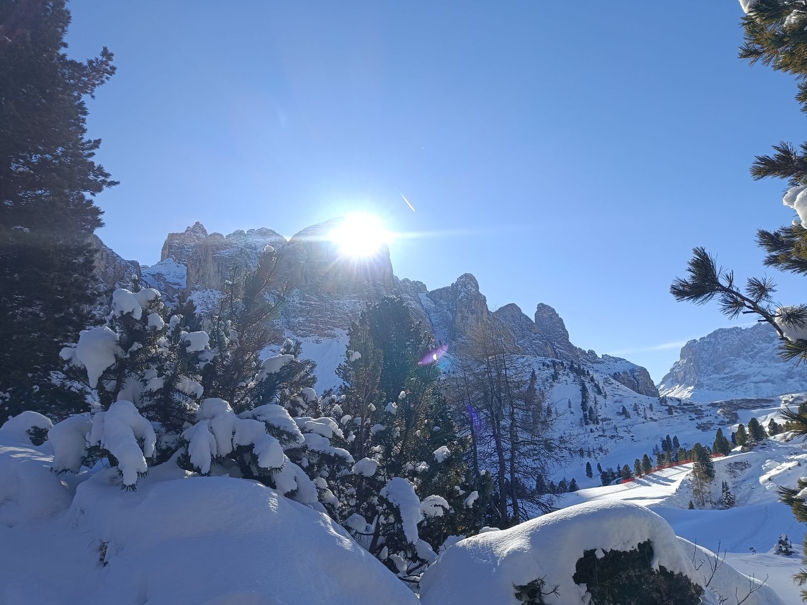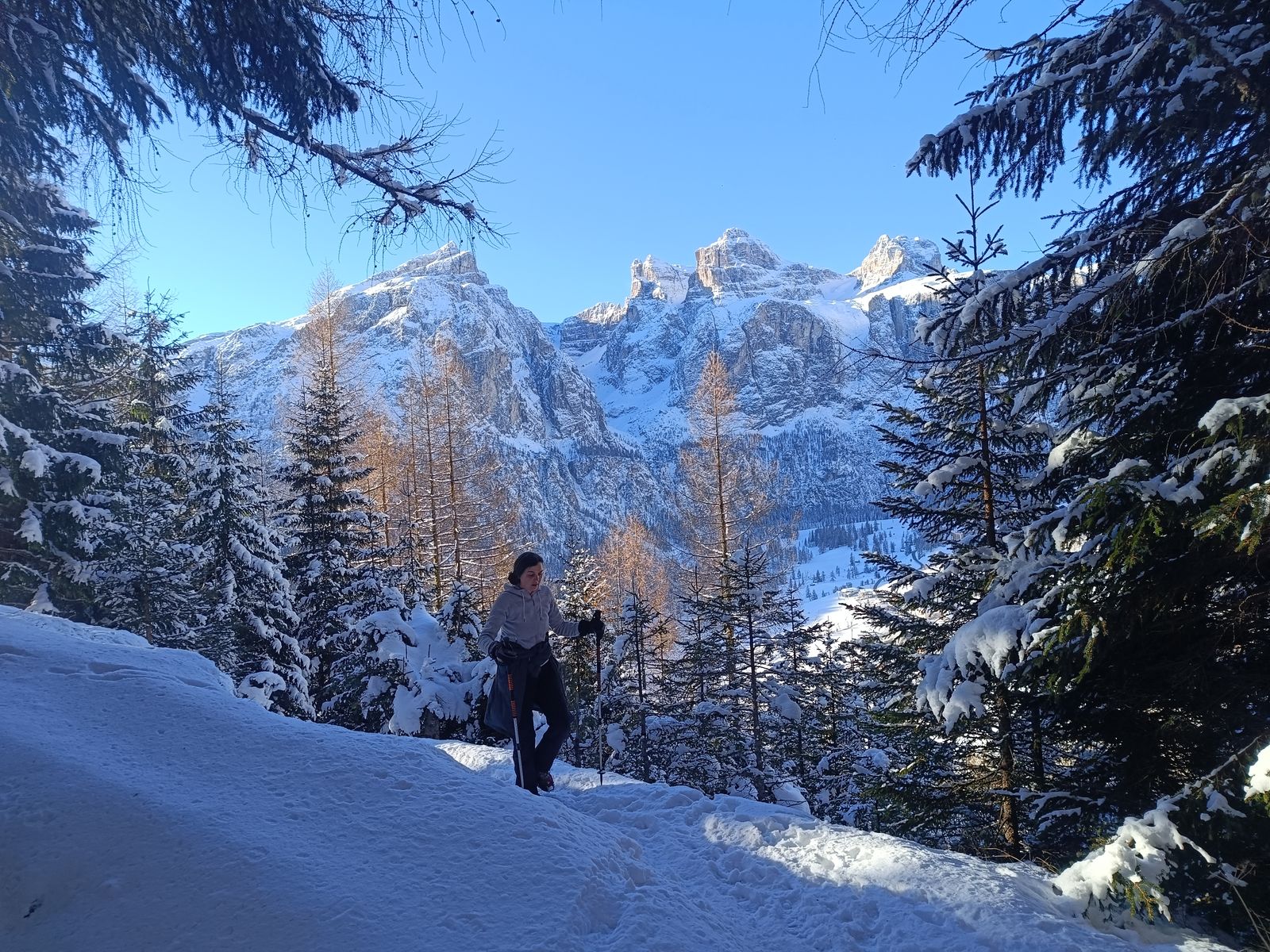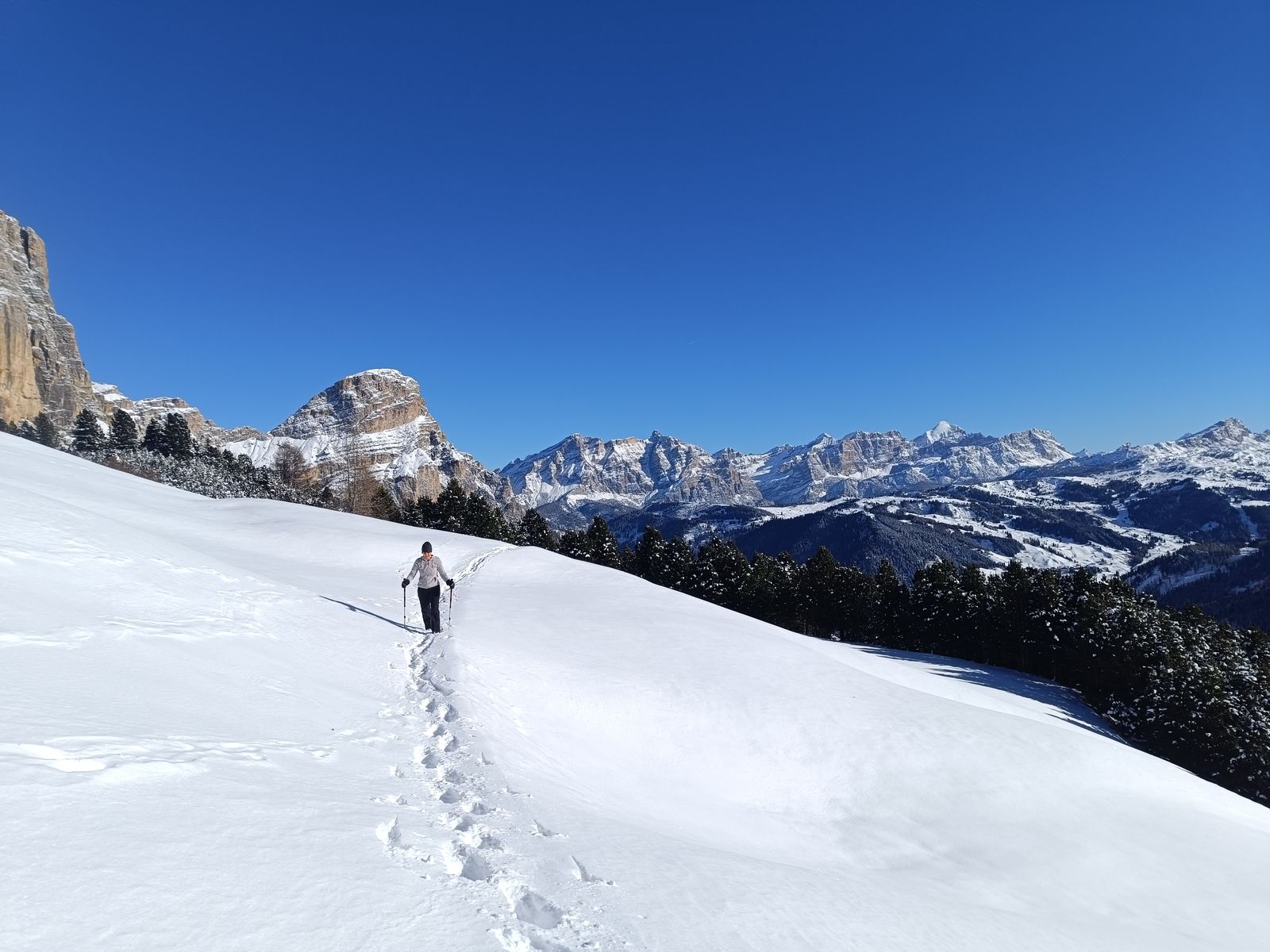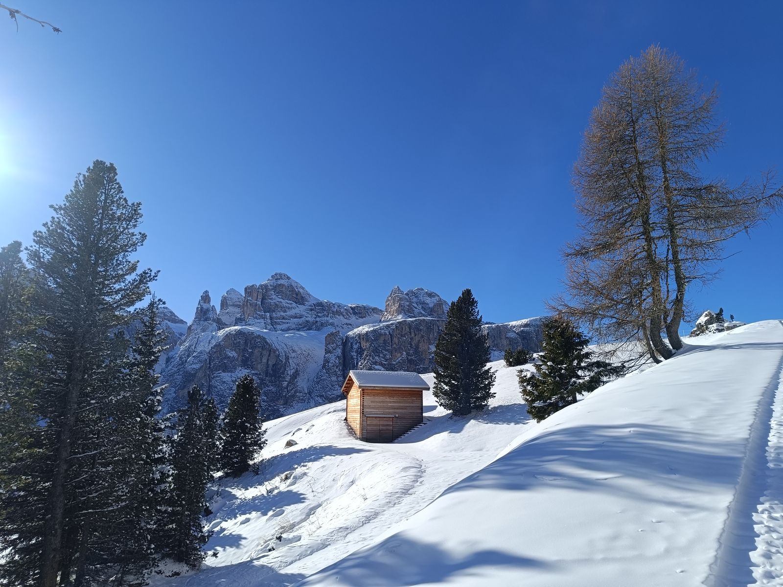 Der Kolfuschger Höhenweg ist für mich so ein Paradebeispiel dafür, wie wichtig der richtige Zeitpunkt für ein außergewöhnliches Bergerlebnis ist. Die Tour ist ja wirklich einfach und zurecht sehr beliebt, sodass sich im Sommer die Leute fast über den Haufen rennen - heute war aber außer uns niemand unterwegs. Dazu Traumwetter und genau die richtige Menge Schnee, damit es schön winterlich ist, man aber noch gut ohne Schneeschuhe oder Ski gehen kann. Die Tour ist landschaftlich extrem schön und das Panorama umfasst die gesamte Dolomiten-Prominenz (Tofane, Antelao, Pelmo, Civetta, Marmolada, Sella, Langkofel).
