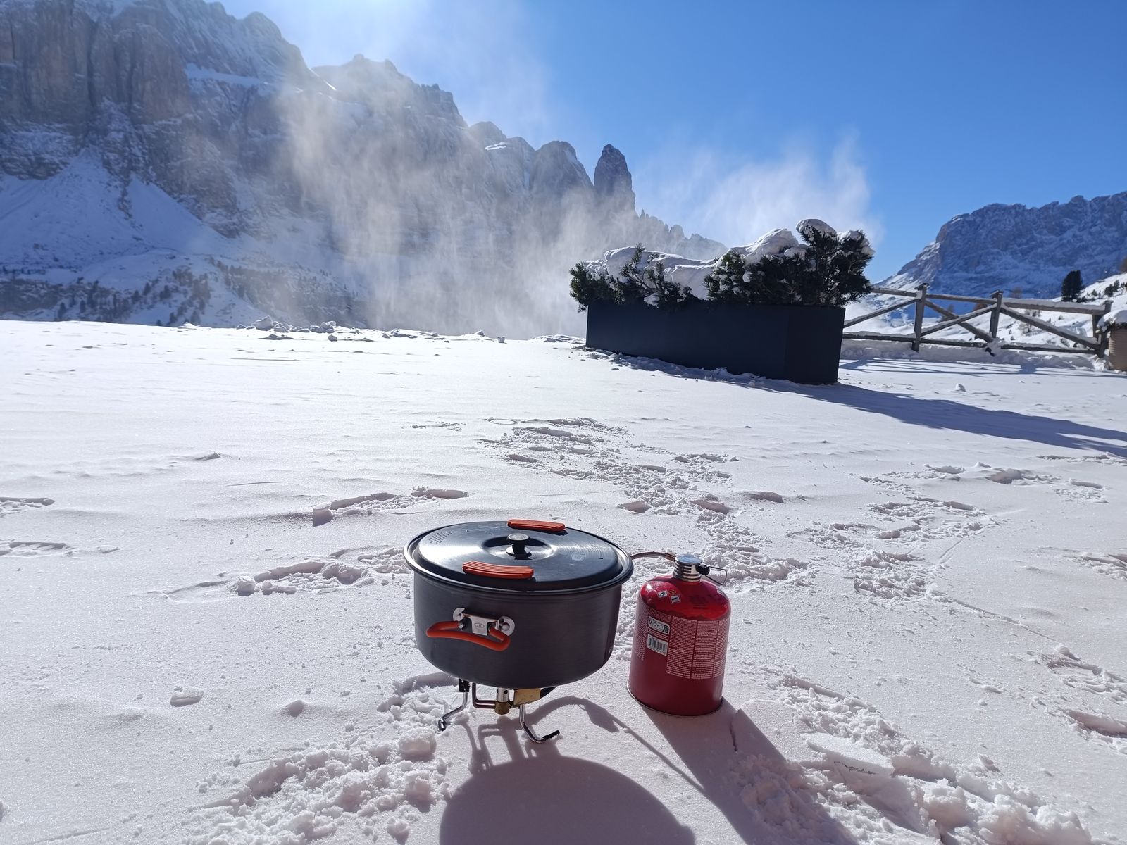 Trotz der wirklich niedrigen Temperaturen haben wir im Auto übernachtet - am Freitag bei Meran und nach einem Saunatag in Brixen gestern diese Nacht im Gadertal (nicht direkt in Kolfuschg). Ich möchte schon betonen, dass es ein sehr großes Glück ist, mit Daniela eine Partnerin zu haben, die auch bei minus 15 (Temperatur heute morgen in Alta Badia) ohne Heizung gerne mit mir im Auto übernachtet! Gute Schlafsäcke sind da freilich Pflicht.