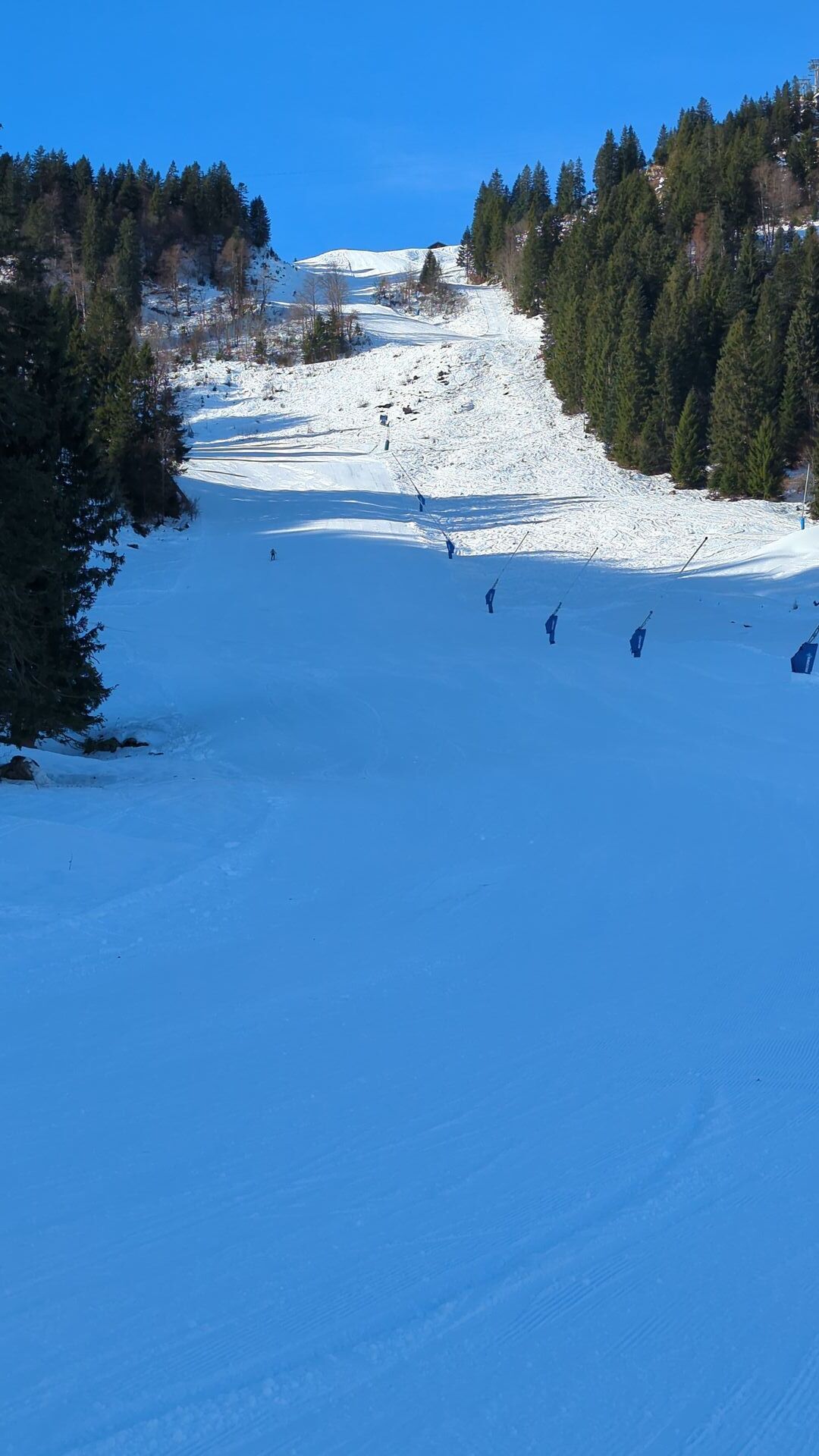Die Unterlage ist schon hart zum Aufsteigen. Harscheisen sind aber nicht zwingend notwendig. Familienabfahrt, Ahornabfahrt bis Bergstation (Lifte sind ja noch zu). Oben tolle Fernsicht, mild. ![]()