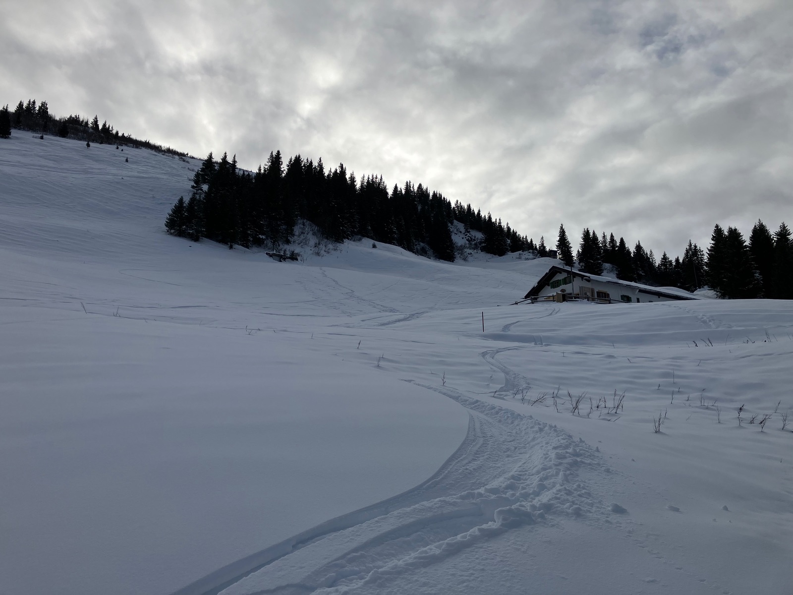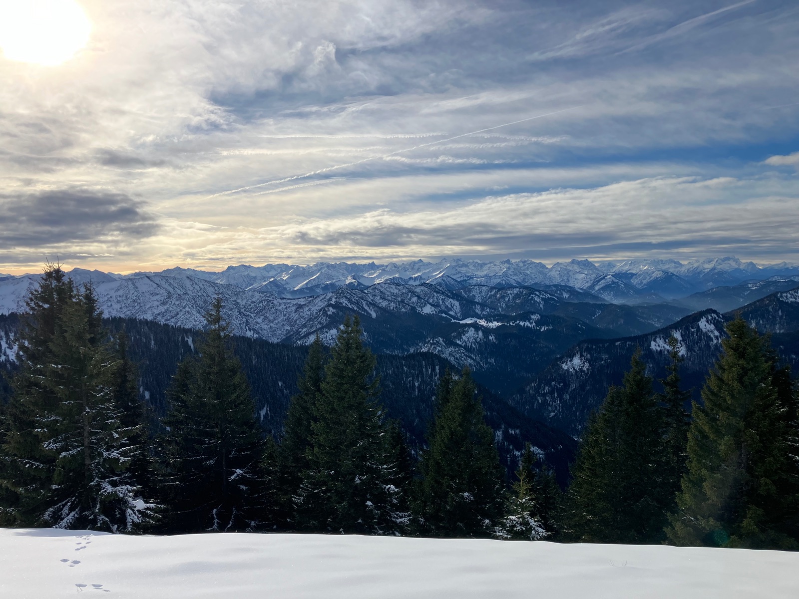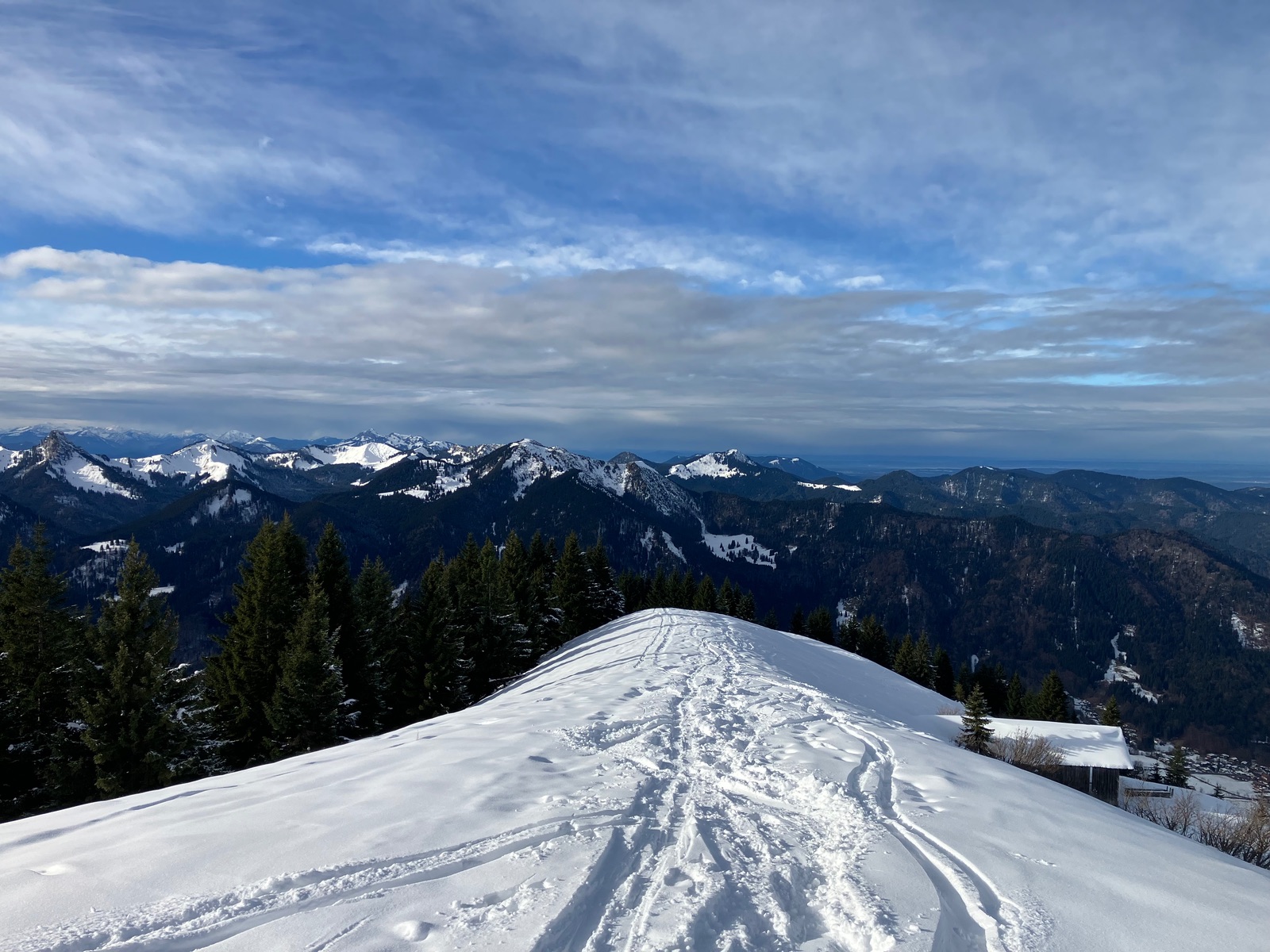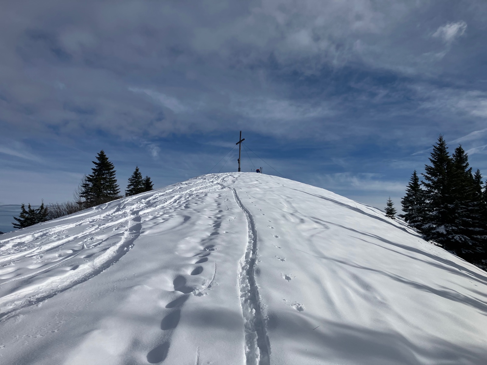 Dafür gab es am Gipfel noch Sonne und eine schöne Aussicht, wobei die aufziehende Schlechtwetterfront schon zu sehen war. Abfahrt oben pulvrig auf alten Spuren, dann der Rodelweg ganz gut machbar und unten "Eislauf". Mir kamen beim Aufstieg fünf Rodler entgegen und sogar zwei Radler (Eis-Abfahrtstraining?), aber angesichts des Eises unten rate ich deutlich von beidem ab. Bei geöffneter Rodelbahn sollte man nicht auf der Mautstraße = Rodelbahn aufsteigen, aber bis dass der Fall ist, müsste es noch ordentlich schneien. Heute war ich für den unteren Teil um die alten Skier froh und auch, wieder heil unten angekommen zu sein.