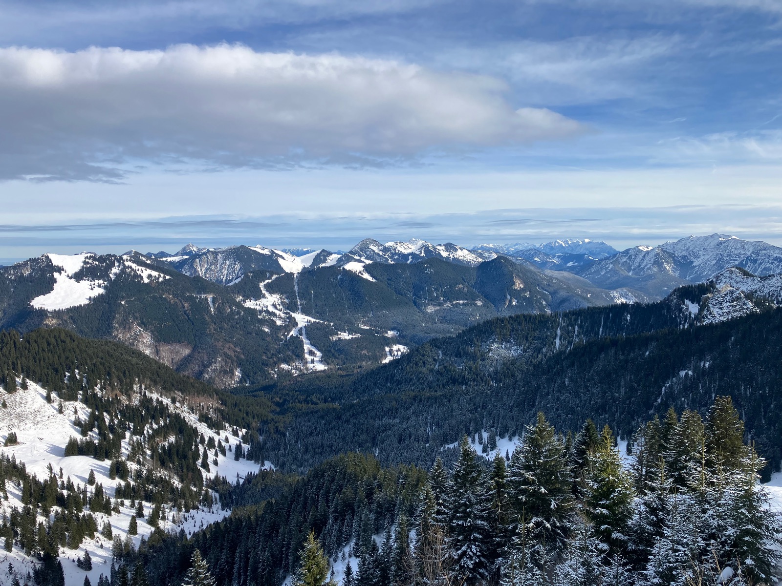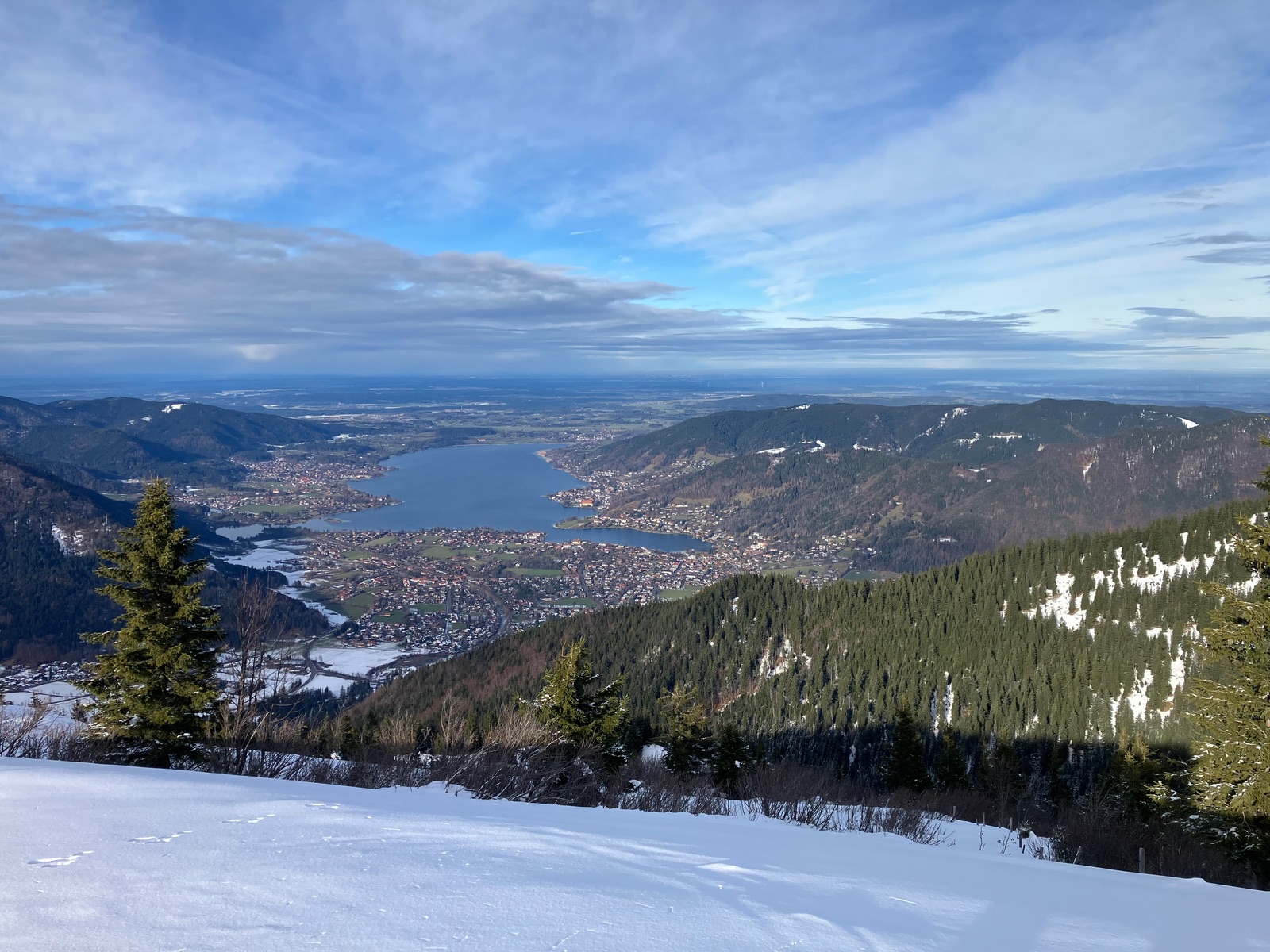 Heute habe ich vor dem angekündigten Tauwetter und Regen noch einen Versuch auf den Setzberg von der Wallbergbahn-Talstation aus gewagt. Kurz gefasst: Es liegt unten auf der Mautstraße meistens nur eine sehr dünne Eis-/Schneedecke, die auch schon kurze Lücken hat. Abgesehen von einigen wenigen freien Stellen, wo mehr Schnee liegt, steigt die Schneedecke eigentlich erst ab dem Wallbergmoos auf ein zwar auch noch eher geringes, aber zumindest nach Skitour ausschauendes Maß an. Und sobald man aus dem Wald kommt - also erst so auf ca. 1.400 m - liegt deutlich mehr Schnee und hier schaut es dann auch richtig nach Winter und Skitour aus.