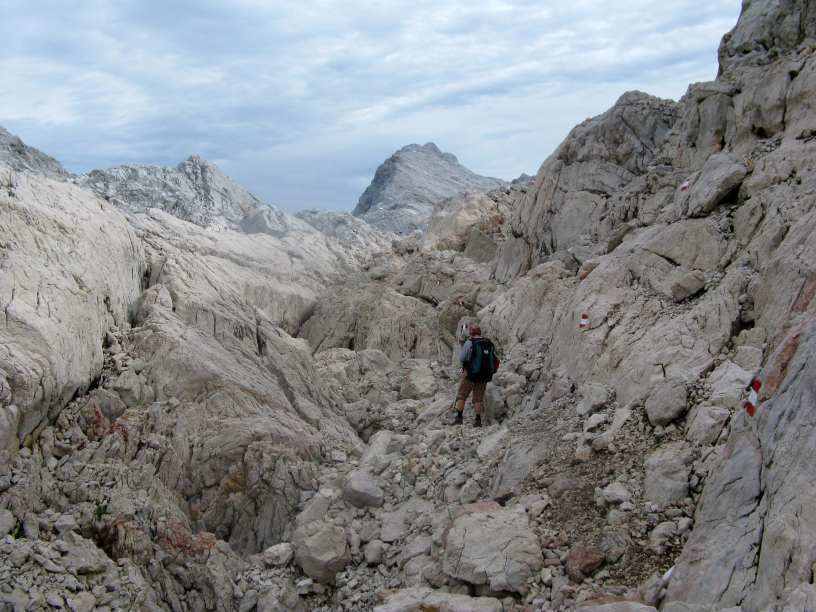 Gefahreneinschätzung: Im Abschnitt Pühringer-Prielhaus (dort ist das Gebirge am totesten) verwandelt sich der "Weg" stellenweise in ein Steinblockchaos. Nicht zwischen 2 Blöcke treten: Schuhverlustgefahr - Barfußgeher (gesehen) ausgenommen. Offene Frage: wieviel von der an sich dichten Steinblockmarkierung nach einem Neuschneefall noch zu sehen ist. KEINE HANDY-VERBINDUNG über längere Wegabschnitte, selbst bei den Hütten Verbindung nur an bestimmten Stellen (fragen!).