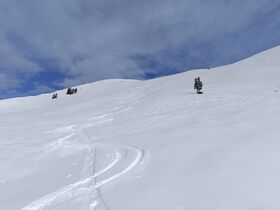 Ich bin über die Nordroute aufgestiegen, also über die Baumgartenalm. Die Spur tangiert diese aber momentan nicht, sondern hält sich landschaftlich attraktiv an den Kamm rechts der Alm. Am Gipfel entschied ich mich, zunächst die Westhänge zur Feldalm (1800m) abzufahren, da die Ostabfahrt, obwohl bereits gemacht und grundsätzlich sehr attraktiv, mir zu steinig erschien. Ich habe bei der Abfahrt darauf geachtet, Hänge/Mulden zu fahren, die nordwest-exponiert sind, da es hier genialen, tiefen Pulver hat. Sobald die Hänge in der letzten Woche nämlich Sonne hatten (also Richtung Westen/Südwesten), ist unter dem Pulver unangenehmer Harsch. Von oben kommend sieht man aber nicht, wo man hinfährt - also war der feine Schnee nur mit sehr guter Ortskenntnis zu finden.