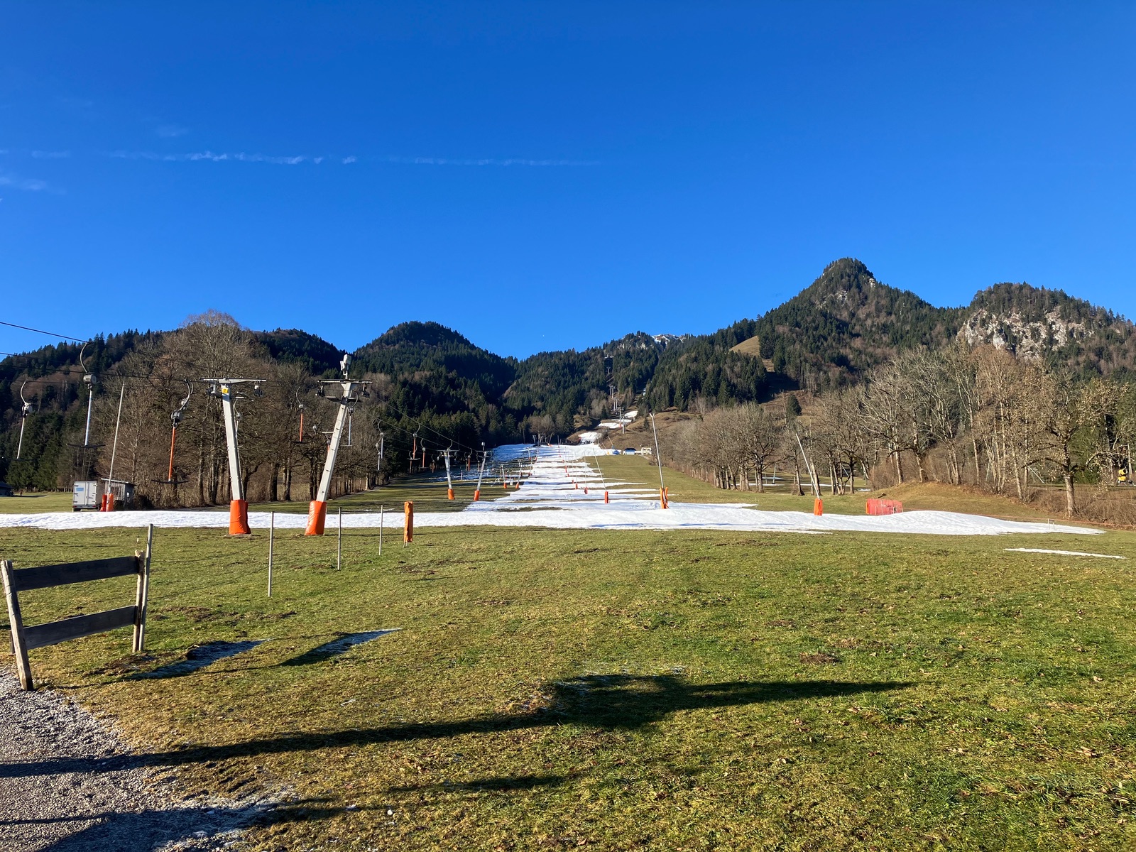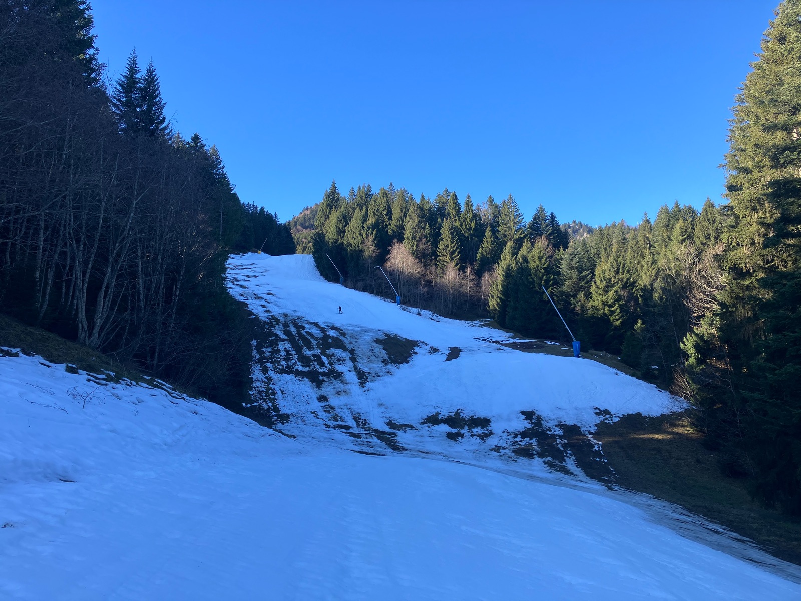 Auf der Familienabfahrt auch weiter oben noch (kurze) schneearme Stellen: