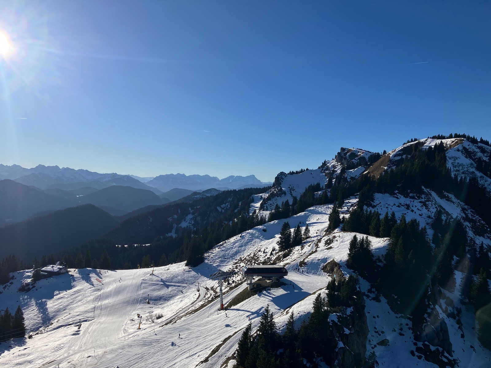 Nach Zwischenabfahrt von der Bergstation bis zur Kotalm wieder hoch, wobei man für einen Gipfelanstieg mit Skiern (auf dem Schattenhang zwischen Schrödelstein und Brauneck) schon "hart im Nehmen" sein muss. Wetter sehr sonnig und extrem warm (heute waren auch welche kurzärmelig unterwegs), sehr gute Fernsicht. Es fühlte sich eher wie April an, nur die Schneemenge in der Höhe ist nicht dementsprechend.