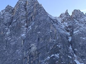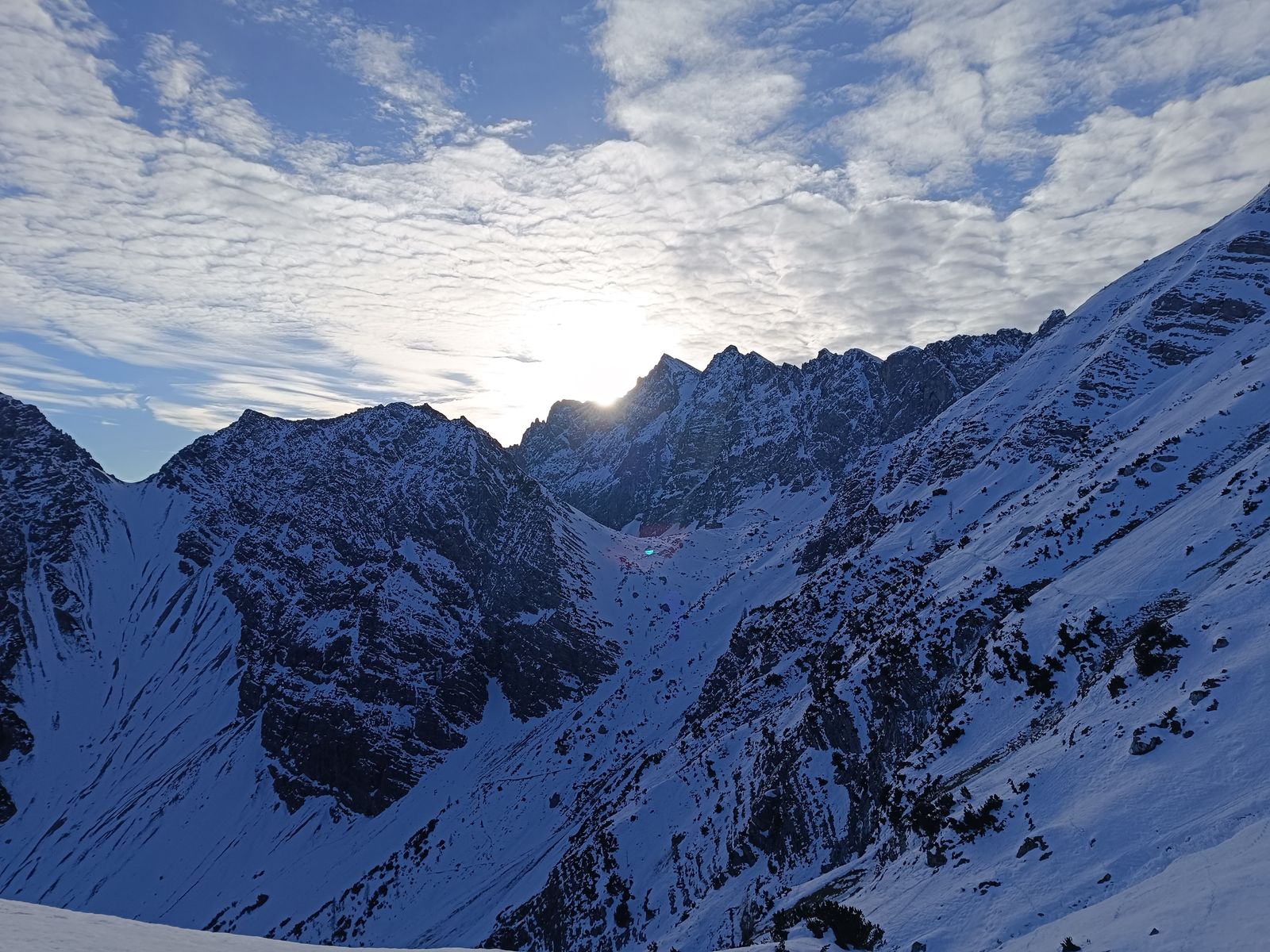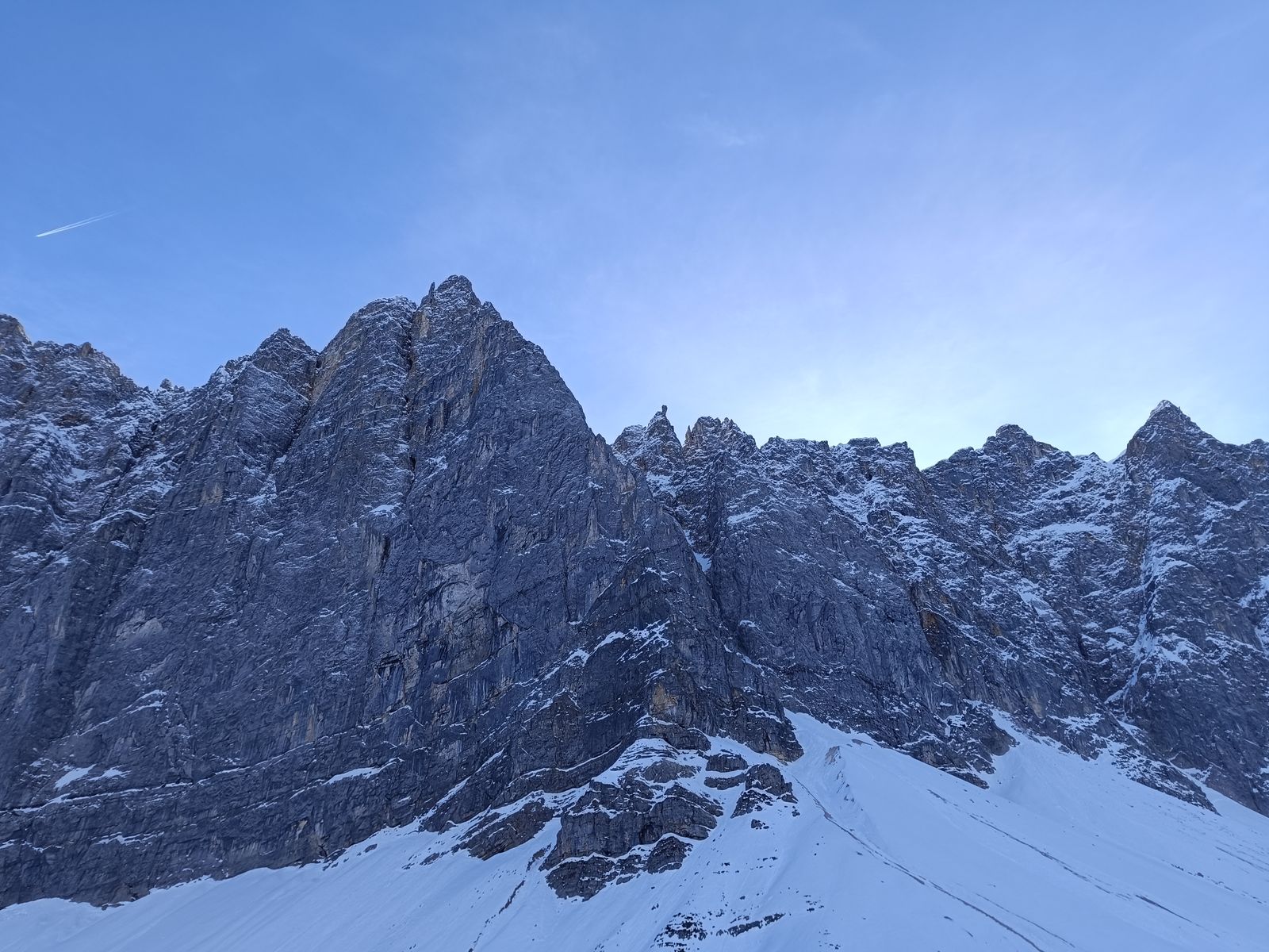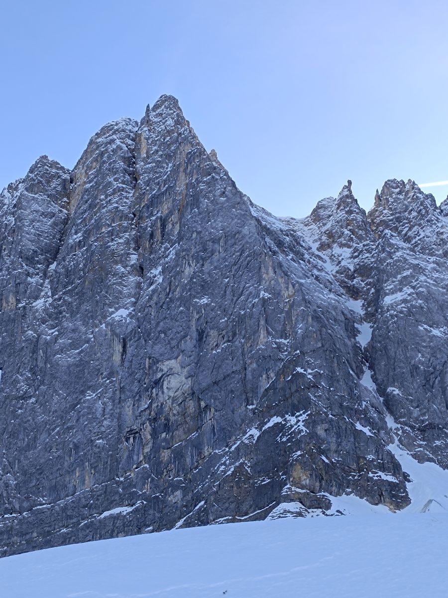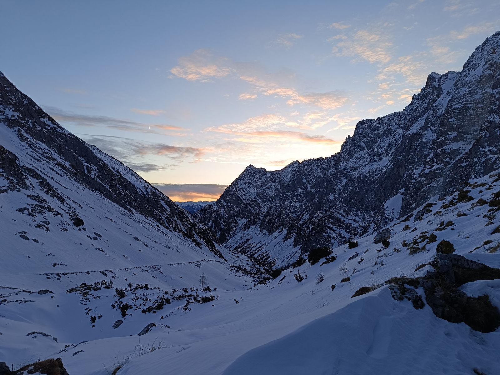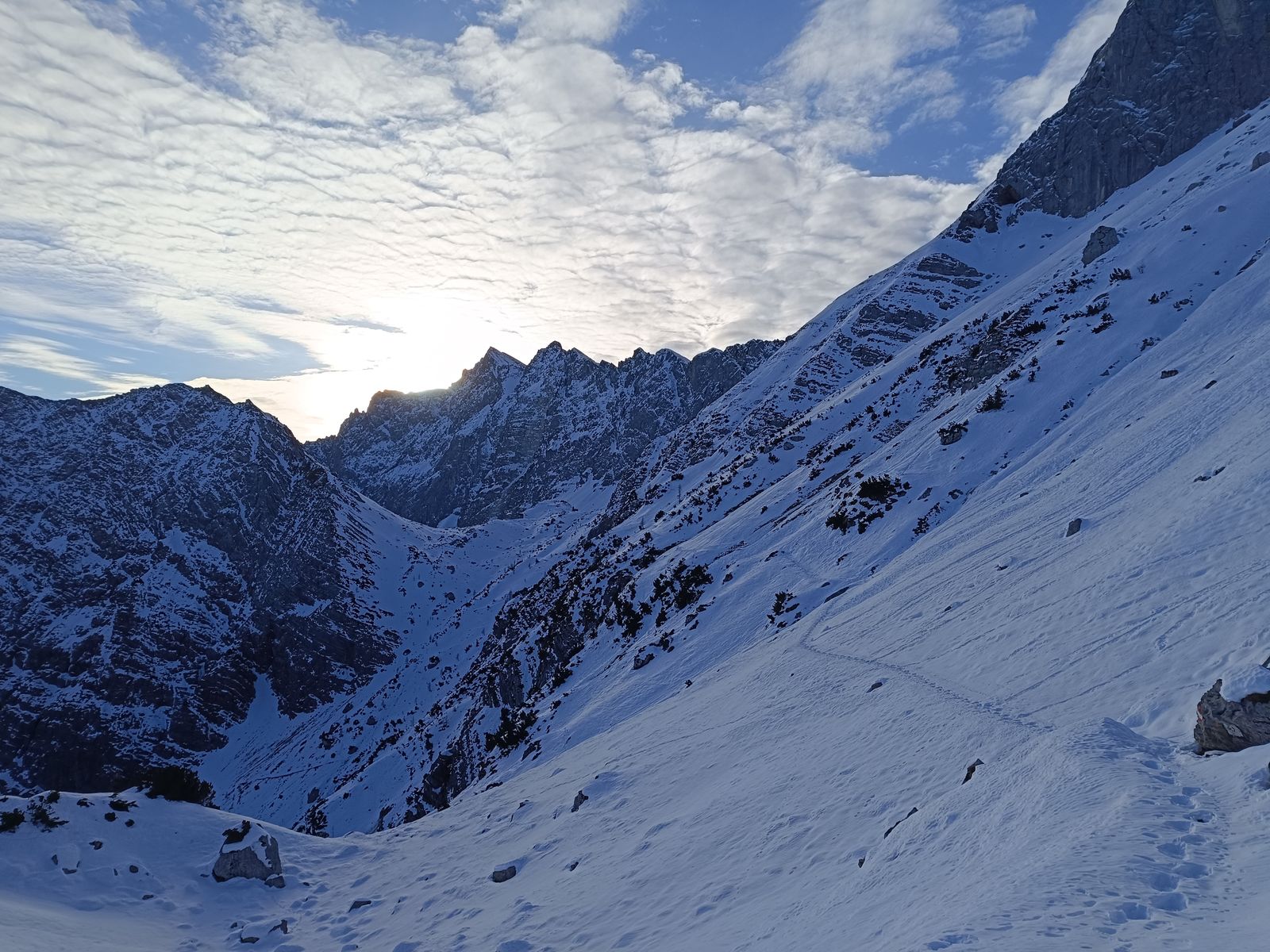 Ein Bergspetzl von mir hat mal gesagt: "Wennst a Abenteuer wuist, dann muasst ned auf Expedition nach Patagonien oder Nepal - do gehst einfach im Winter ins zentrale Karwendl - do is a wuid und einsam und weg kemma duast so schnäi a ned!" Das stimmt auf jeden Fall, wobei ich auch nicht überdramatisieren will, aber getroffen habe ich in den drei Tagen außer drei Kollegen, die durchs Johannistal zur Falkenhütte aufgestiegen sind, tatsächlich niemanden.