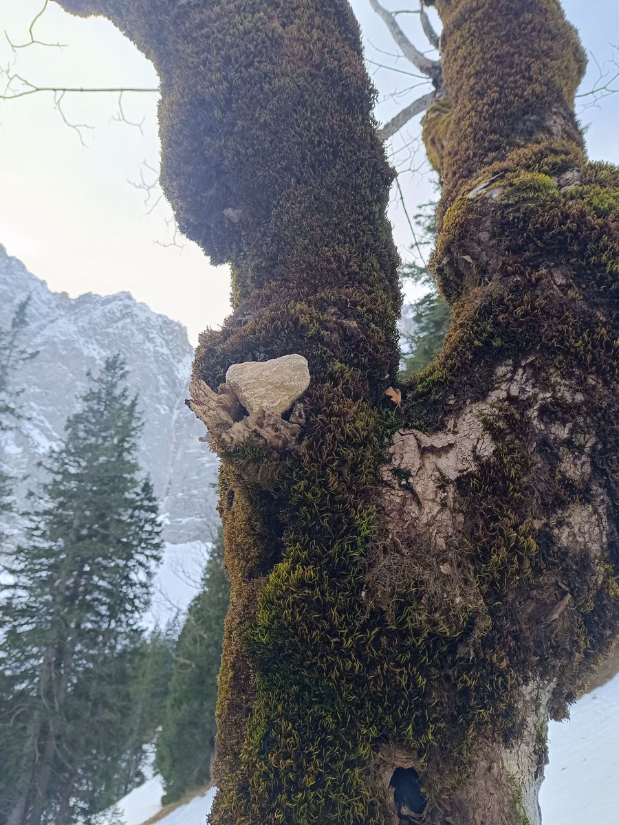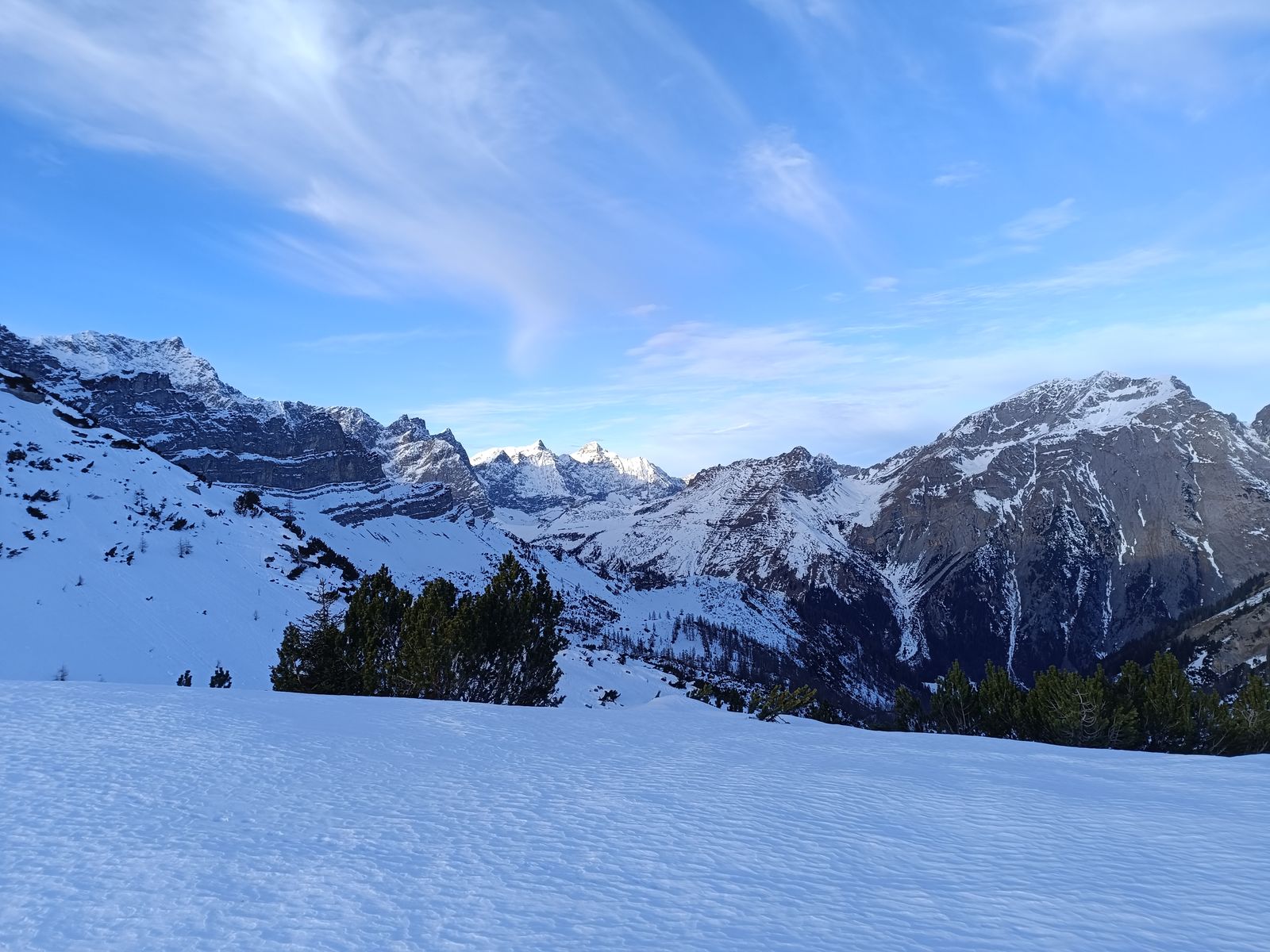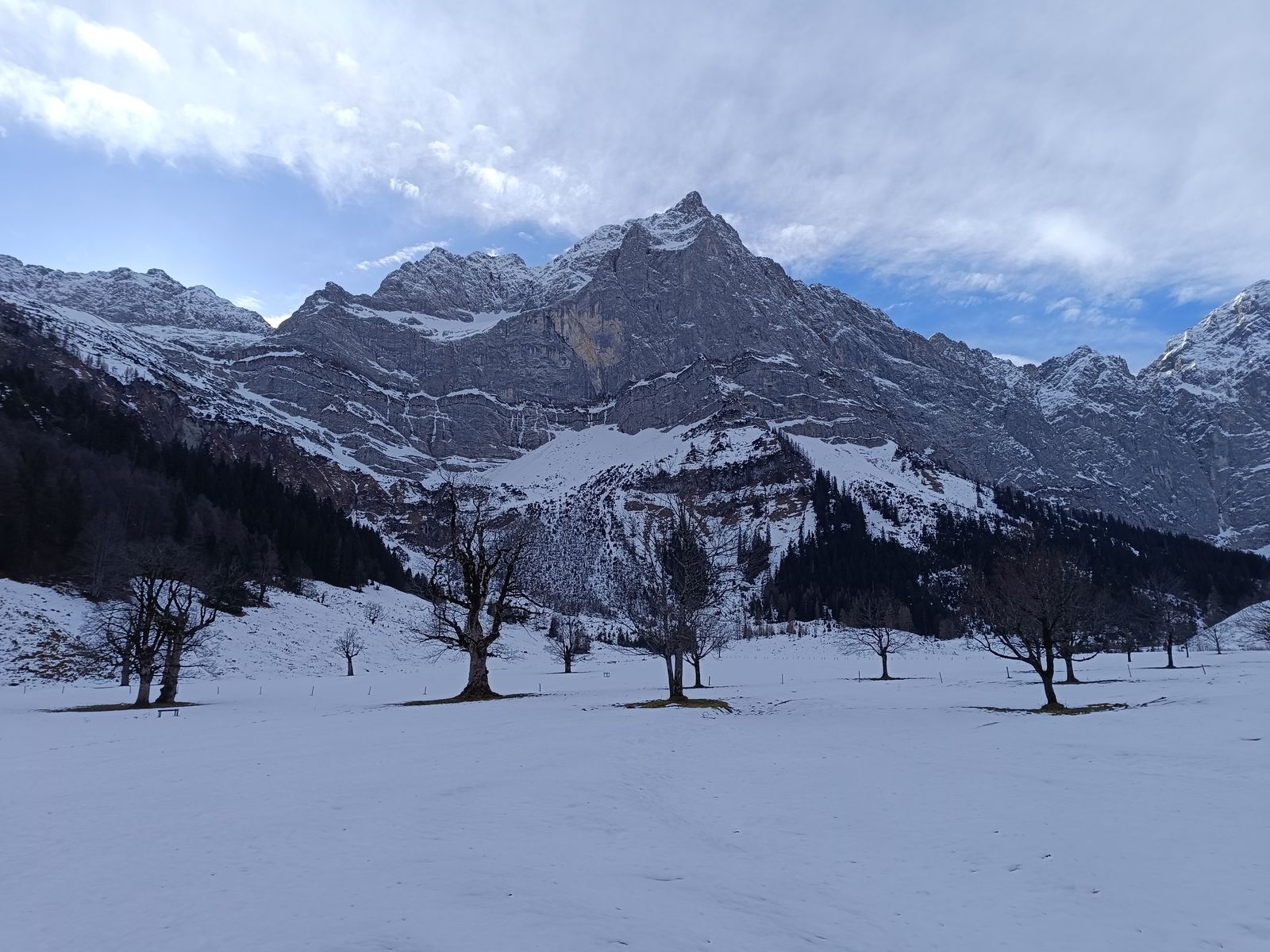 Vom Joch bin ich via Binsalm in die Eng abgestiegen und der Route des Sommerweges ins Hohljoch zur Falkenhütte gefolgt. Das kennt vermutlich jeder, aber im Winter hat das nochmal einen anderen Reiz - vor allem wenn man allein am Ahornboden ist. Bis auf die angesprochene Querung alles mit Schneeschuhen.