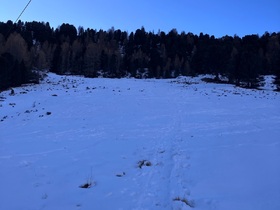 Vorbei an der Maseben Alm, die geöffnet ist, wuchs die Schneedecke auf 20-30cm an, aber das Gelände wurde auch felsiger. (Bild 2)