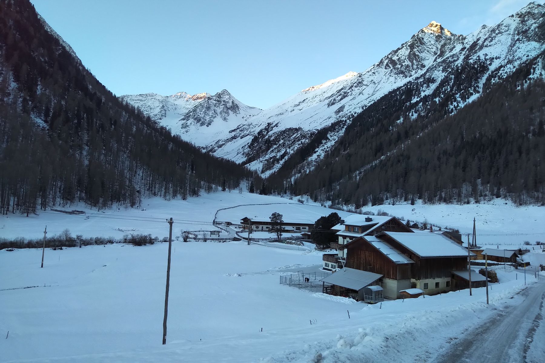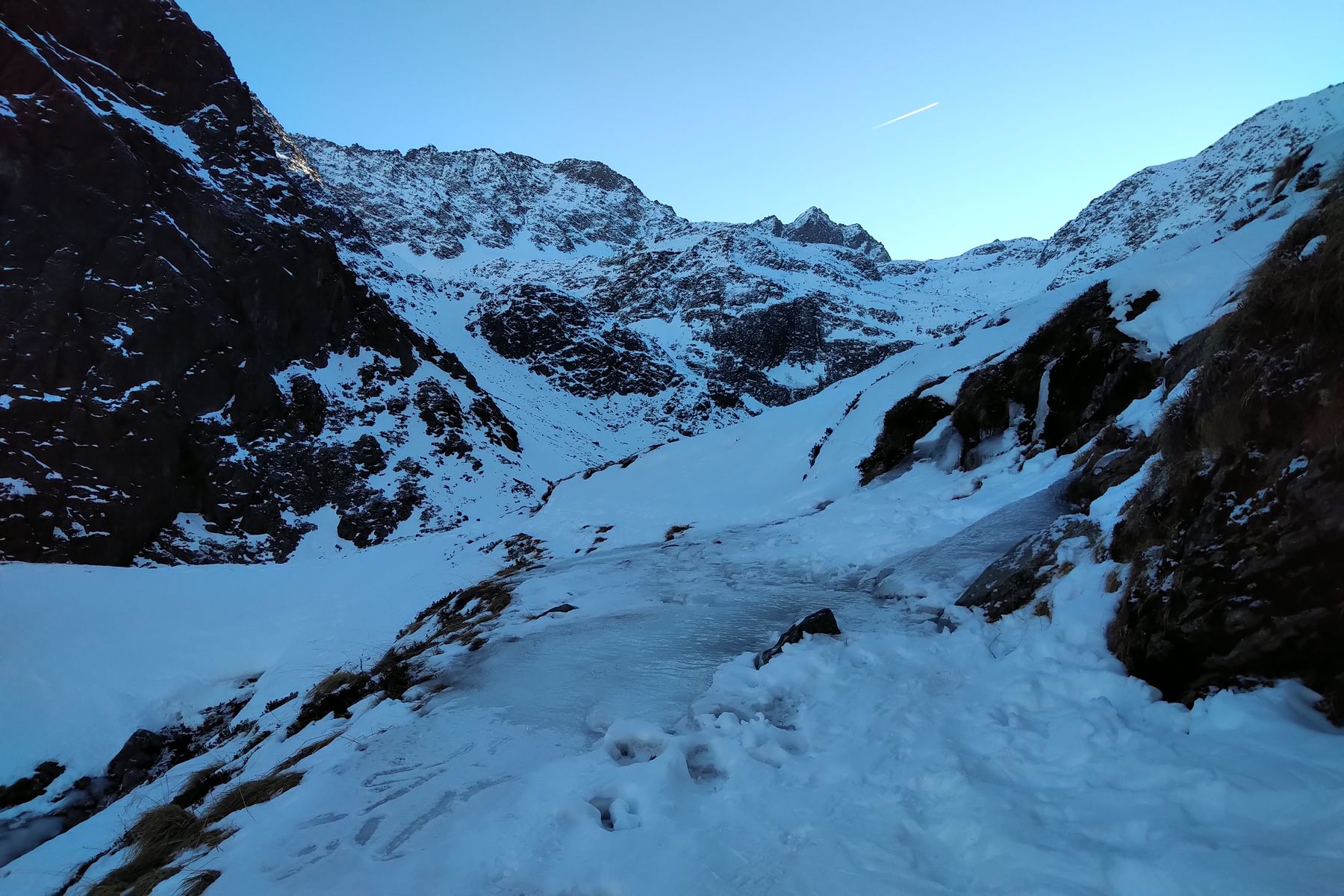 Mit etwas Vorsicht kommt man an einer Stelle noch gut über den gefrorenen Bach (Vorsicht - das Eis ist teilweise dünn) und kann nach ein paar Stapf-Minuten wieder die Ski anziehen. Der Hüttenweg ist stellenweise vereist, auch nicht ganz einfach. Beim Abstieg hab ich dort die Steigeisen angezogen, da ich nicht wusste, wie häufig die vereisten Stellen noch kommen. Im Nachhinein wär's wohl auch ohne gegangen, aber so hab ich sie nicht umsonst mitgeschleppt.