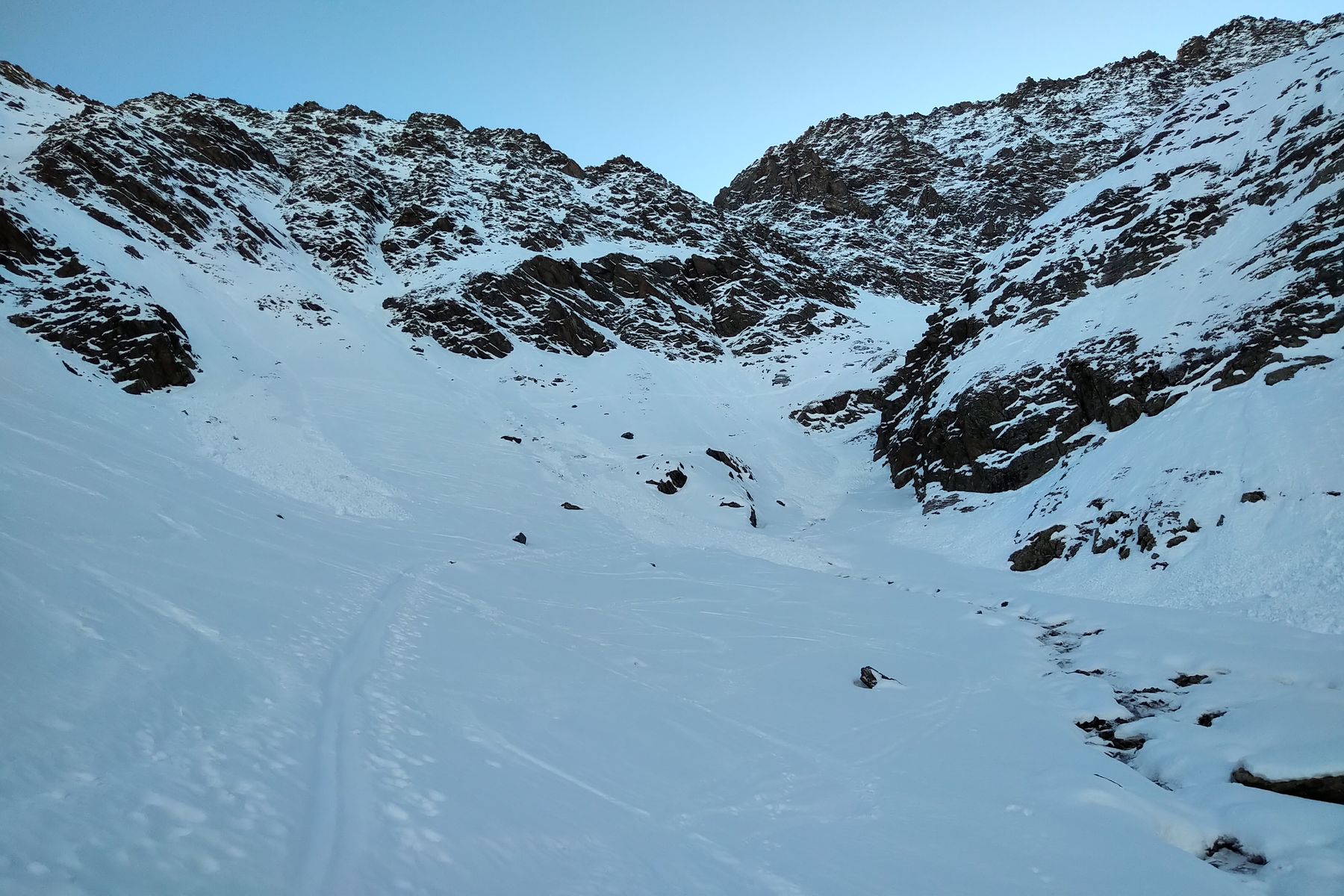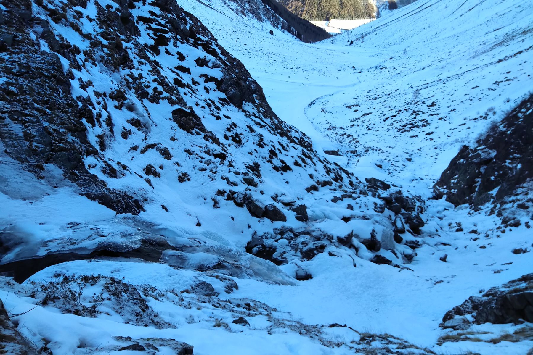 Bei der oberen Zwing sieht man schon eine Abfahrts-Spur, die von rechts die Zwing oberhalb quert. Dort bin ich auch beim Aufstieg hoch - das sah für mich angenehmer aus. In der Zwing direkt muss man momentan mehr Spitzkehren machen als sonst (wegen dem Bach):