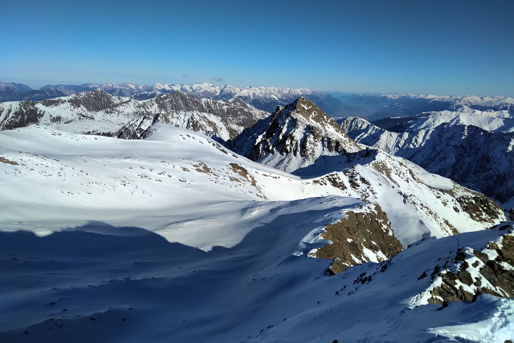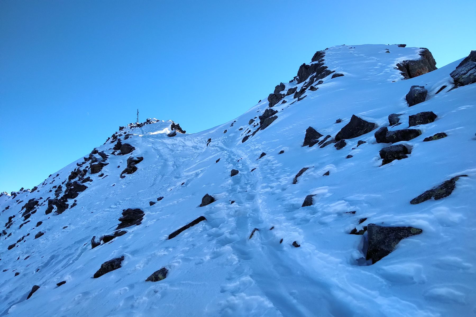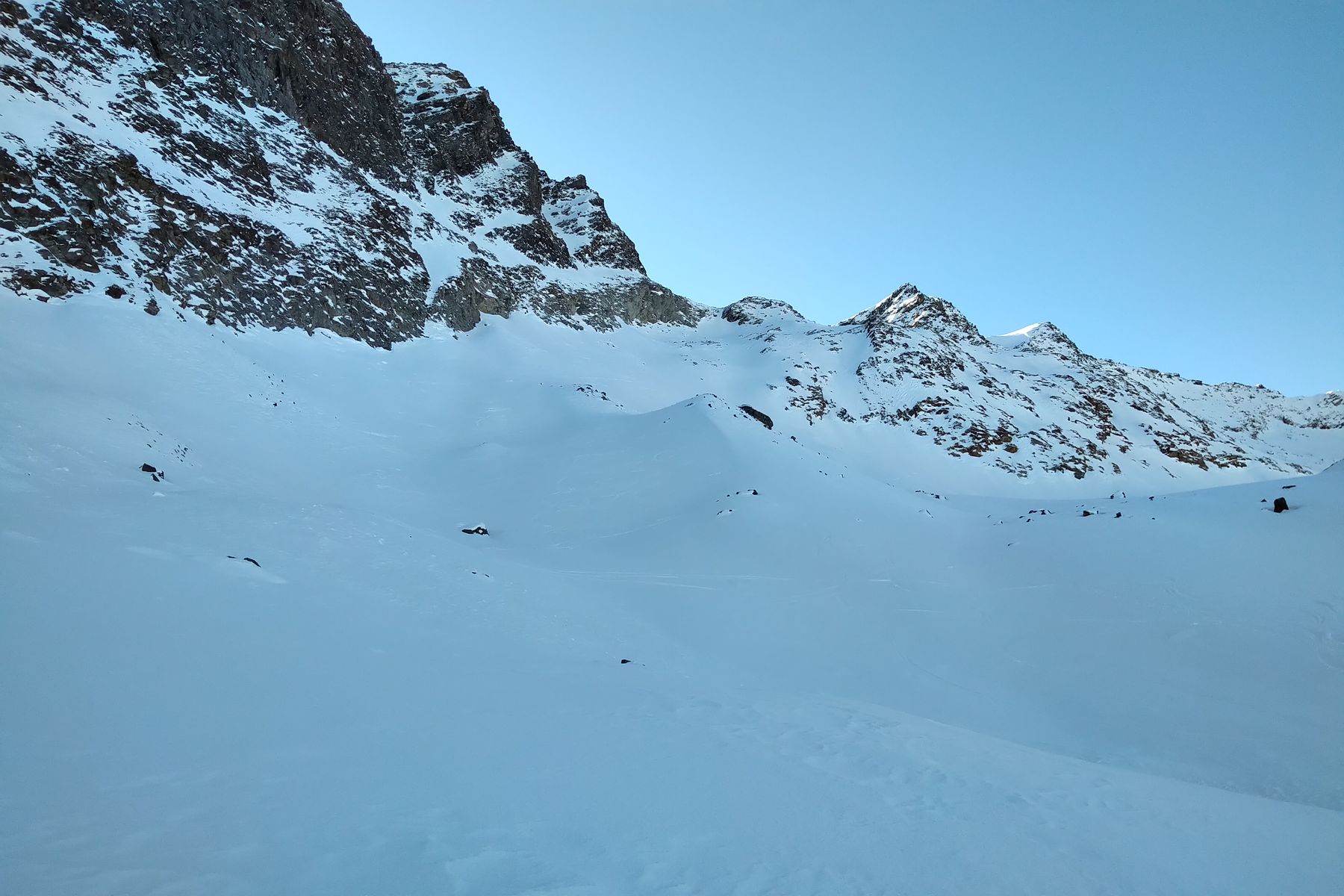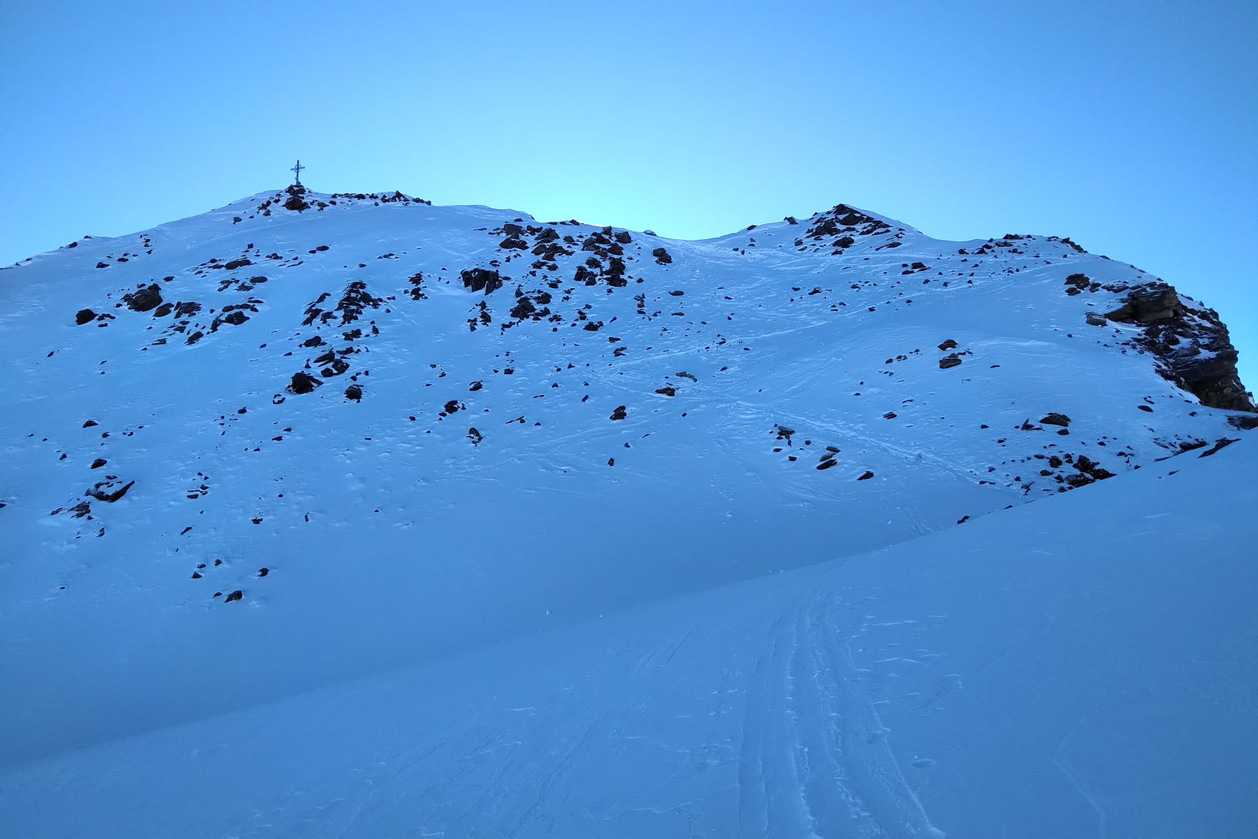 Man kann noch mit Ski bis zum Gipfel und bei vorsichtiger Fahrweise ohne Steinkontakt abfahren. Bei der direkten Abfahrt sah die Schneelage etwas besser aus, aber ohne Garantie. Für mich hat sich's nicht gelohnt, um danach wieder das Stück aufsteigen zu müssen:
