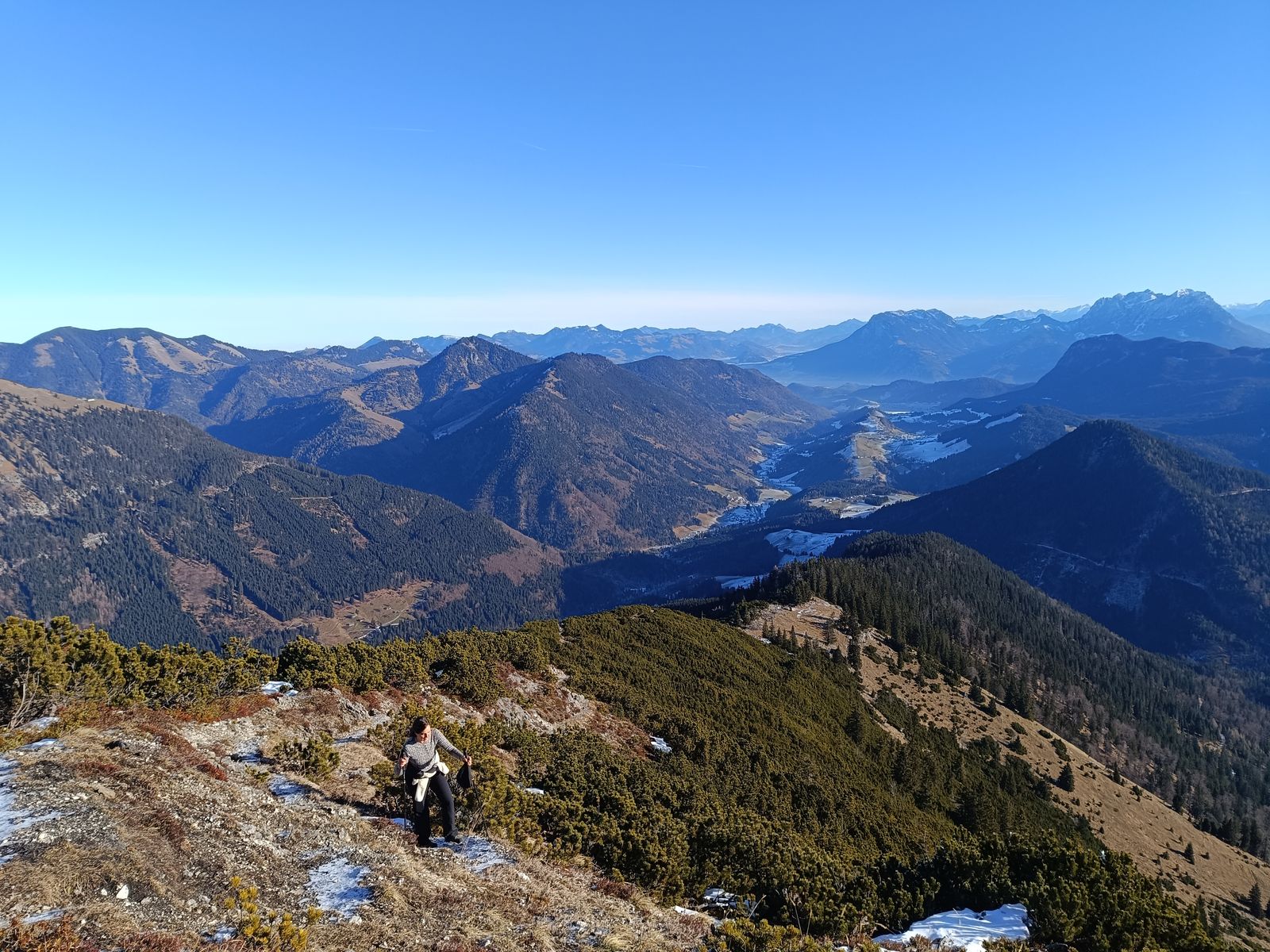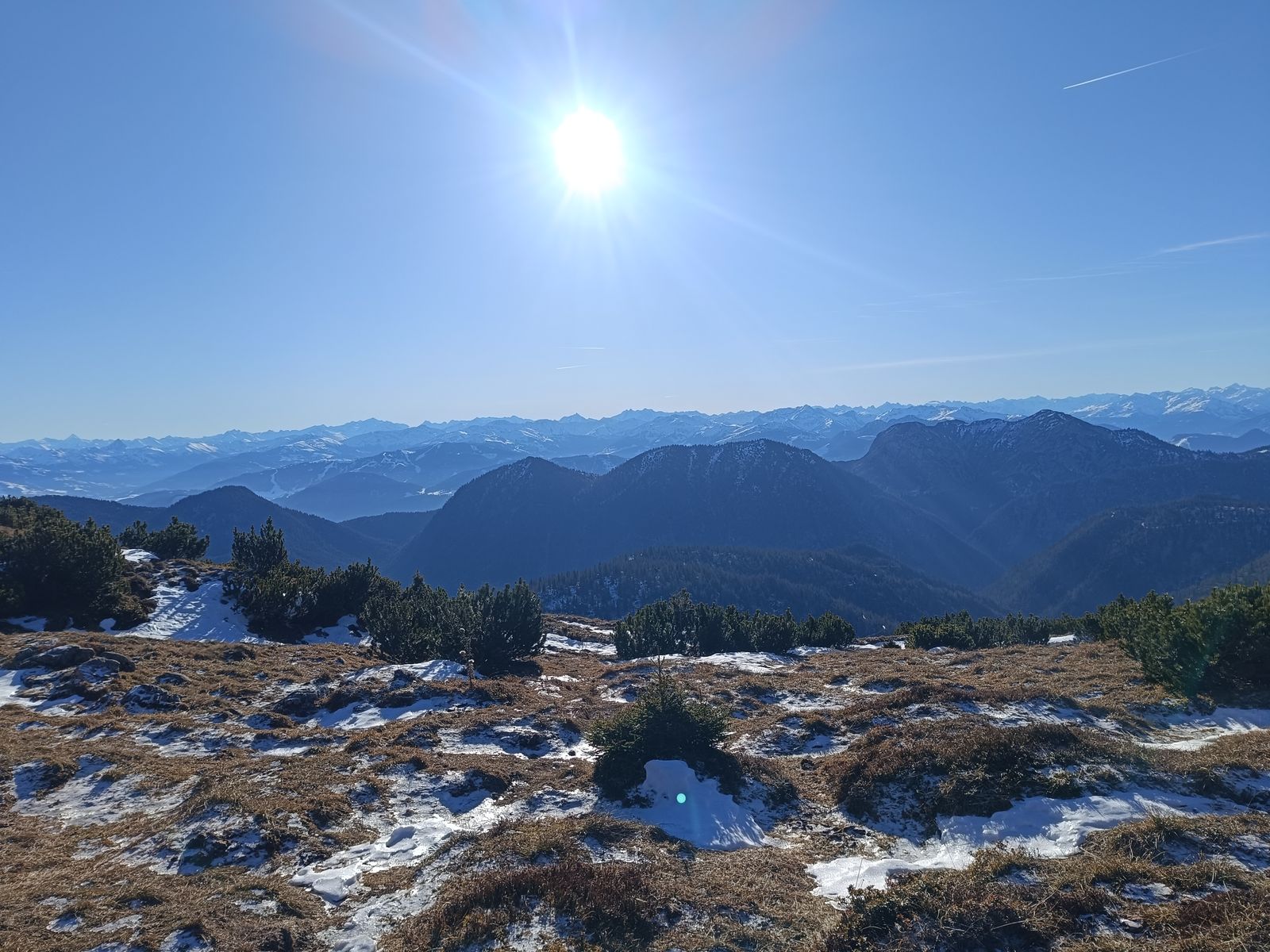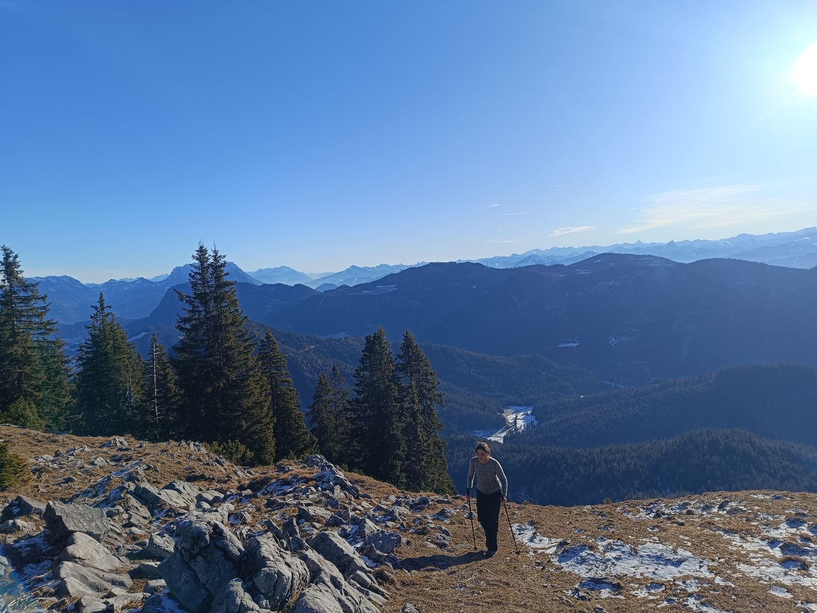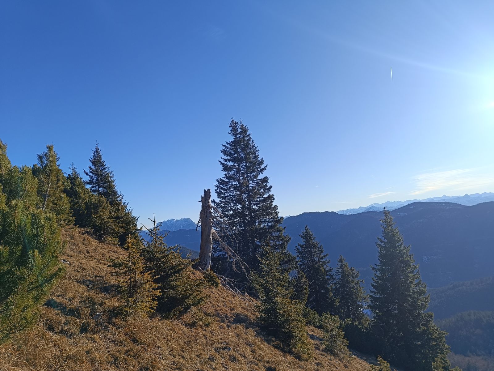 Bevor bei uns in den nebligen Niederungen des Mangfalltals jetzt am Nachmittag die Verwandtschaft vorbeikommt, waren Daniela und ich noch beim Sonne-Tanken in den Bergen. Und dafür bietet sich kaum eine Tour so an, wie die Rundtour über den Veitsberg, wo man kurz nach dem PP in die Sonne kommt und auch fast die ganze Tour lang bleibt.