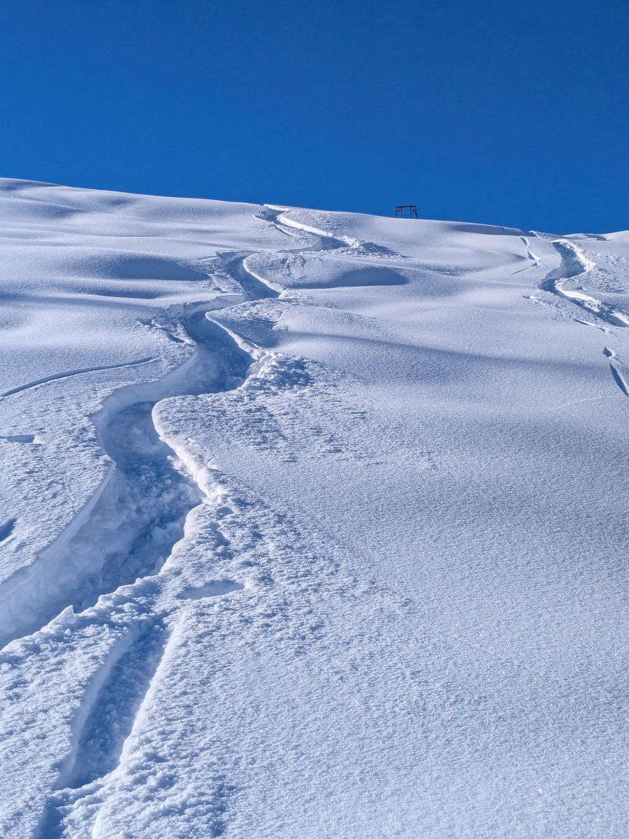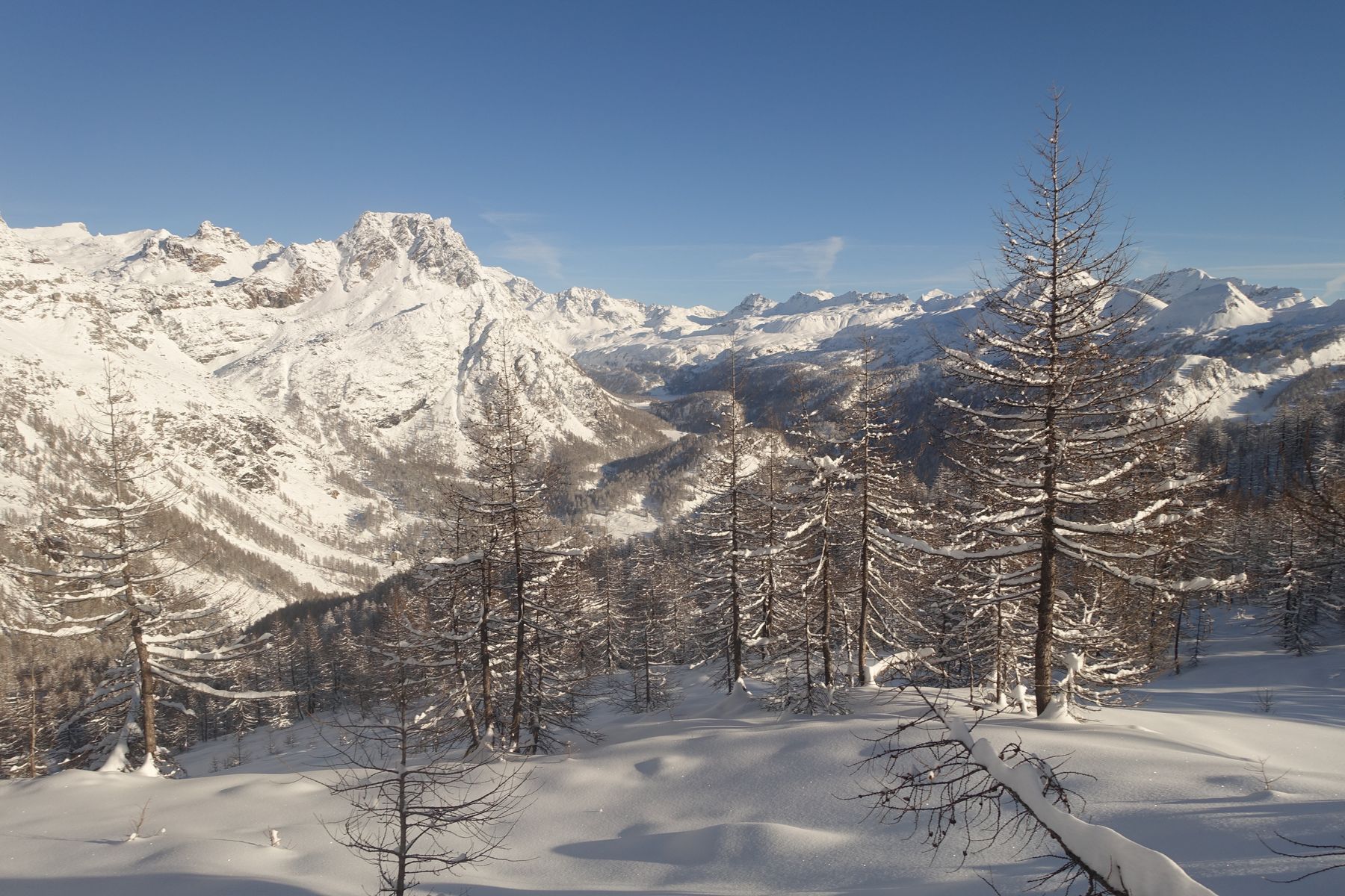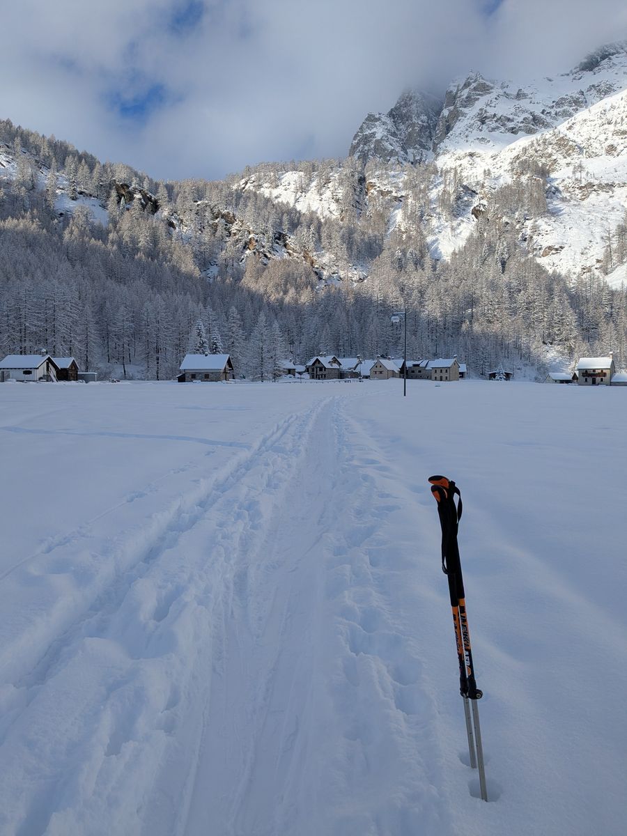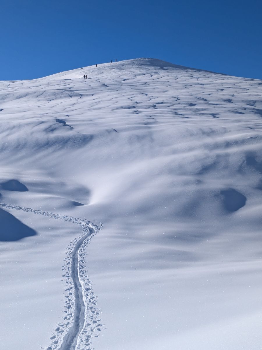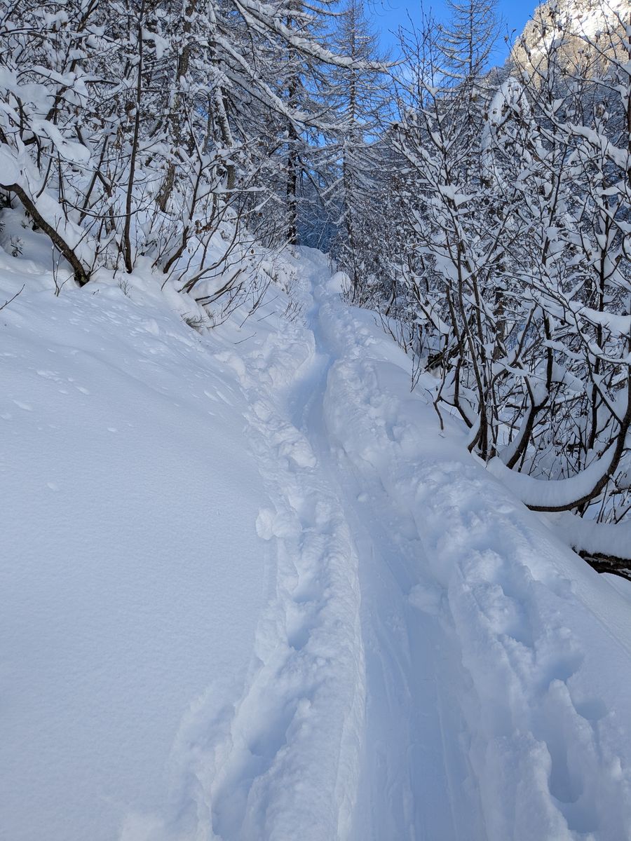 Über Weihnachten hat es in diesem Gebiet zwar nicht soviel geschneit als in den Seealpen, aber heute morgen lagen sowieso 30 cm Neuschnee im Tal und vielleicht 50 cm über 2000 m. Ohne Lust auf Spurarbeit habe ich den kleinen Klassiker "Monte Cazzola" ausgewählt (Topo), gute 700 hm über den Startpunkt. Der Fokus war mehr die endlich winterliche Landschaft zu genießen als Hohemeter und Steilhänge zu sammeln, und das ist mir 100% gelungen (auch wenn ich doch ein paar Schwünge in Pulver machen konnte). Fazit: "go west!"