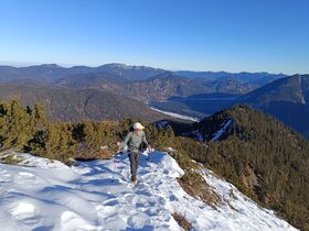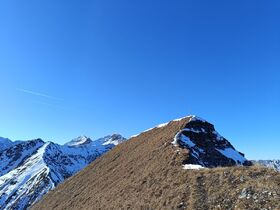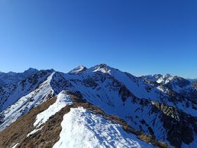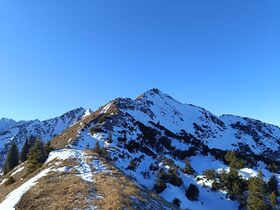 Wie man den unbeschilderten Einstieg in die Tour findet, habe ich in mehreren Berichten bereits beschrieben und verzichte daher heute darauf. Wenn man die Route erst einmal gefunden hat, geht es ohne Orientierungsprobleme über die Grafenherberge zum Galgenstangenjoch hinauf und dann immer am Kamm entlang so weit man möchte oder es von den Verhältnissen her Sinn macht. Für uns war bei der Baierkarspitze Schluss, weil der Weiterweg bei Schneelage nicht ohne ist und wir auch alles selber Spuren hätten müssen, was bei den kurzen Tagen momentan sicher zu einem Zeitproblem geführt hätte. Bis zur Baierkar nur kürzere schneeige Stellen (Grödel hilfreich, aber nicht obligatorisch). Runter auf dem gleichen Weg wie hoch.
