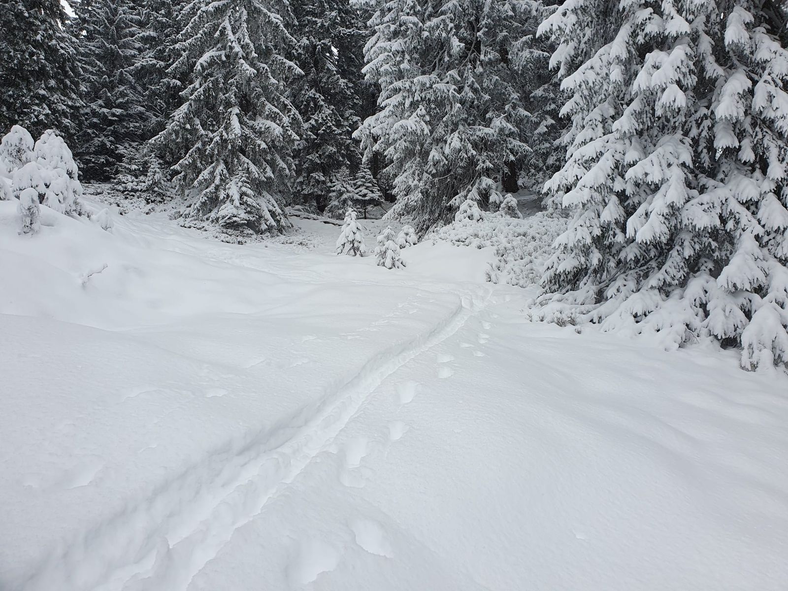 Wir sind aber nicht ganz zum Gipfel wegen stürmisch + zu dem Zeitpunkt tendenziell white out. Dafür insgesamt 3x hoch, z.T. in meiner Lieblingswaldschneise (windgeschützt): links vom linkesten Abfahrtshang beim Schlepplift. Dort ist es z.T. noch dünn (also nur Aufstieg), aber insgesamt sind die harten Geräusche unter den Skiern kein Stein sondern Altschnee.