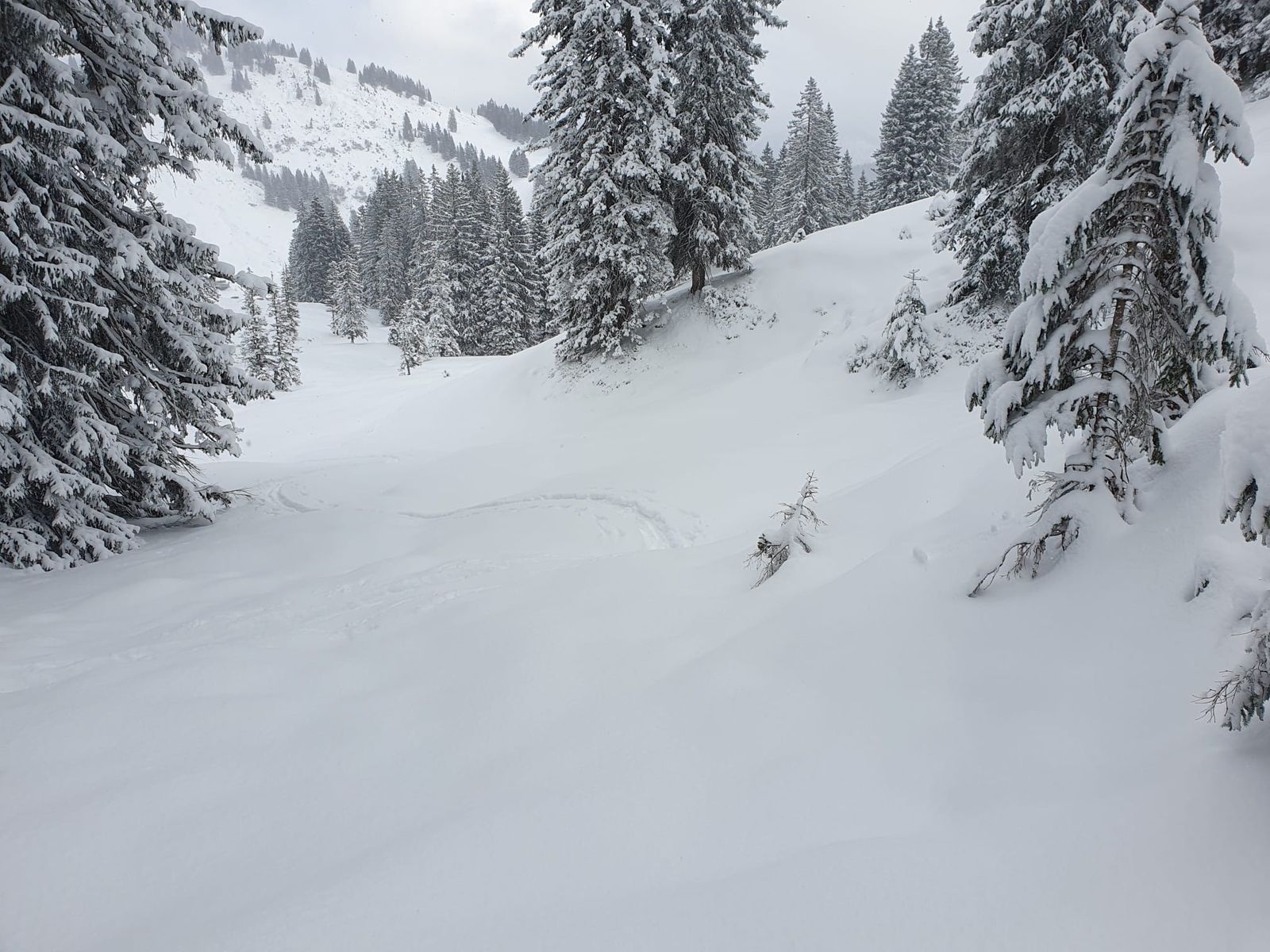 Wetterprognose hatte gestimmt und heute am späten Vormittag war - glücklicherweise - ca. 15cm Pulverschnee dazu gekommen! Richtig fluffig. Wenn man sich auskennt, weiß und spürt man, wo man aufpassen muss. Ganz hat die Prognose nicht gestimmt, weil es heut statt Sonne weiteren Schneefall gab