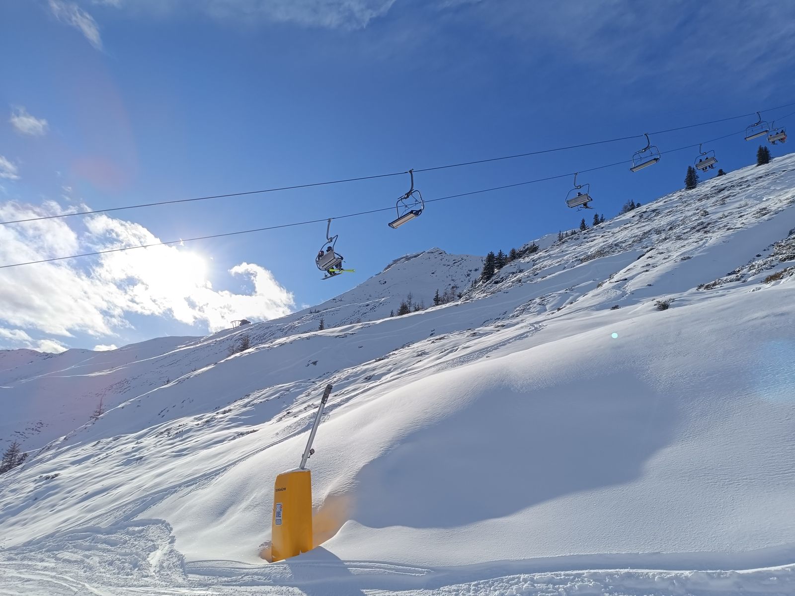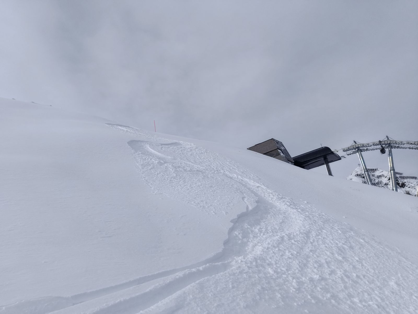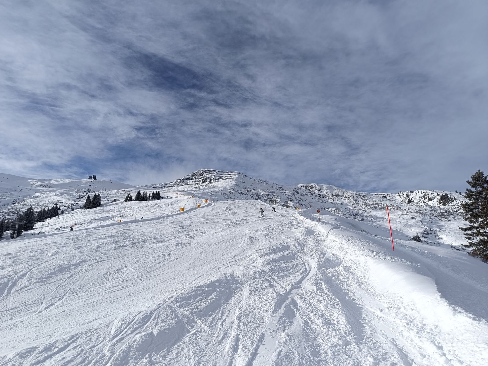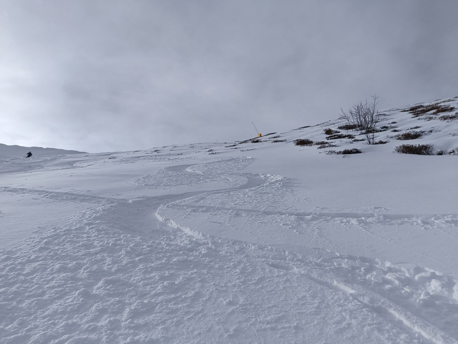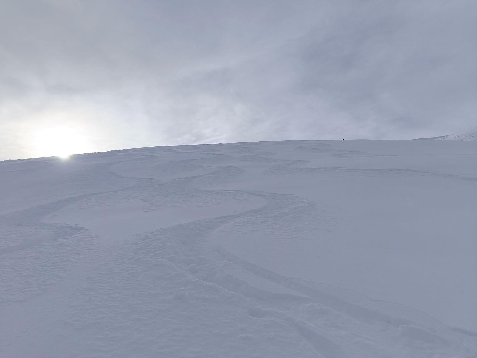 Insgesamt heute ein sehr feiner Tag mit spektakulären Wolken- und Lichtspielen. Angenehm ist, dass der komplette Anstieg momentan ohne Pistenkontakt möglich ist, da die Pisten hier noch nicht in Betrieb sind.