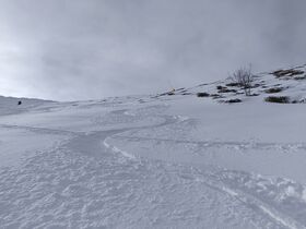 Ergebnis: Noch nicht so besonders. Es hat über Nacht etwa 10cm geschneit und auch nach oben hin wird es nicht mehr. Die meisten klassischen Skitouren (Galtenberg etc.) haben meiner Ansicht nach noch deutlich zu wenig Schnee, als dass es dort Sinn machen würde (siehe Bilder - es fehlen im Gelände schon noch 30cm für brauchbare Verhältnisse). Daher bin ich über die Skiroute Baumgarten (=Piste 66 im Skigebiet, nicht präpariert) zum Wiedersberger Horn hoch. Der Schnee reicht zwar für den Aufstieg, aber nicht für die Abfahrt. Deswegen Abfahrt über die Pisten (mit Gegenanstieg zum Gmahkopf) nach Inneralpbach. Ganz oben konnte ich einige schöne Pulverschwünge in eingewehten Mulden machen. Grundsätzlich bleibt man aber besser auf der Piste.