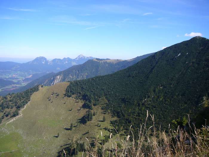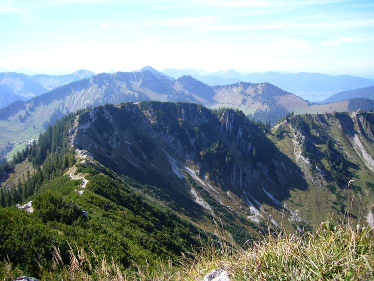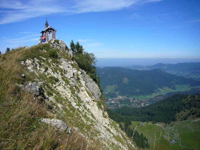 Nun links über den grasigen Wiesenkamm u. später durch Latschen, etwas felsig, steil zum Gipfel. Von dort auf dem Grat i.R. Westen u. dann Norden bis zur Freudenreichkapelle, nicht empfehlenswert bei Nässe, da der anschließende steile Abstieg felsdurchsetzt u. äußerst rutschig ist.