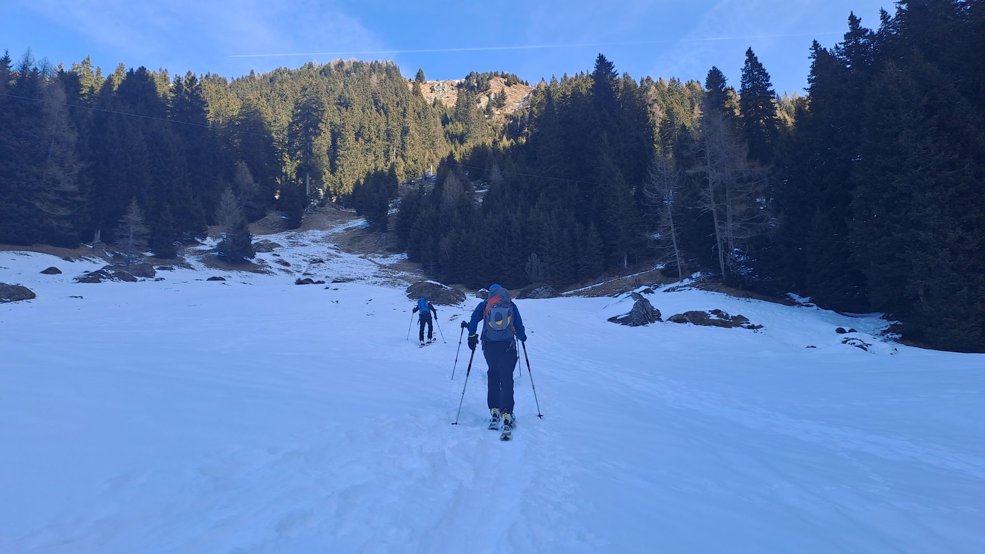Erst ab 1550m im Schatten dünne geschlossene Schneedecke.