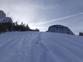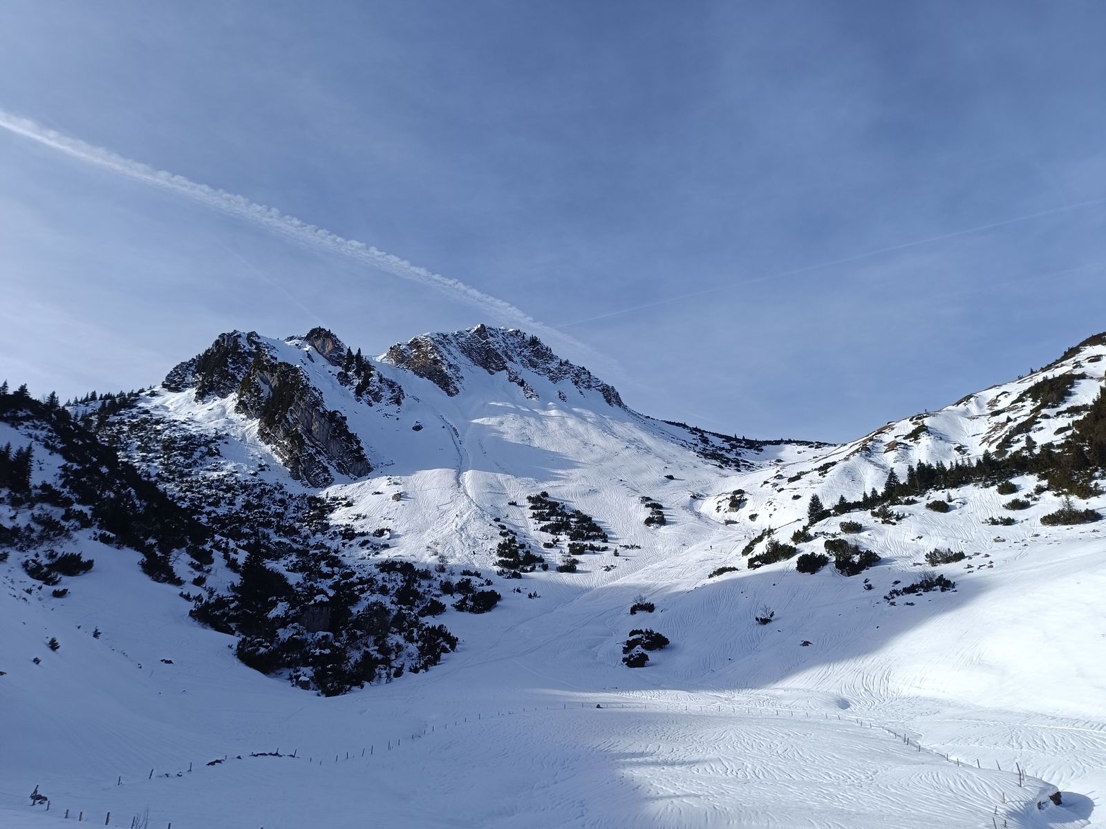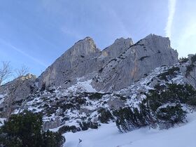 ging es für mich heute. Da vom Schnee her nix zu erwarten war, hab ich die Ski im Auto gelassen und bin wieder mit den Schneeschuhen los. Bereut habe ich diese Entscheidung nicht, weil die Schneequalität ganz schlecht ist. Vor allem die Abfahrt ins Großtiefental (Auerspitz Nord) ist fast schon lächerlich mies mit einer Eislamelle als oberster Schicht (siehe Bild). Die Schneemenge würde im ganzen Gebiet gut ausreichen, aber wenn's skifahrerisch nur darum geht, unten mit Kreuzband anzukommen - nein danke.