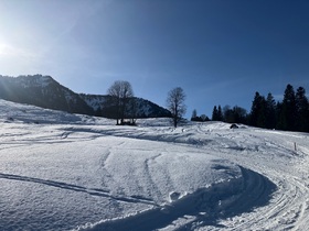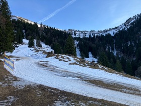 Wichtig für Öffi-Fahrer: Der Bus zurück von der Hochgratbahn scheint beharrlich vor der Abfahrtszeit (jeweils 5 nach) zu fahren. Das war schon bei der Ankunft so und dann leider auch bei meiner Rückkehr ... Daher als Trainings- und Buswartezeit-Überbrückungstour über die ehemalige Piste (Ahornhang) noch einmal bis ca. 1.200 m (Auftreffen auf die Rodelbahn) hoch. Schnee liegt schon, aber das beste was es da gäbe, sind hart eingefahrene Stellen. Häufig aber eher Bruchharsch. Also herunter über die Rodelbahn - zwar Dreckschnee, aber sehr gut und zügig zu fahren (und durchgehend schneebedeckt, was man angesichts der selbst nordseitig teilweise aperen Hänge kaum meinen würde). Aber wenn eine Abfahrt über die Almstraße / Rodelbahn abfahrtstechnisch mit der beste (Abfahrts-)Teil der Tour ist, sagt das schon viel ...