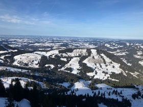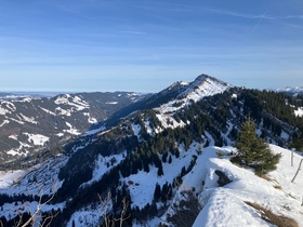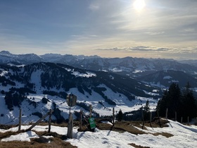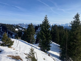 Start bei der Hochgratbahn (Bushaltestelle) und über Almstraßen mit Abkürzern zur Oberen Stieg-Alpe. Dann folgt die recht rustikale Querung im Wald - im Aufstieg ging es mit Skiern, in der Abfahrt habe ich dort für ca. 30 m abgeschnallt. Weiter zur Falkenhütte und beim dortigen Schlepplift (nicht in Betrieb) hoch zum Gipfelbereich - ich bin bis zum vermeintlich höchsten Punkt weiter (teilweise recht rustikal), der skifahrerisch lohnende Teil endet aber beim Bankerl oberhalb der Schlepplift-Bergstation. In der Sonne heute sehr warm. Da der Eineguntkopf eine der letzten Berge Richtung Bodensee / schwäbisches Flachland ist, ist die Sicht natürlich sehr gut. Dazu noch der Alpstein, heute mal leicht im Dunst und die nah gelegenen Berge des Bregenzer Waldes.