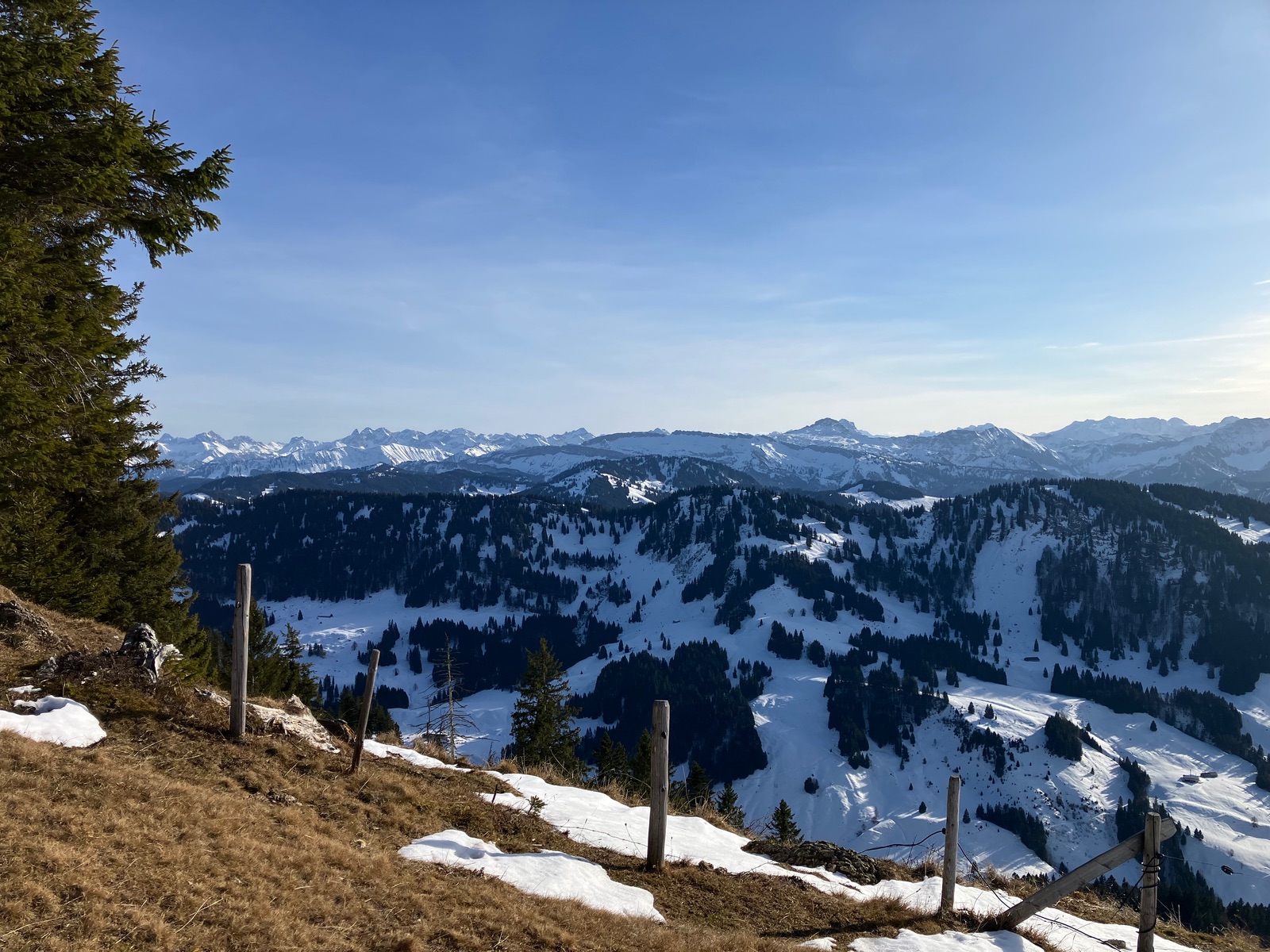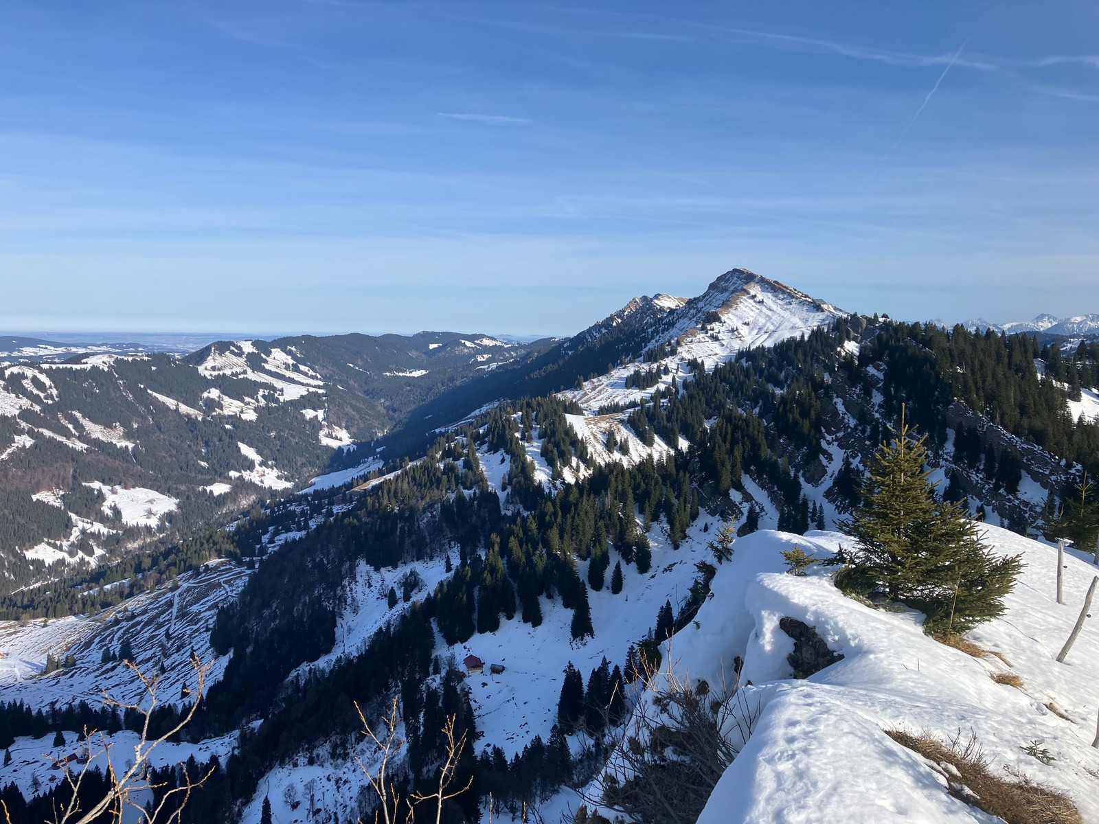 Blick vom Hochgrat - die aperen Stellen dürften nach meiner Einschätzung v.a. vom Wind gekommen sein, der hier westseitig stark gewirkt hat: