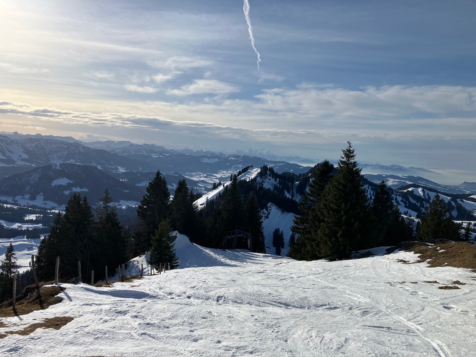 Blick zum Falken etc. vom Beginn der eigentlichen Skiabfahrt - hinten der Alpstein im Dunst: