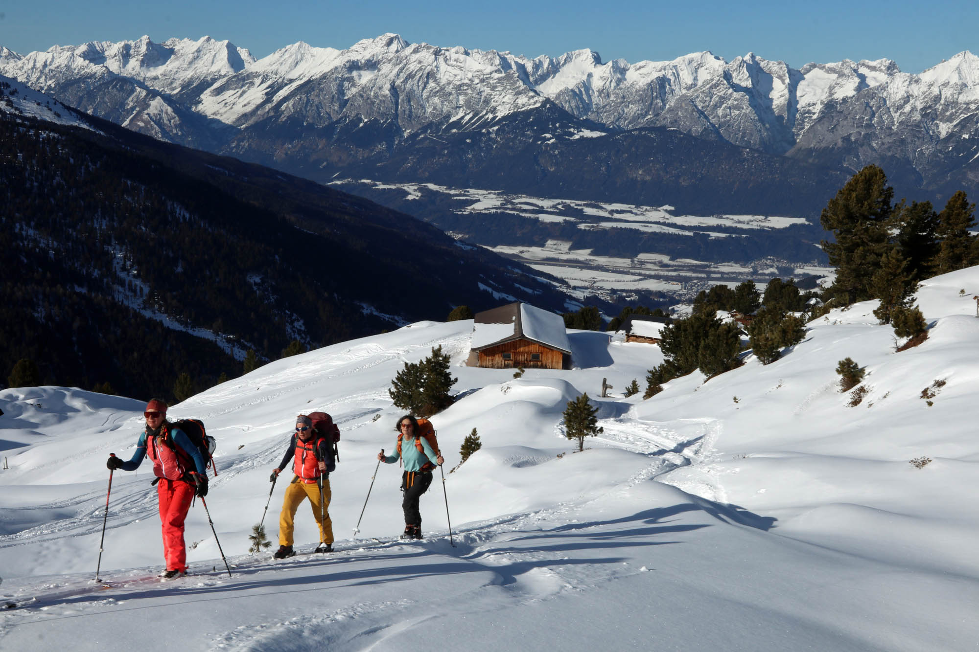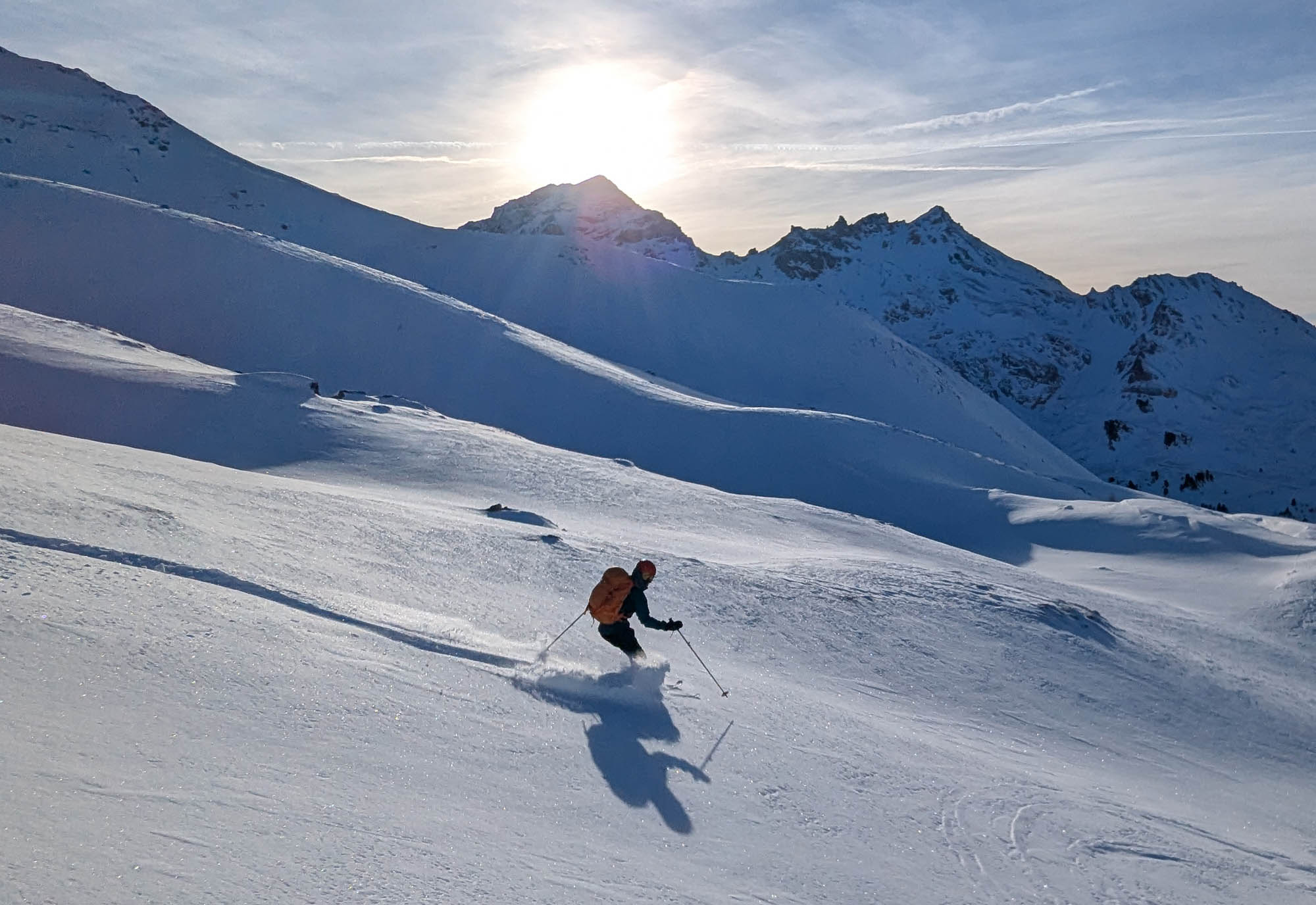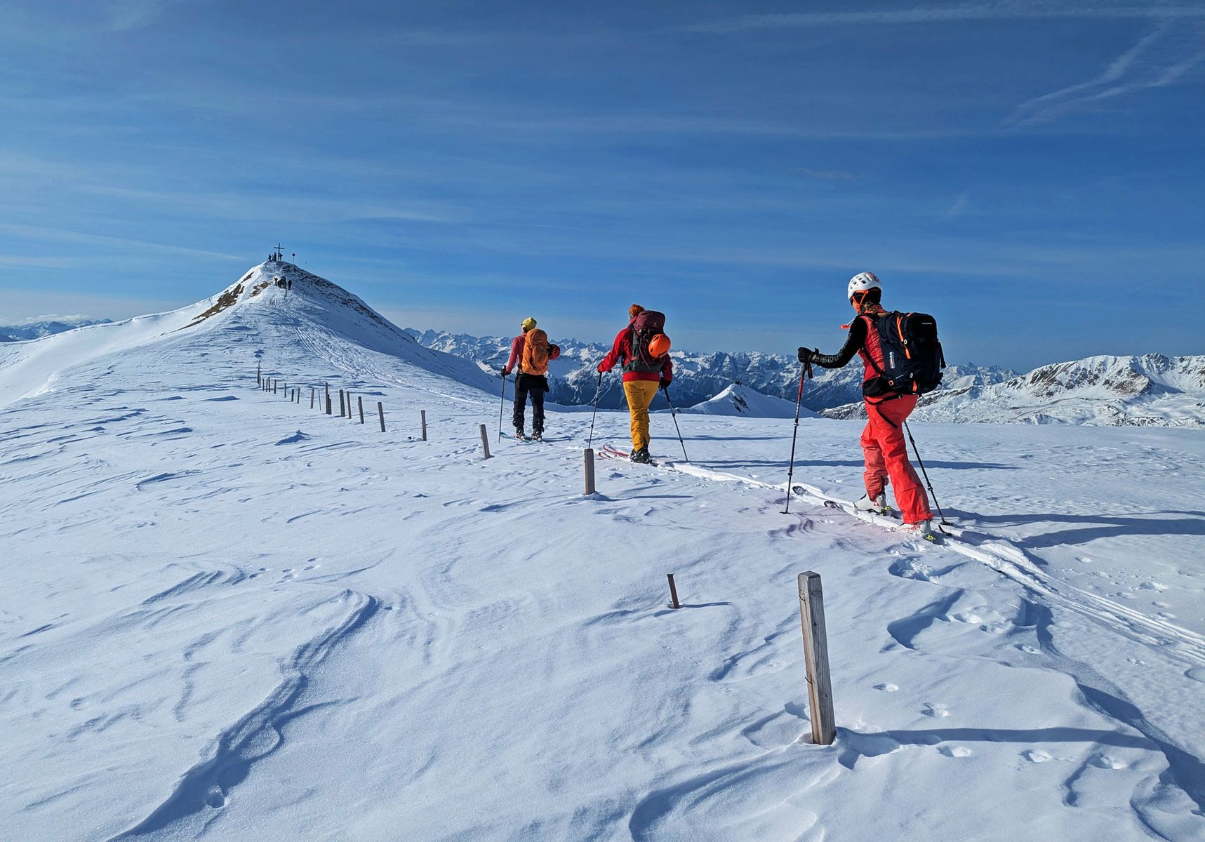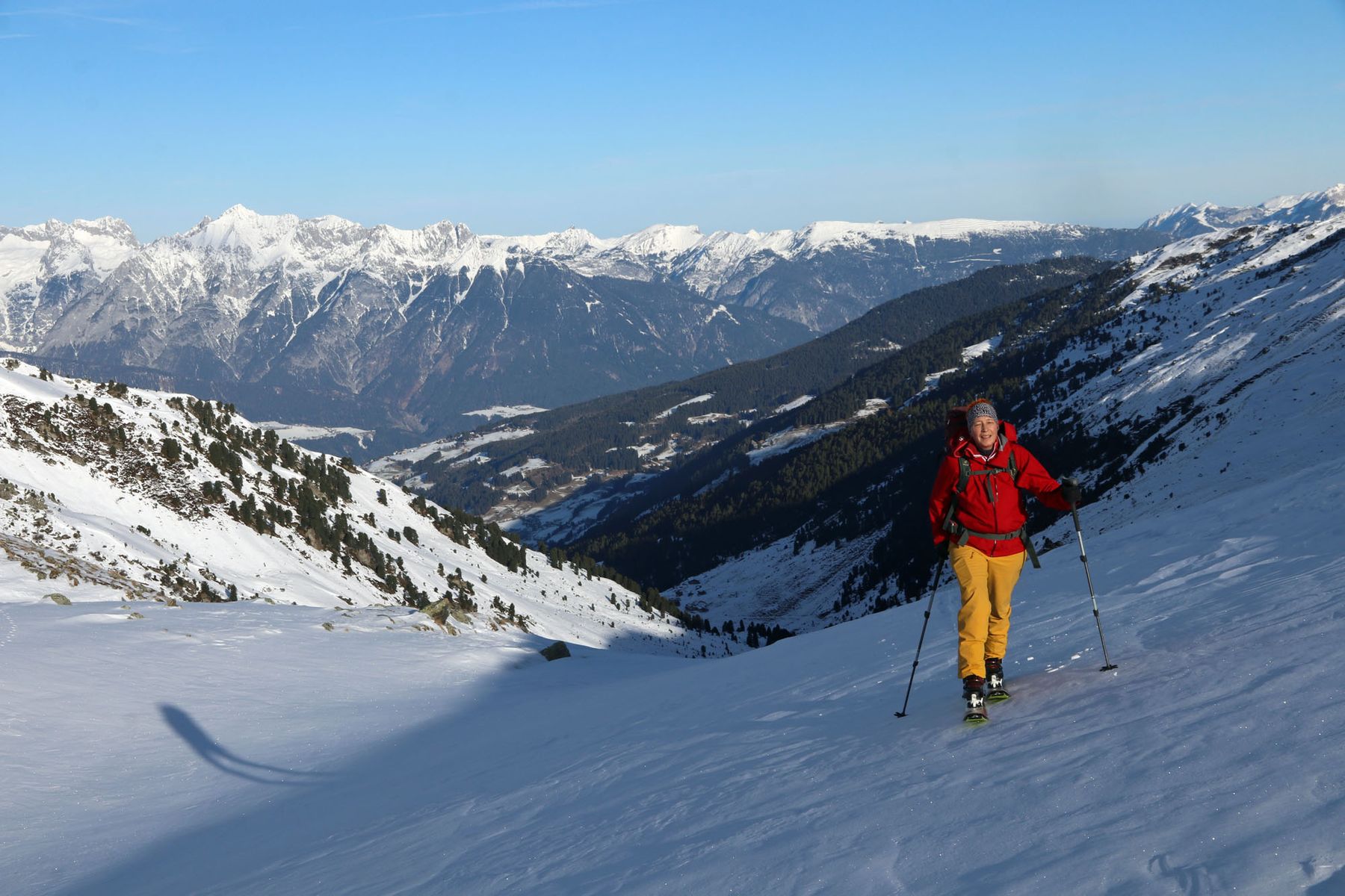 Auf der Querung unterhalb des Hoberjochs nach Westen (den Gipfel haben wir ausgelassen, da uns ein ausreichender Zeitpuffer wichtig war) gab es in so gut wie jeder Mulde starke Setzungsgeräusche. An Rücken und nicht konkav gewölbten Hängen hörte ich hingegen keine. Die südseitigen Hänge hinab zur Vallruckalm waren von der Schneelage fahrbar, haben aber wie die gesamte Region unterdurchschnittlich viel Schnee. Sie sind recht flach und wiesen keinerlei Lawinengefahr auf. Im Gegensatz zum anschließenden Anstieg zur Torspitze. Auf der Pause überlegten wir uns sehr gut, ob da hineinsollten. Wir hatten das Glück, dass bereits vier Abfahrtsspuren in den nicht ganz flachen Nordost- und Osthängen zu sehen waren. Wir stiegen also genau entlang dieser Spuren mit weiten Abständen auf. Der Gipfelanstieg zur Torspitze (2663 m) verlief wie am Vortag auf, vom Wind geprägten Harsch. Die ersten 200 Hm Abfahrtshöhenmeter direkt zur Hütte waren auch eher hart, aber griffig. Unterhalb von ca. 2400 m gab es dann wieder schönen Powder. Allerdings muss man aufgrund des felsigeren Geländes sehr gut auf »sharks« achten, die von lockere Schnee überdeckt sind. Wir waren die ersten, die diesen Hüttenübergang nach den Neuschneefällen gemacht haben. Der nette Hüttwirt Tobias wies uns noch darauf hin, dass wir uns ab der Vallruckalm bis zum Gipfel in einem Bereich des Militärgebietes Lager befanden, den man eigentlich nicht betreten darf. Offiziell erlaubt ist der Übergang über das Krovenzjoch.