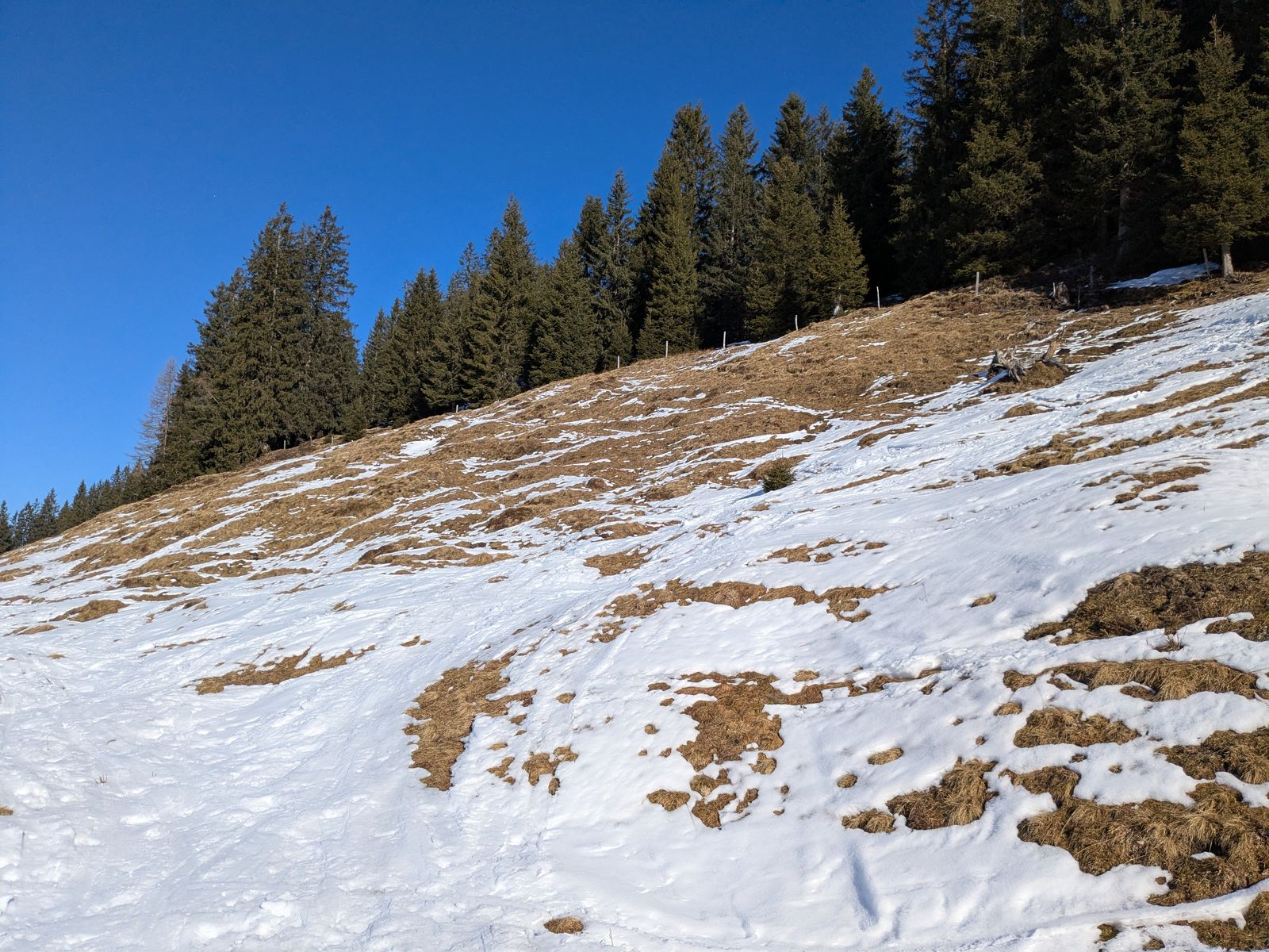 Machbar, aber bei der wenigen Schnee eher als Schneeschuhtour zu empfehlen. Glücklicherweise verläuft die Route meistens auf Wiesen, deswegen konnte Steinkontakt vermeiden werden. Nur bei einer kurzen Strecke gegen die Hälfte der Tour mussten die Skis wirklich abgeschnallt werden. Das Wetter war aber großartig vor allem im Vergleich mit dem Münchner Dauernebel.