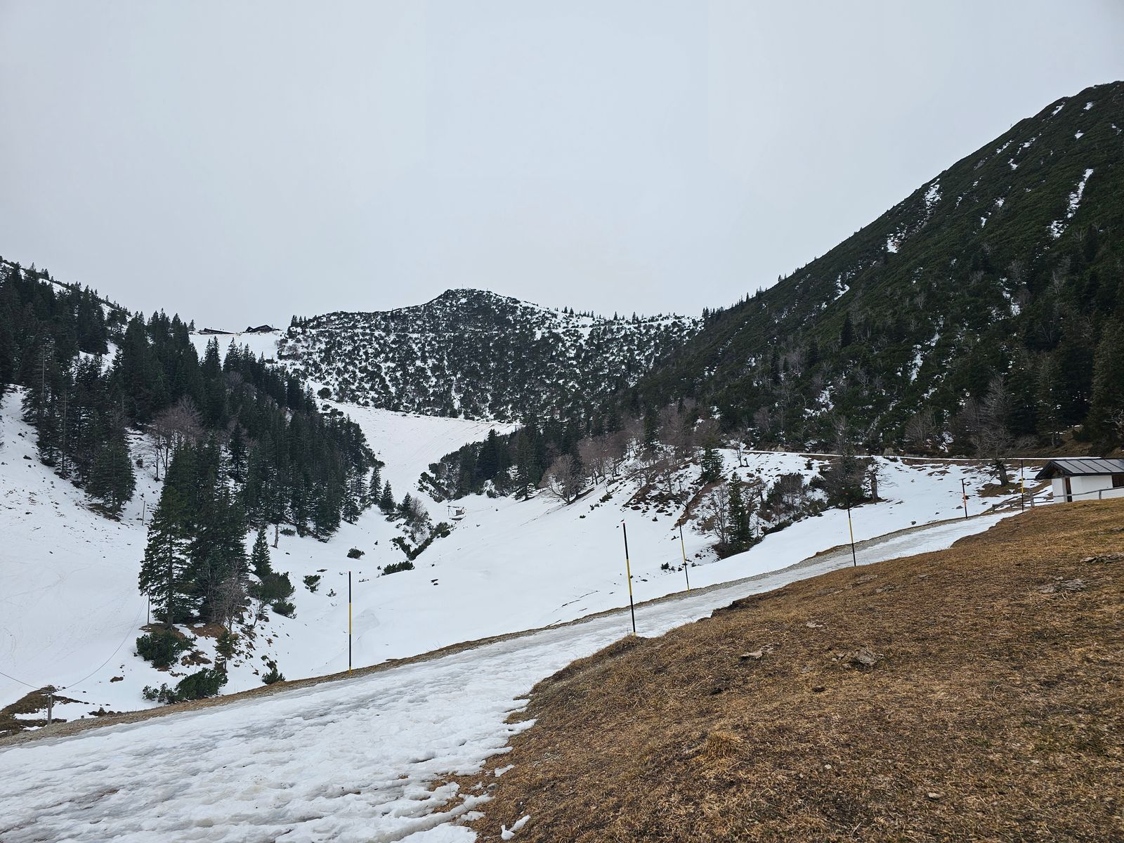 Eigentlich ist das Wandern auf der Nordseite niemanden zu empfehlen. Ich bin auf der Forststraße zum Herzogstandhaus gelaufen, stellenweise ist es blankes Eis und damit extrem rutschig. Am Rand kommt man manchmal ganz gut aus, aber man sollte in jedem Fall Grödeln mitnehmen oder gleich die Gondel nehmen. Einige Mutige/Verrückte waren unterwegs. Ich habe noch noch für eine Zipfelbobabfahrt entschieden, was sogar einigermaßen ging, man muss aber extrem aufpassen, nicht die Kontrolle in dem Eiskanal zu verlieren. Bei diesen Bedingungen keinesfalls zu empfehlen! Vielleicht wird es mit dem Schnee wieder besser? Nur wir soll sich der mit dem Eis noch verbinden