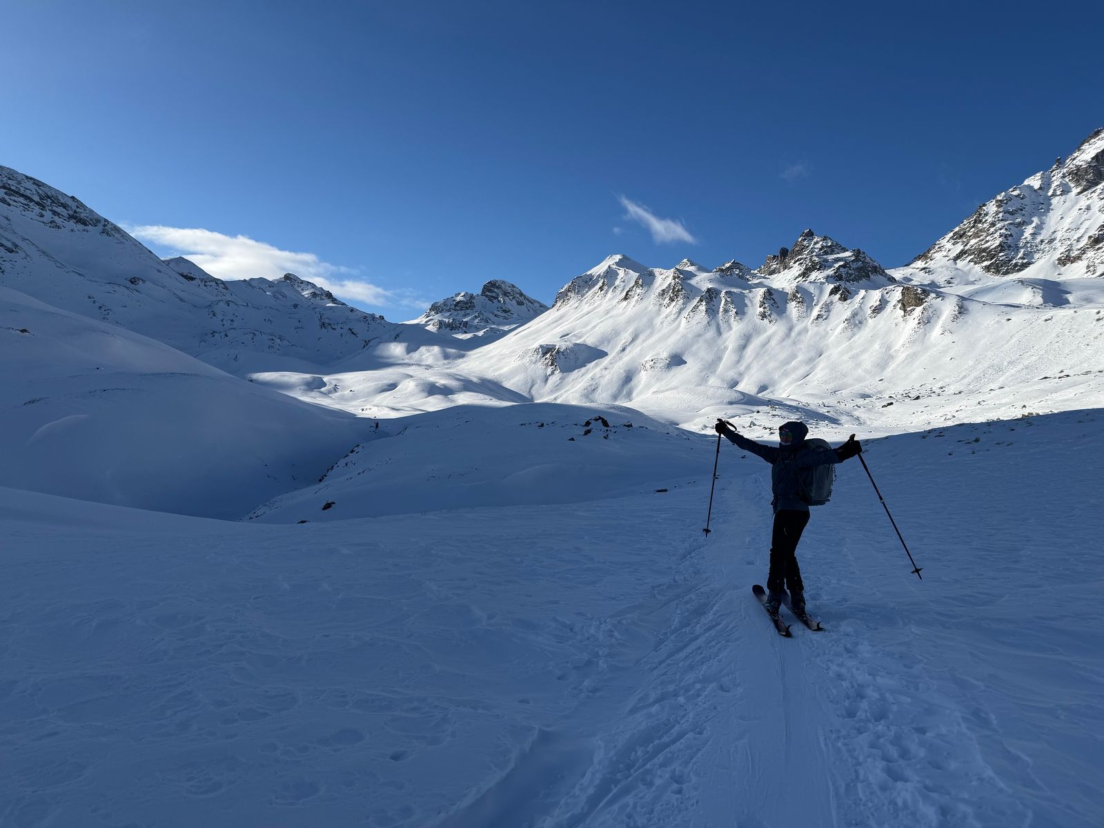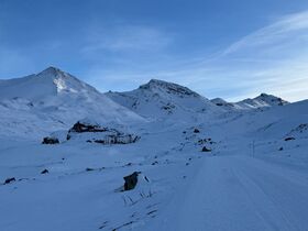 Am Donnerstag Anreise nach Ischgl und Aufstieg vom Ort aus, lange über die Skipisten, dann über die Ratracspur zur Hütte, ca. 13km und 900hm, ein echter Hatscher mit 4,5 Stunden Gehzeit...