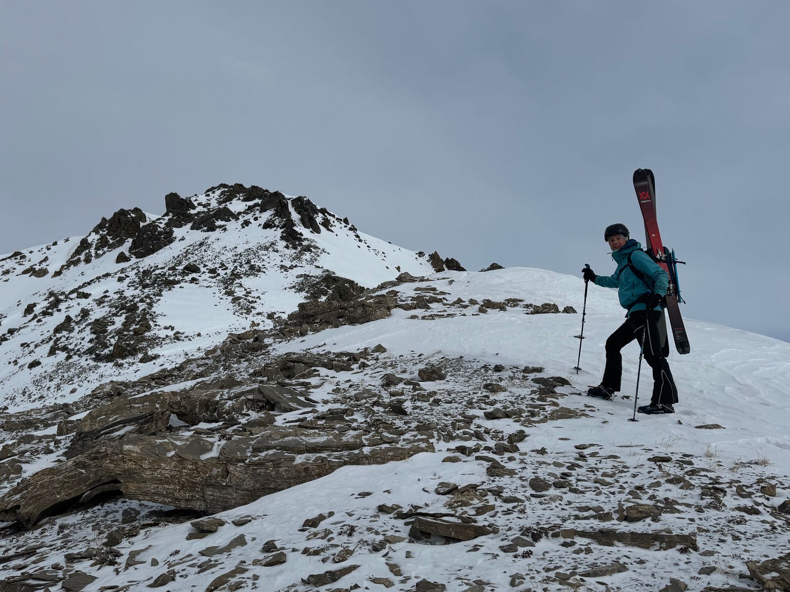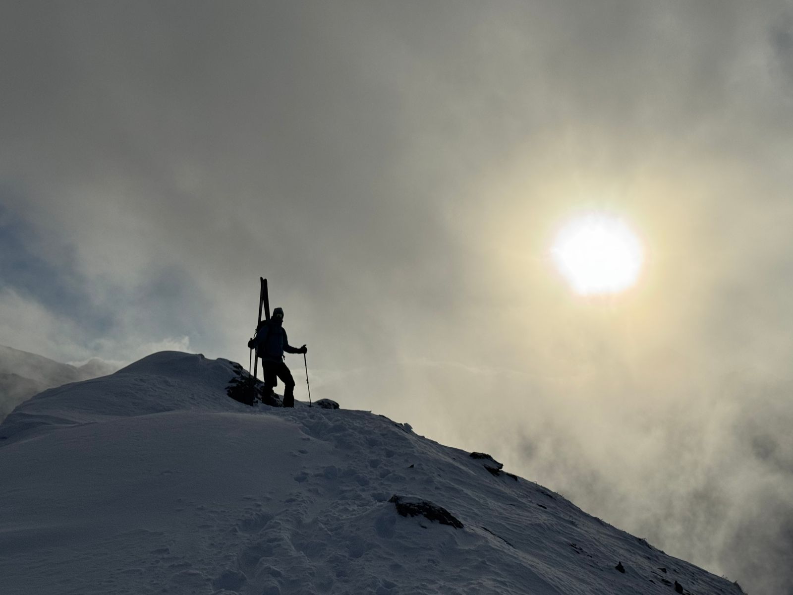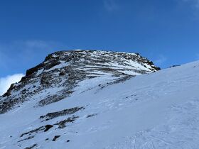 Die Schneelage ist ausreichend dort, meist recht hart, aber griffig, im Gipfelbereich abgeblasen, und zum Schluss nur noch zu Fuß hoch.