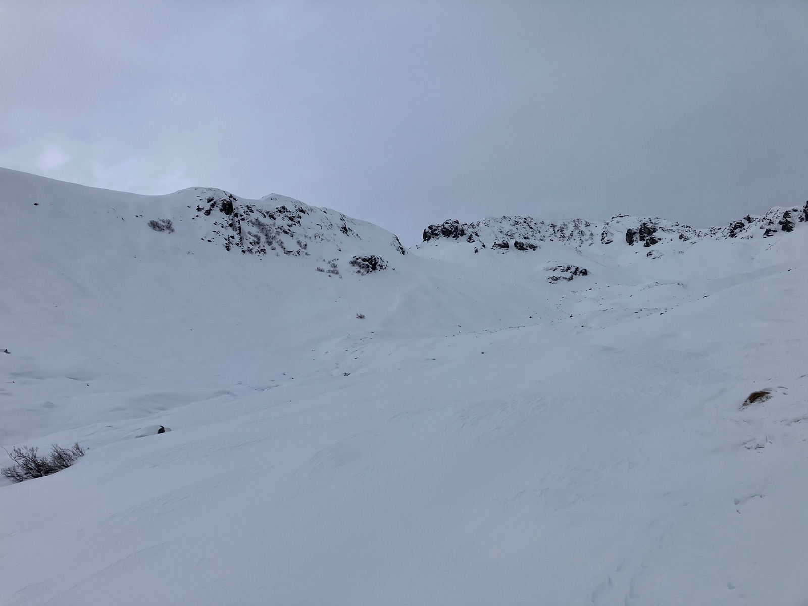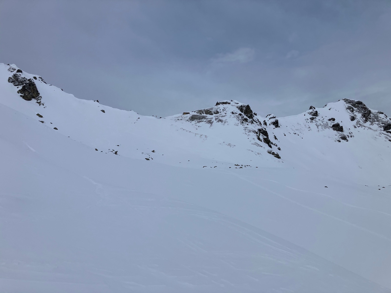 Im Kar oberhalb der Rongg-Alpe überwiegend windgepresster Schnee: