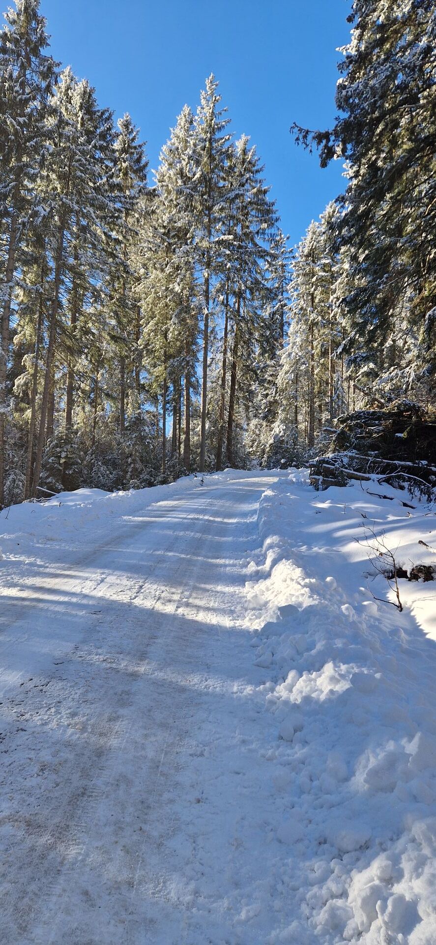 Um 9:15 Uhr erst ein Auto am PP. Forststraße unten dünn mit Schnee und Eis bedeckt, nach ca. 2/3 Waldarbeiten.