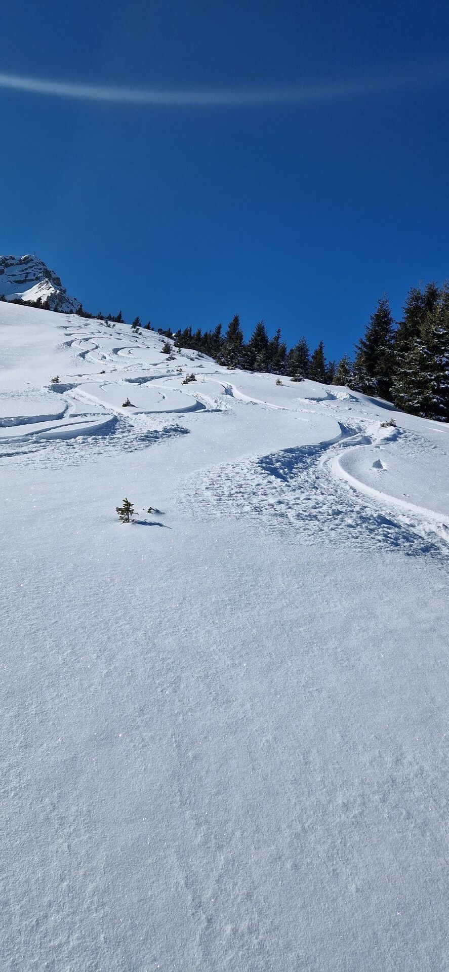 Im Wald sehr wenig Schnee, aber ohne Abschnallen gehbar. In der Sonne warm und windstill. Gipfelhang oben ausreichend Schnee, erst wenige Spuren im frischen Pulverschnee. Weitere Abfahrt im Wald abenteuerlich, keinerlei Unterlage unter ein bisschen Schnee. Nach uns kamen noch einige zum Skidepot, nach deren Abfahrt dürfte die Schneeauflage abgerutscht sein. Ab Forststraße wieder passable Verhältnisse.