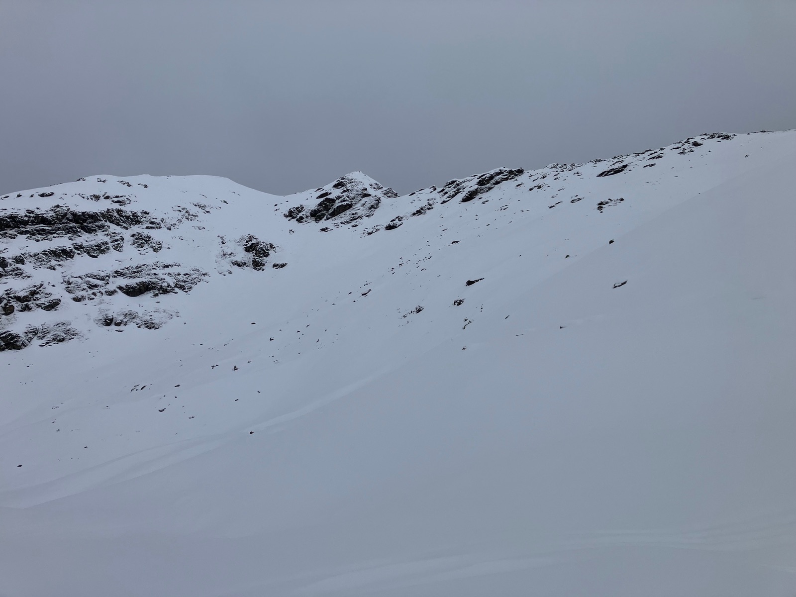 Heute habe ich mich angesichts einer angespannten Lawinenlage insbesondere in allen Hängen außer Süd mal trotz grundsätzlicher Schneearmut an eine rein südseitige Tour gemacht: Die Heimspitze über das Vergaldental. Nach dem Neuschnee war ab der Vergalden-Alpe alles zu spuren - ich habe mich dabei immer ungefähr an den Sommerweg gehalten. Der Schnee reicht hier meistens gut. Normalerweise wird zur Heimspitze auf ca. 2.300 m vom Sommersteig abgewichen und in steiles Gelände gequert, wo es dann ca. 200 Hm ebenfalls ziemlich steil hochgeht. Trotz Südexposition war mir das schon in der Vorbereitung zu heikel und auch vor Ort nicht genehm. Der Plan war daher, am Kamm / Grat dieses steile Stück zu Fuß zu umgehen. Allerdings wird der Grat entgegen der Darstellung in der Österreichischen Landkarte kurz sehr eingeschnürt / felsig und bei einer Kraxelstelle min. UIAA II war mir das ohne Steigeisen zu heikel. Also als Alternativziel auf das Heimbüheljoch (kein Joch, sondern ein Gipfelchen). Dahin geht es mit Skiern.