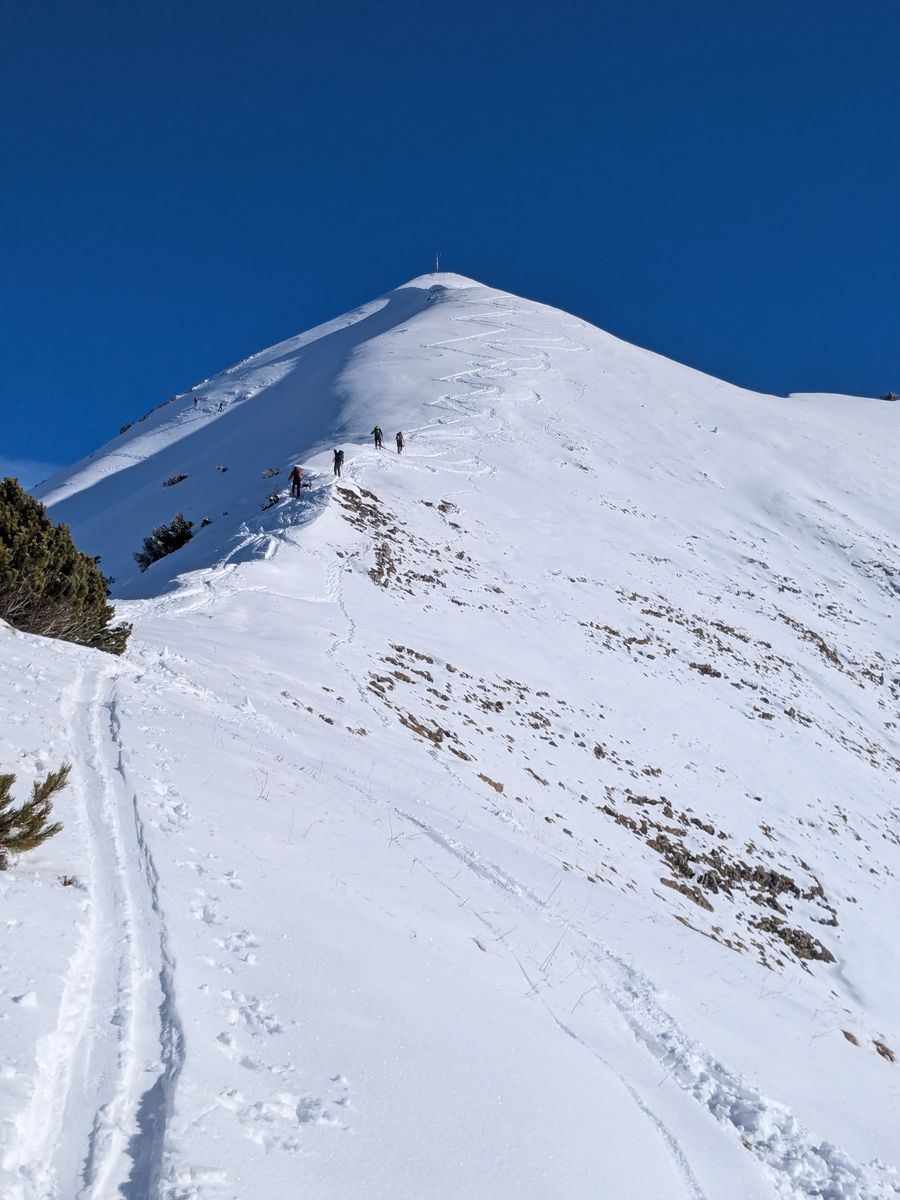 Gestern waren die Schneebedingungen unterschiedlich: 20-30 cm Neuschnee im Tal, weniger im Wald, danach lokal sehr tiefer Neuschnee oder fast aper wie am Gipfelrücken (abgeblasen, siehe Bild).