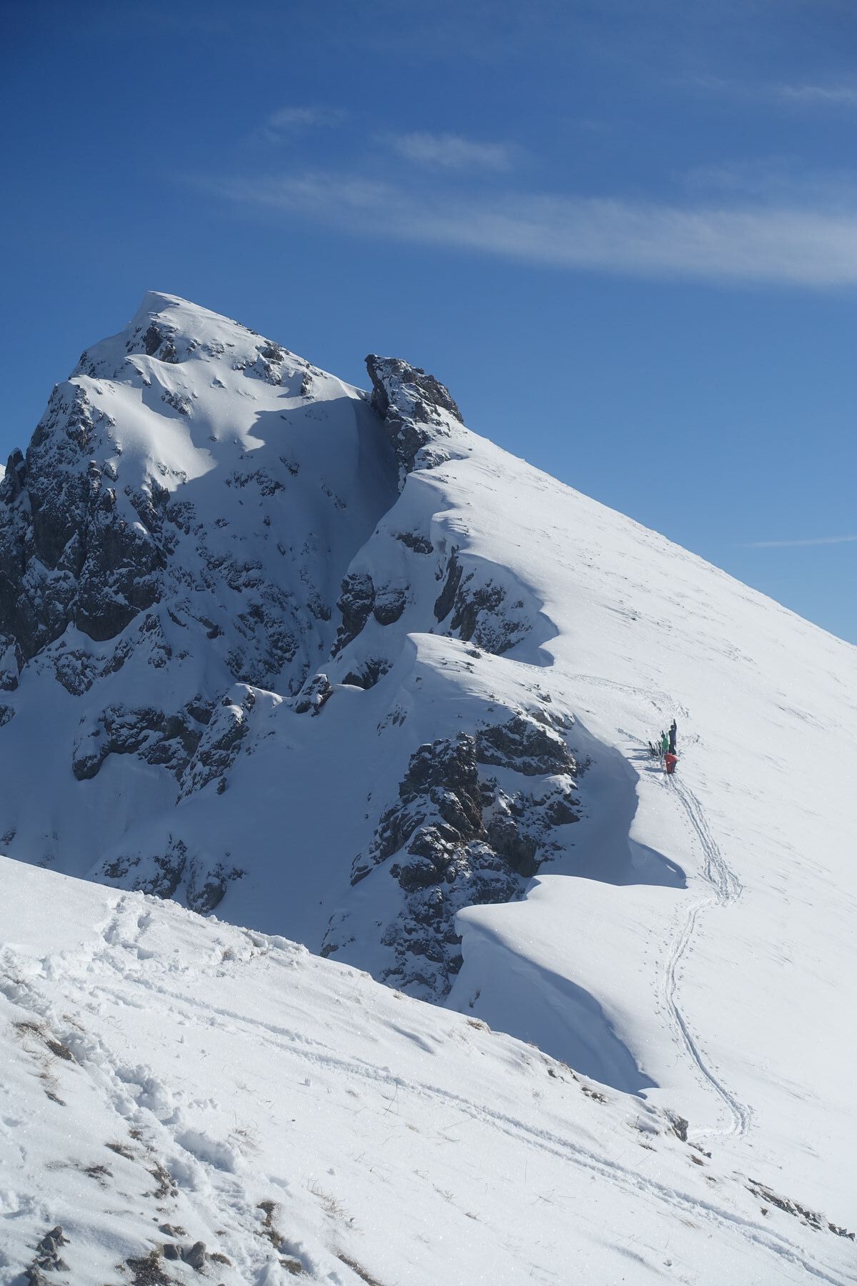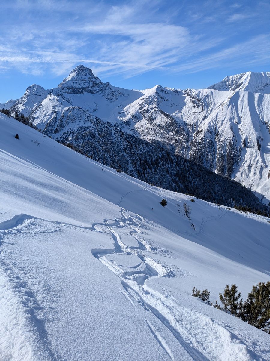 Um den schneearmen Rücken bei der Abfahrt zu vermeiden, habe ich in den Nordhang abgebogen, wo schon ein paar Abfahrtspuren waren. Dort lag ziemlich viel Pulver (Bilder)! Meiner Meinung nach musste man aber aufpassen, nicht die steilsten Hänge zu queren. Wenn ich mich gut erinnere, gab es in der Vergangenheit schon Lawinenunfälle in diesem Bereich.